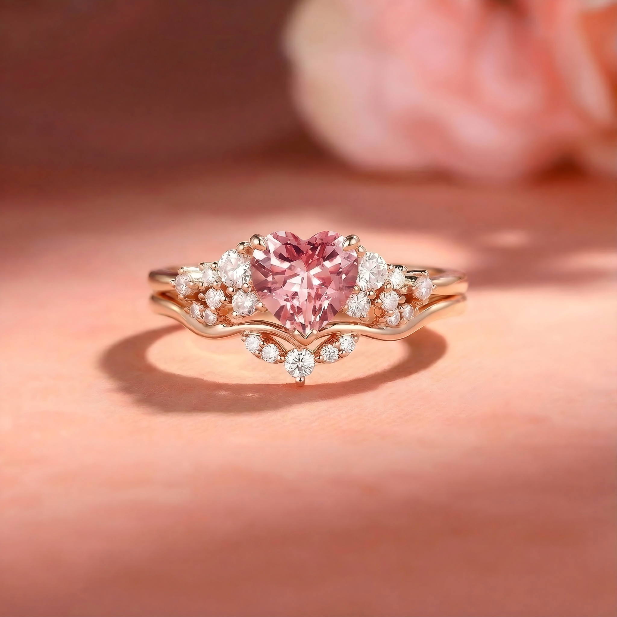 Heart Shaped Lab Pink Sapphire Engagement Ring Set 2pcs - Coravis