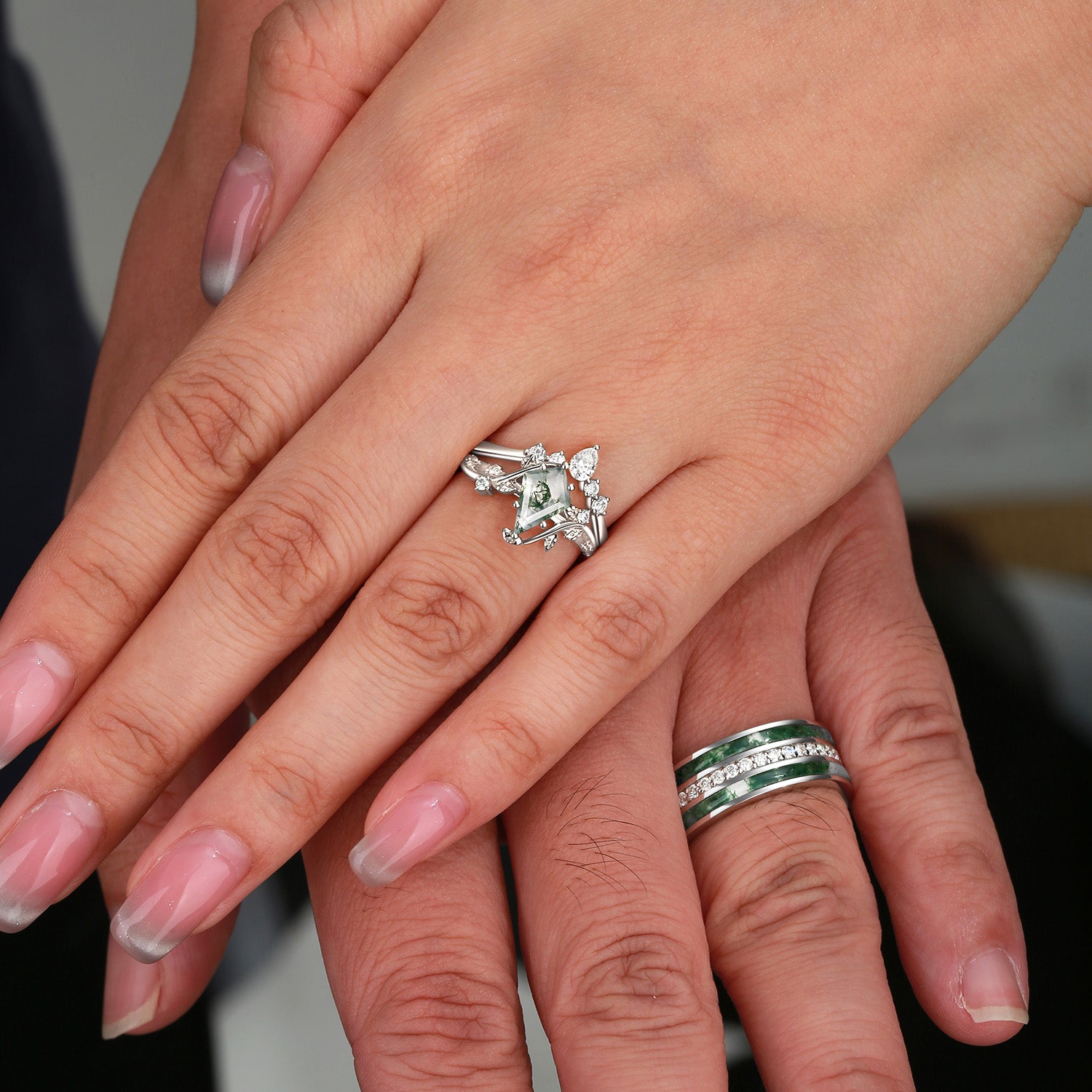 Nature Inspired - Moss Agate & Teal Sapphire Leafy Couple Ring Set 3pcs - Willow