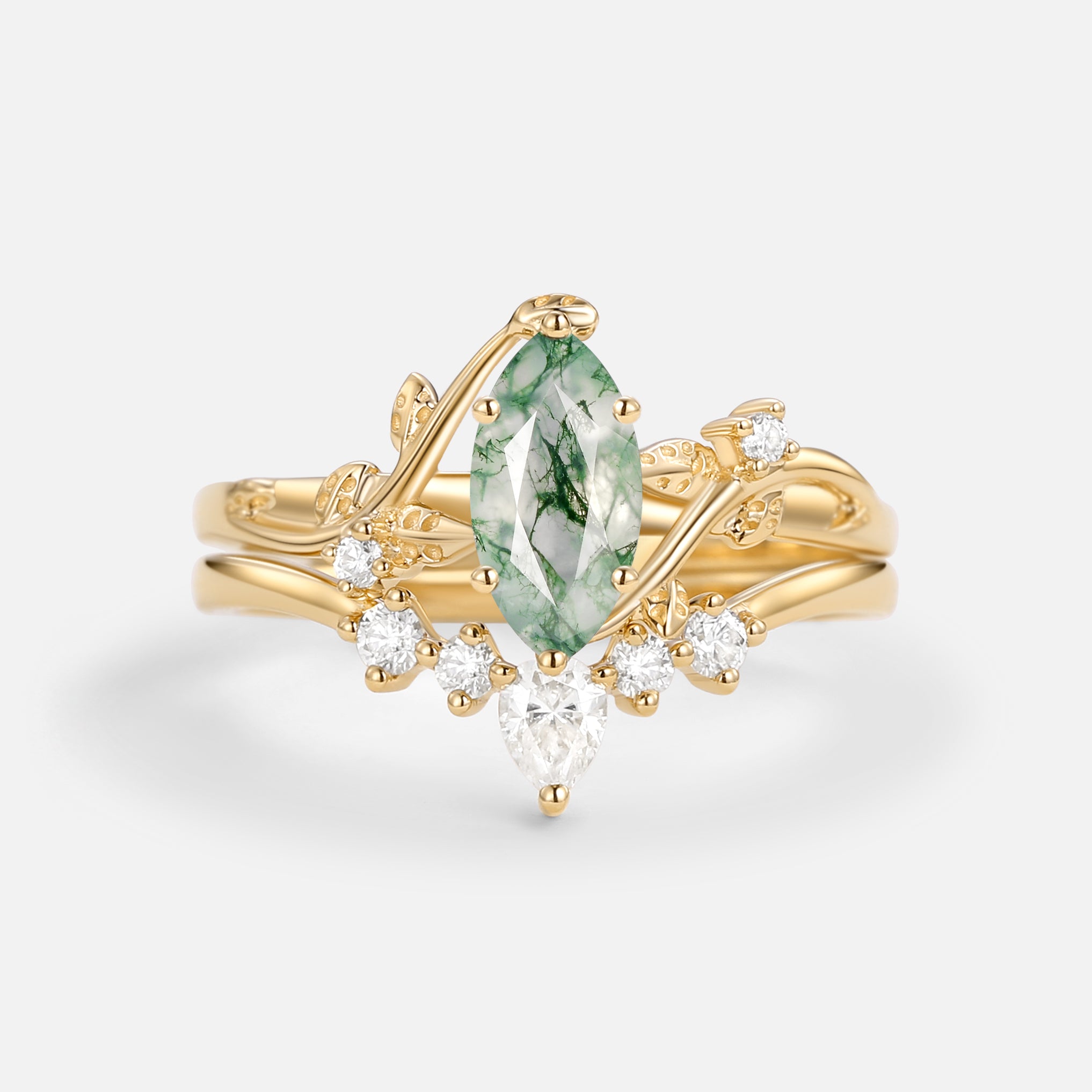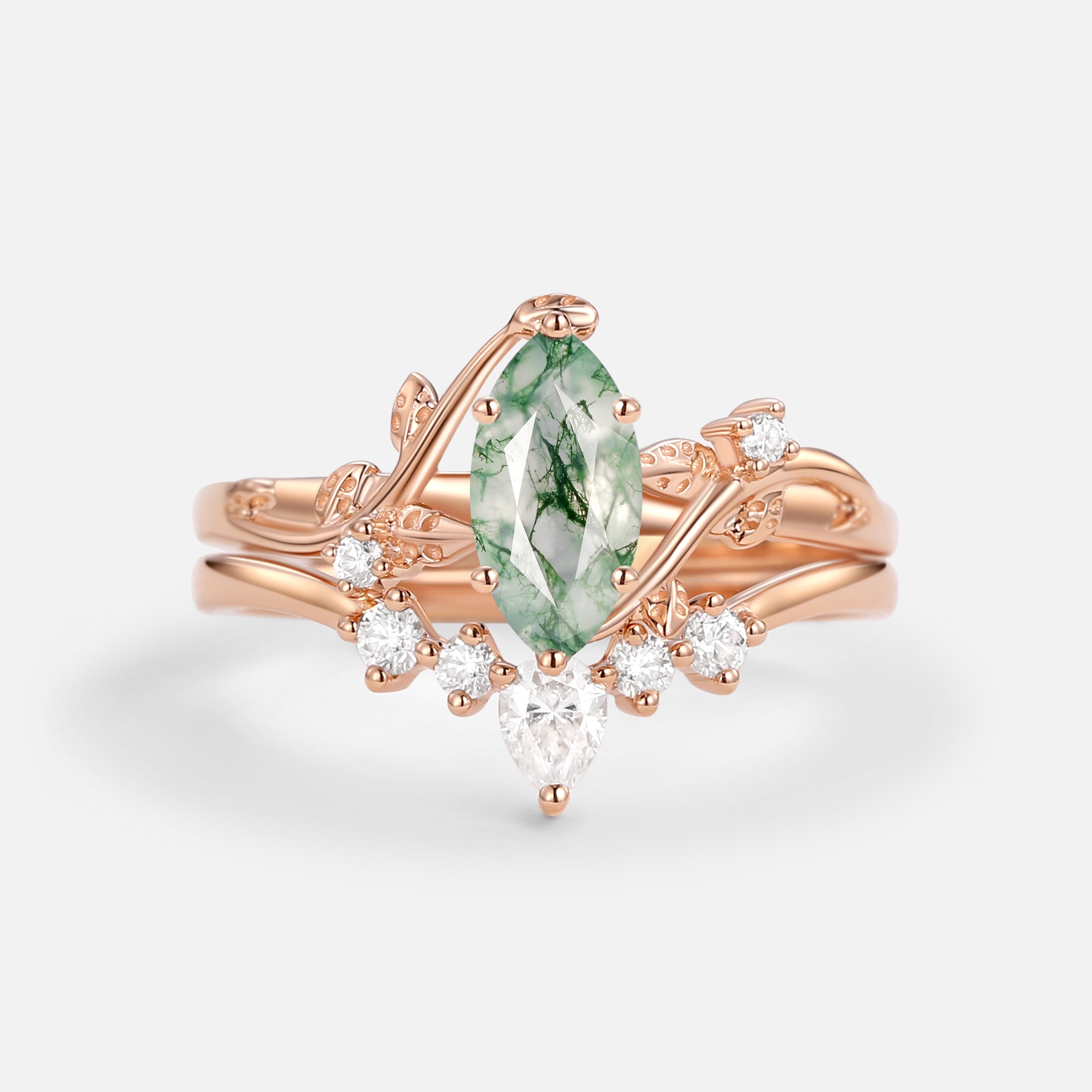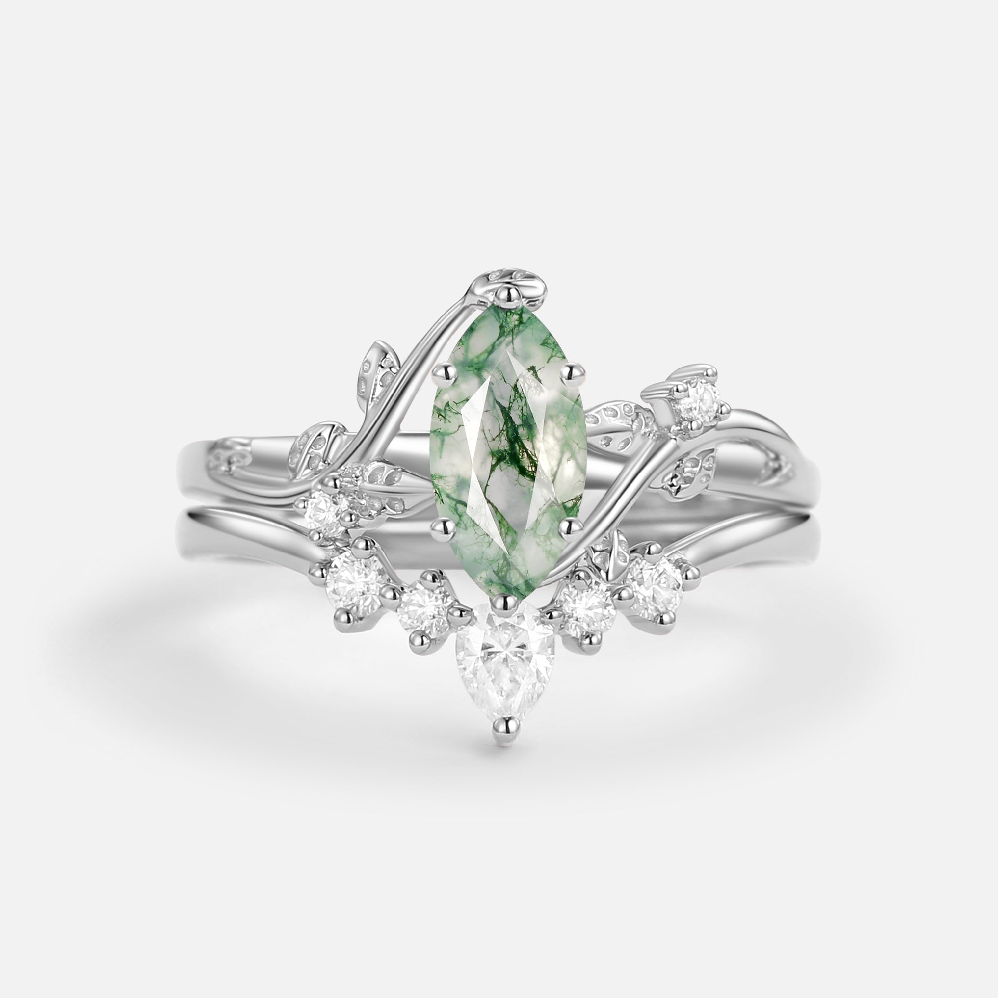 Unique Marquise Cut Moss Agate Leafy Bridal Ring Sets 2pcs - Willow