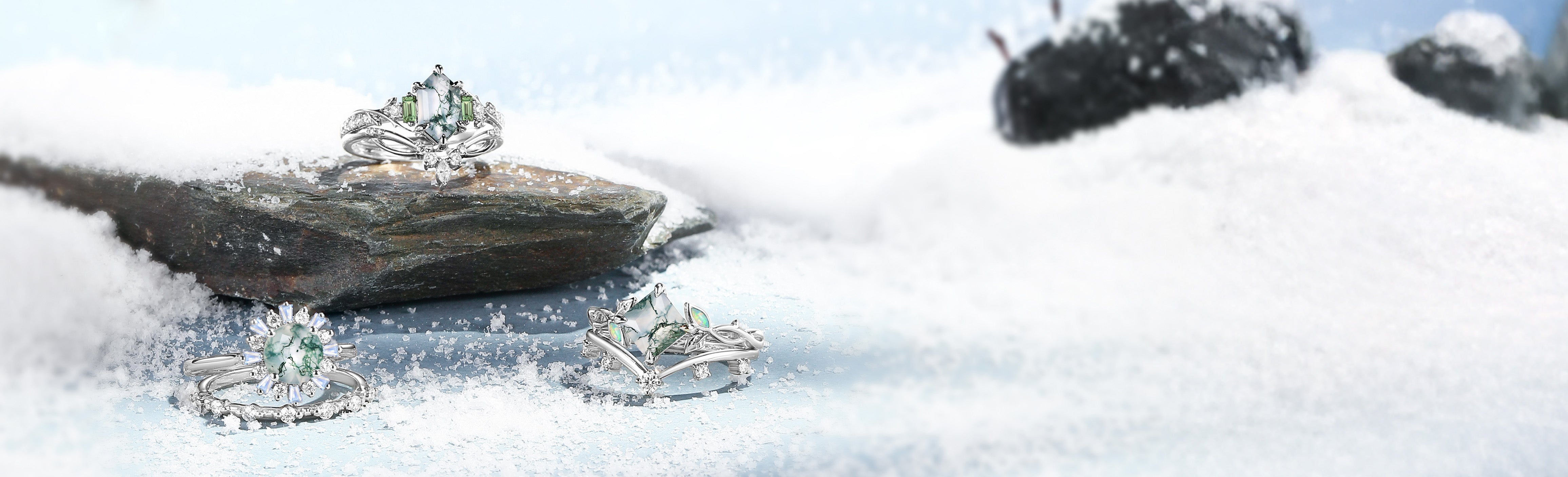 Inspired by still winter branches, this collection centers on cool green moss agate, clear and serene as frost. The band’s clean lines and subtle texture embody a resilient, elegant calm. This ring is for shared quiet—for moments when the world slows and warmth is found in presence, not words. It carries a steady, unspoken strength, a reminder that even in stillness, you are deeply held.