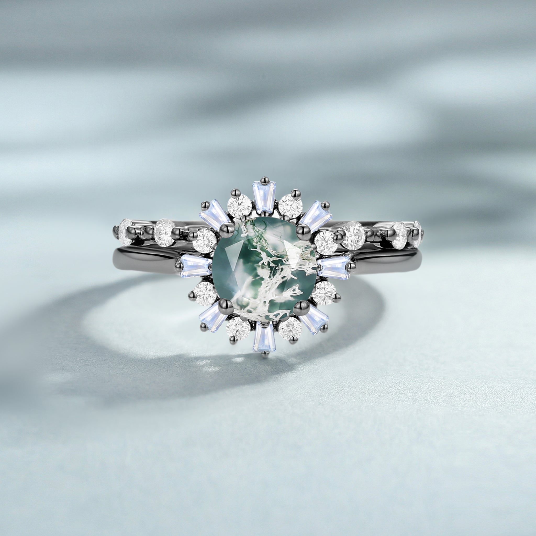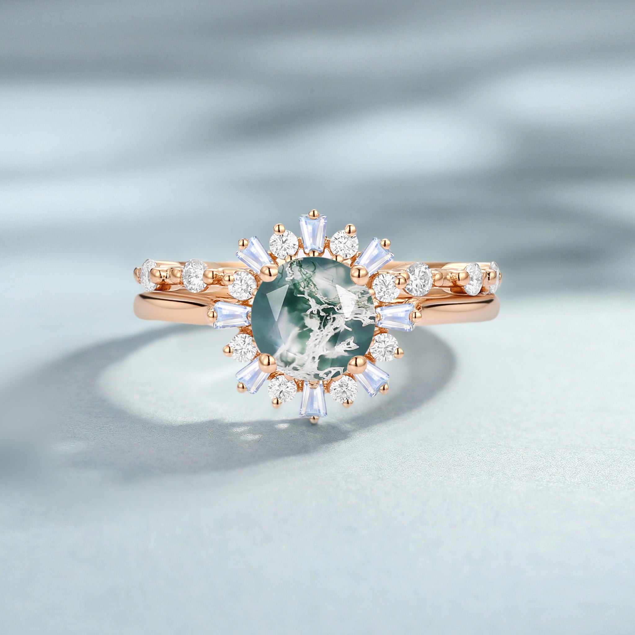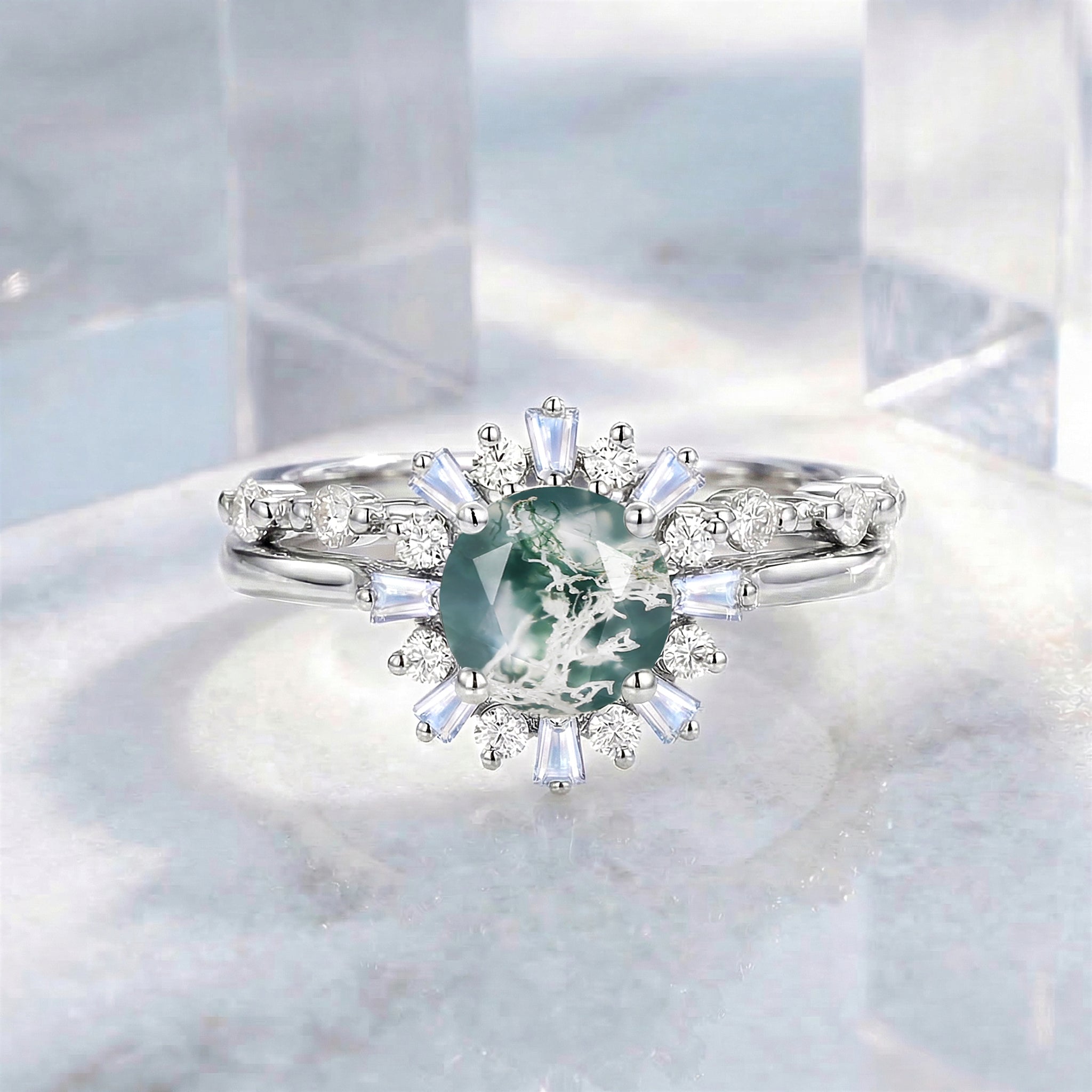 Round Cut Moss Agate Engagement Ring Set 2pcs - Sol