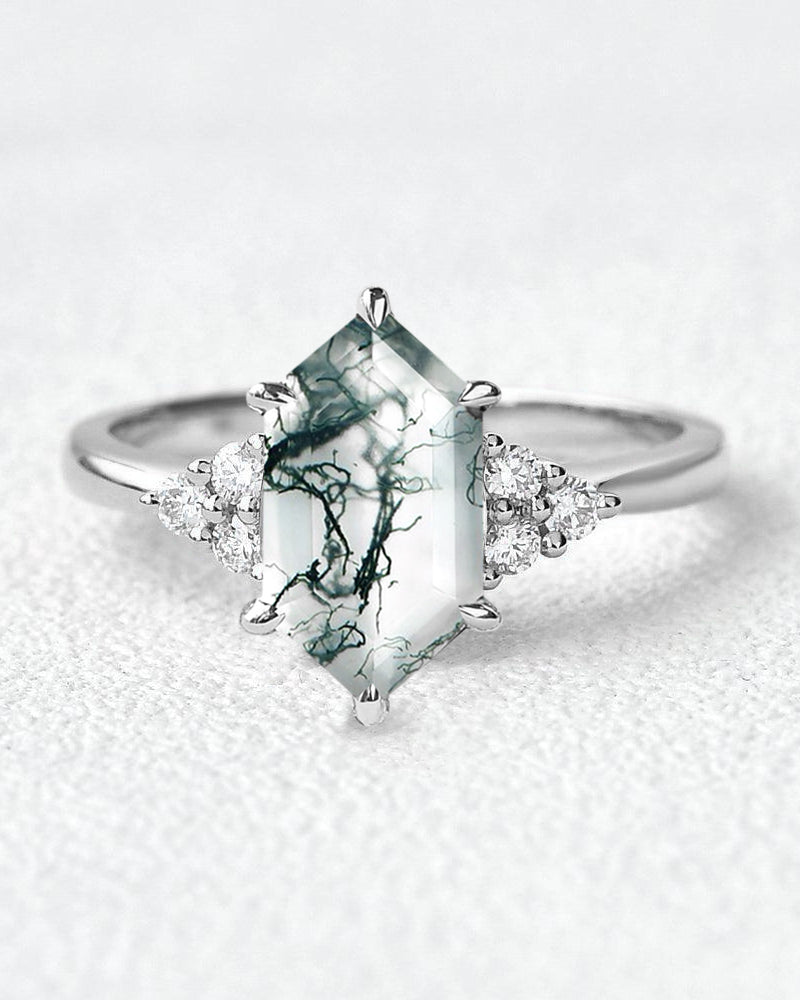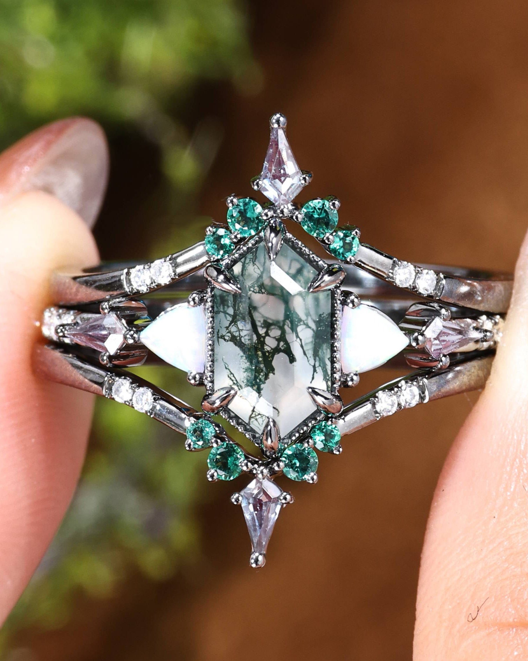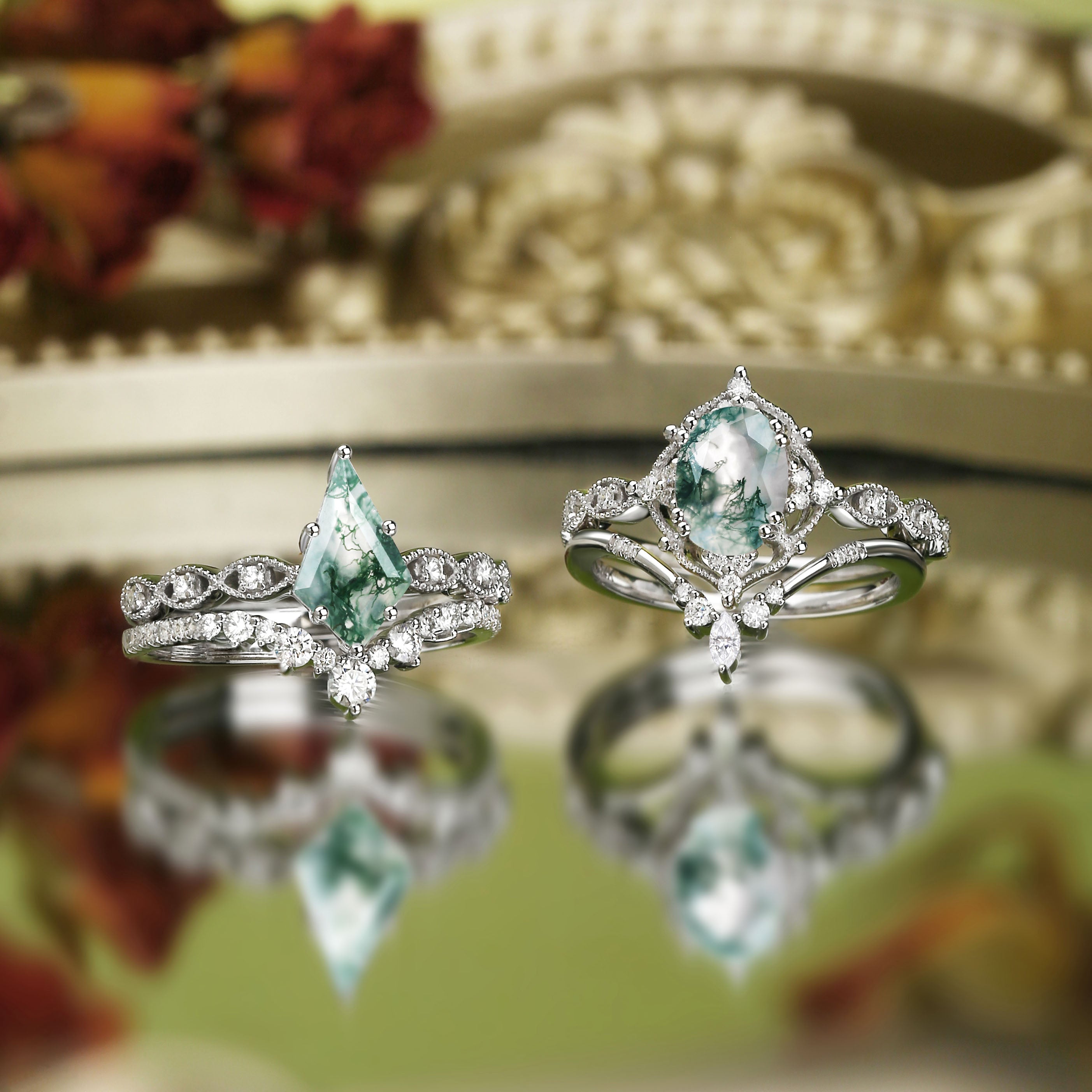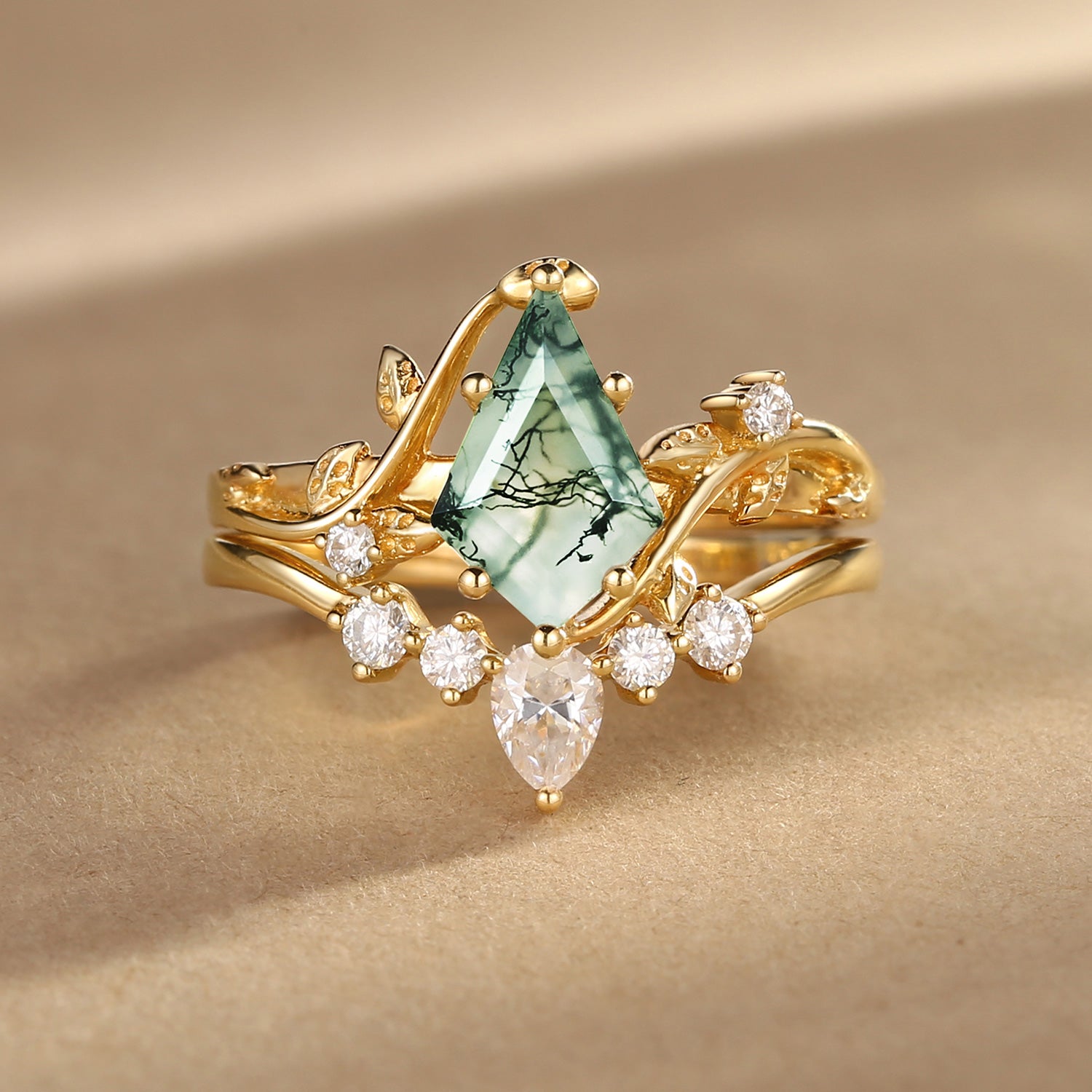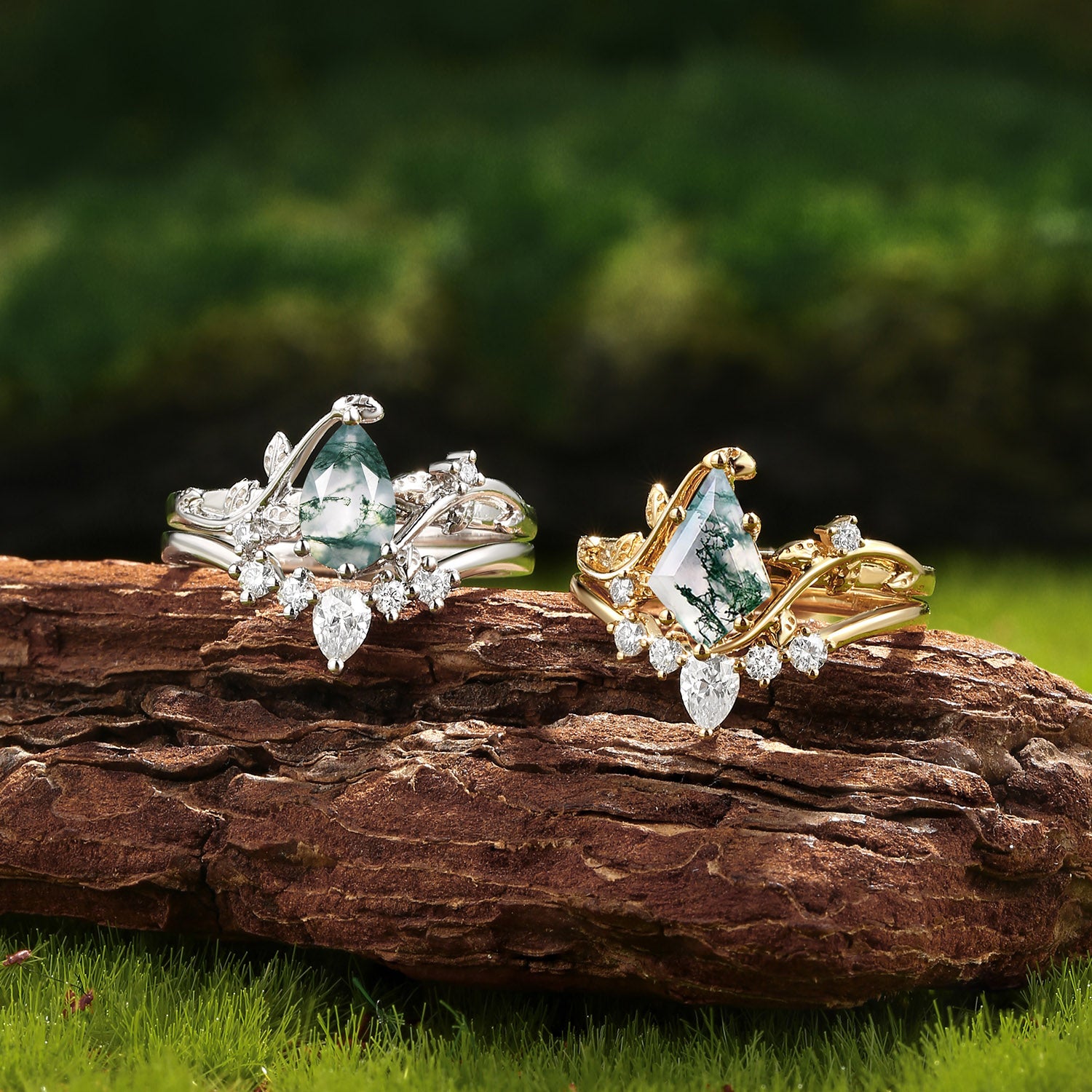 Nature Inspired - Unique Kite Cut Moss Agate Leafy Bridal Ring Sets 2pcs - Willow