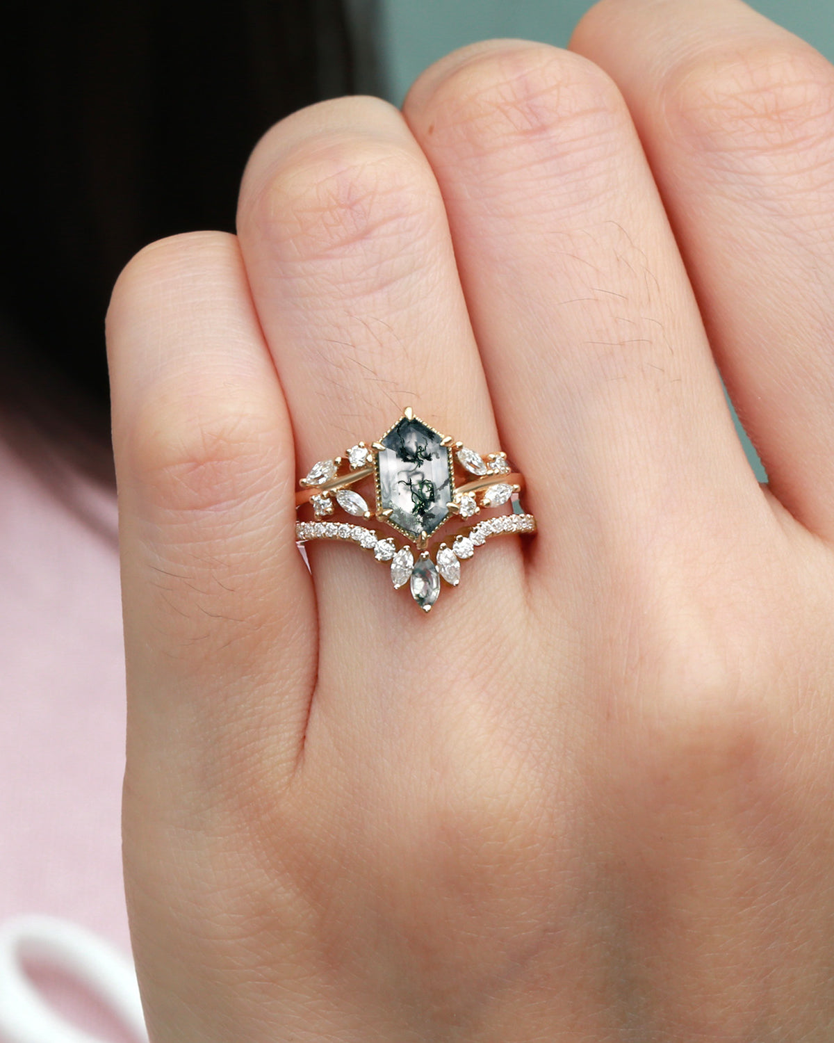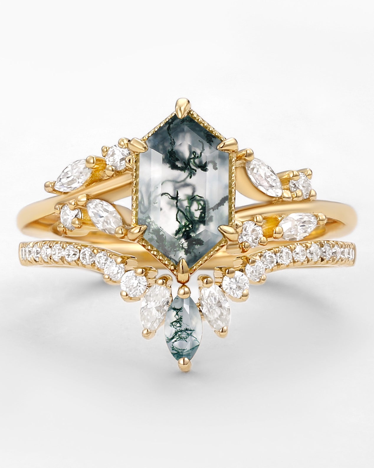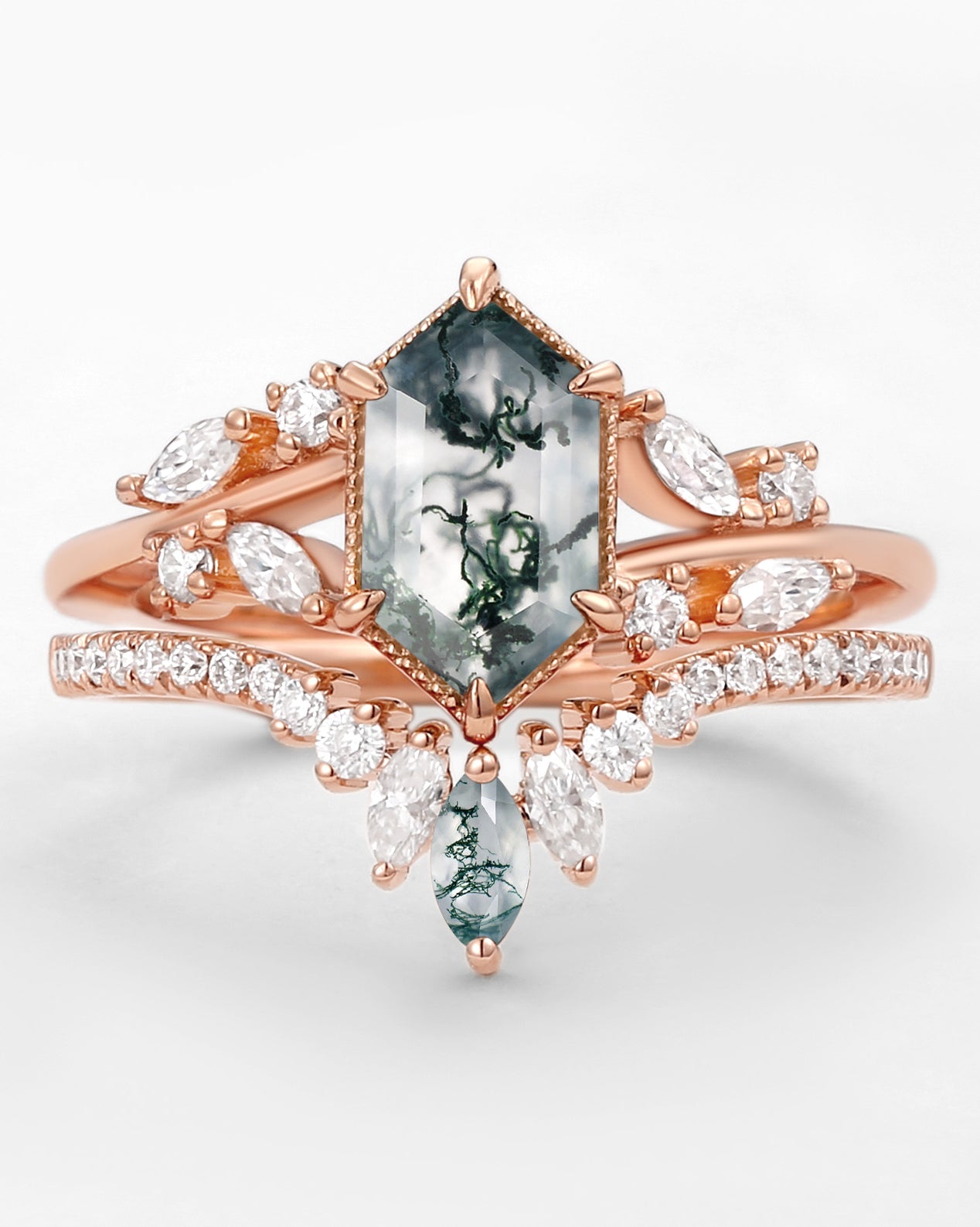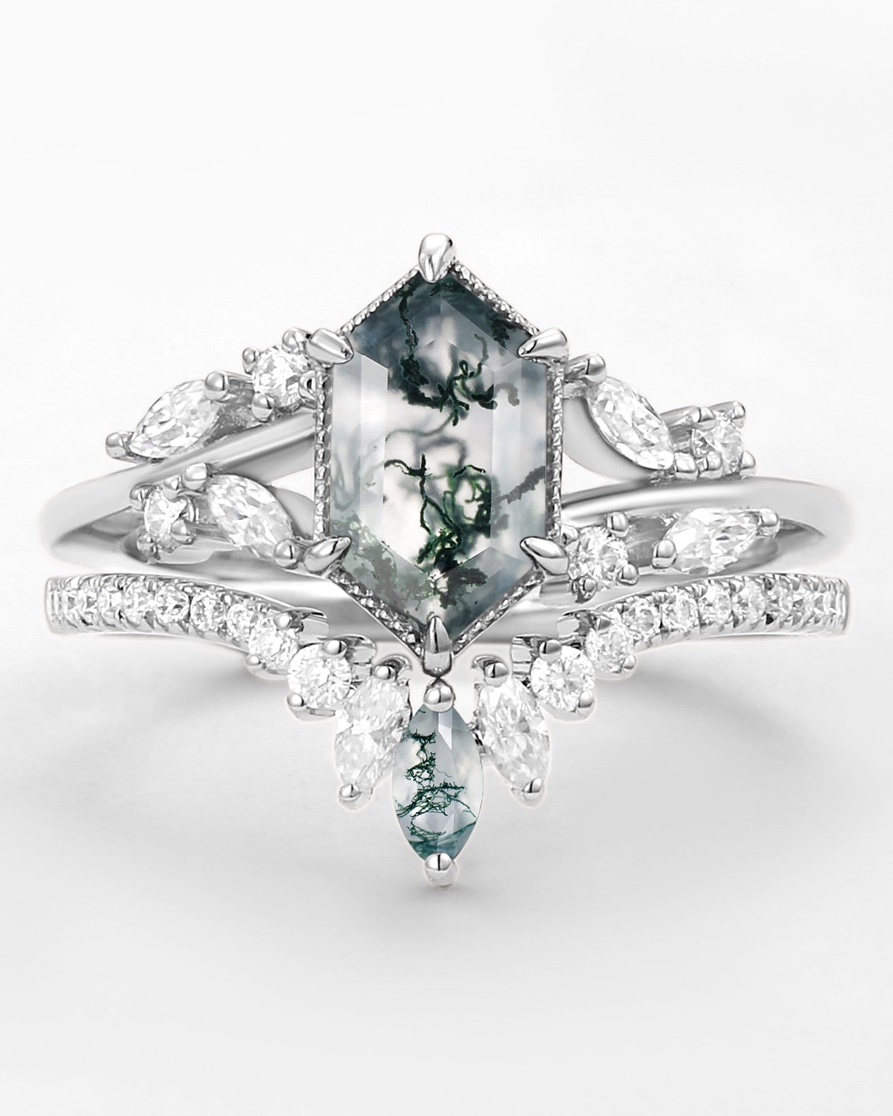 Nature Inspired - Unique Kite Cut Moss Agate Leafy Bridal Ring Sets 2pcs - Willow