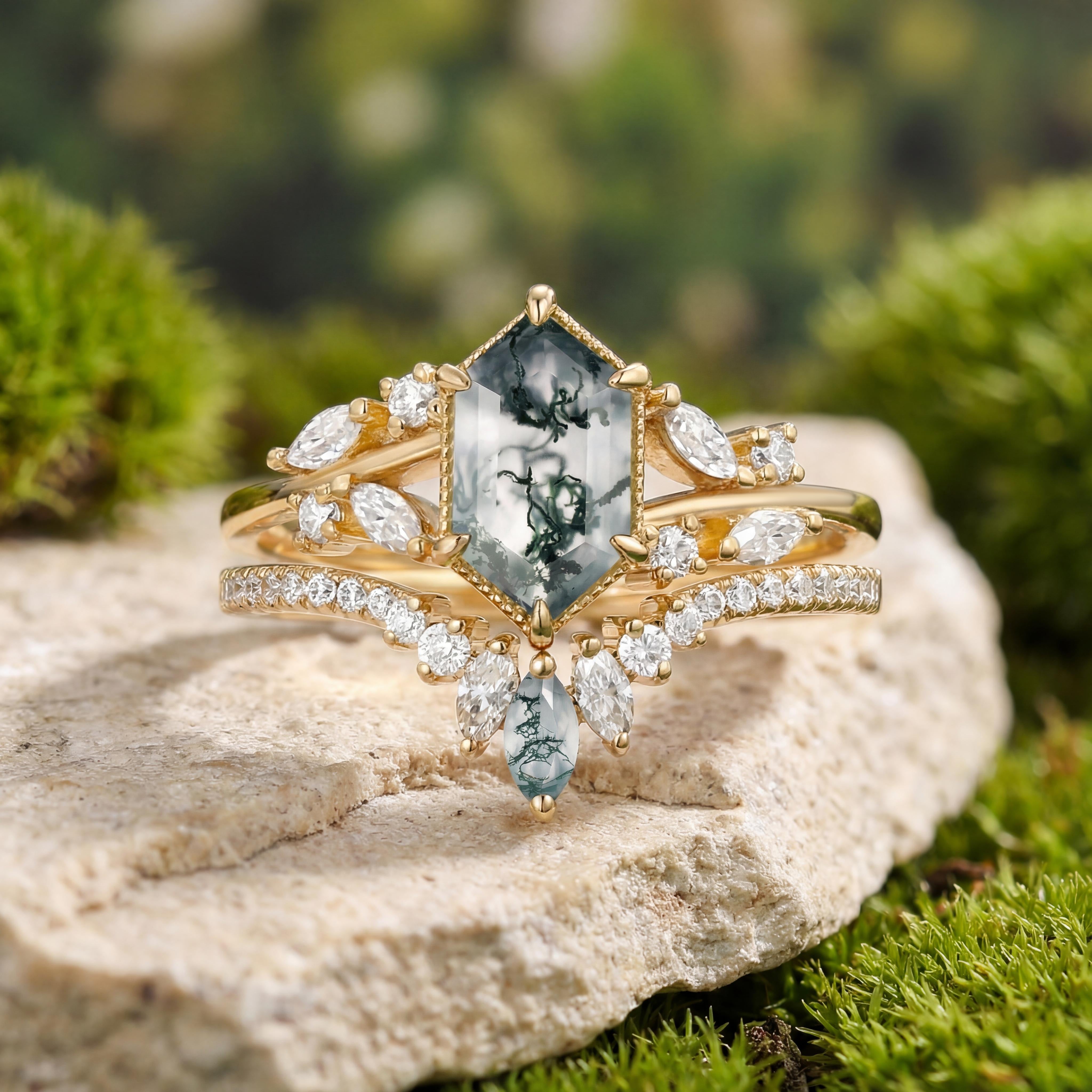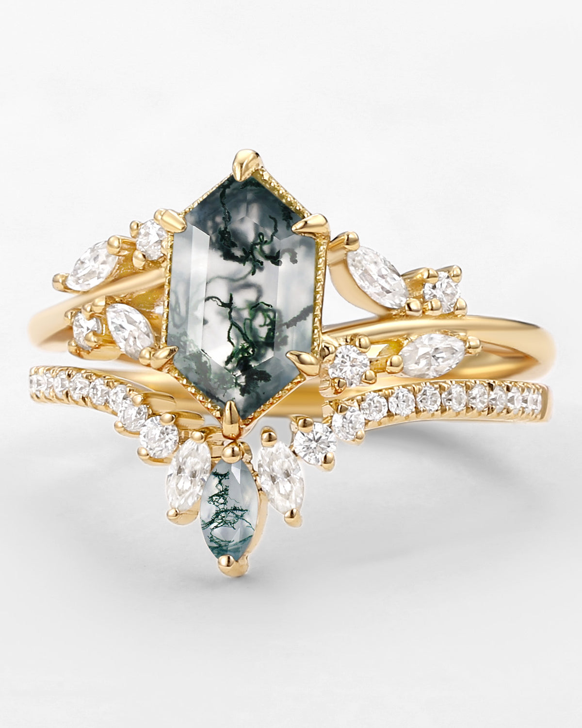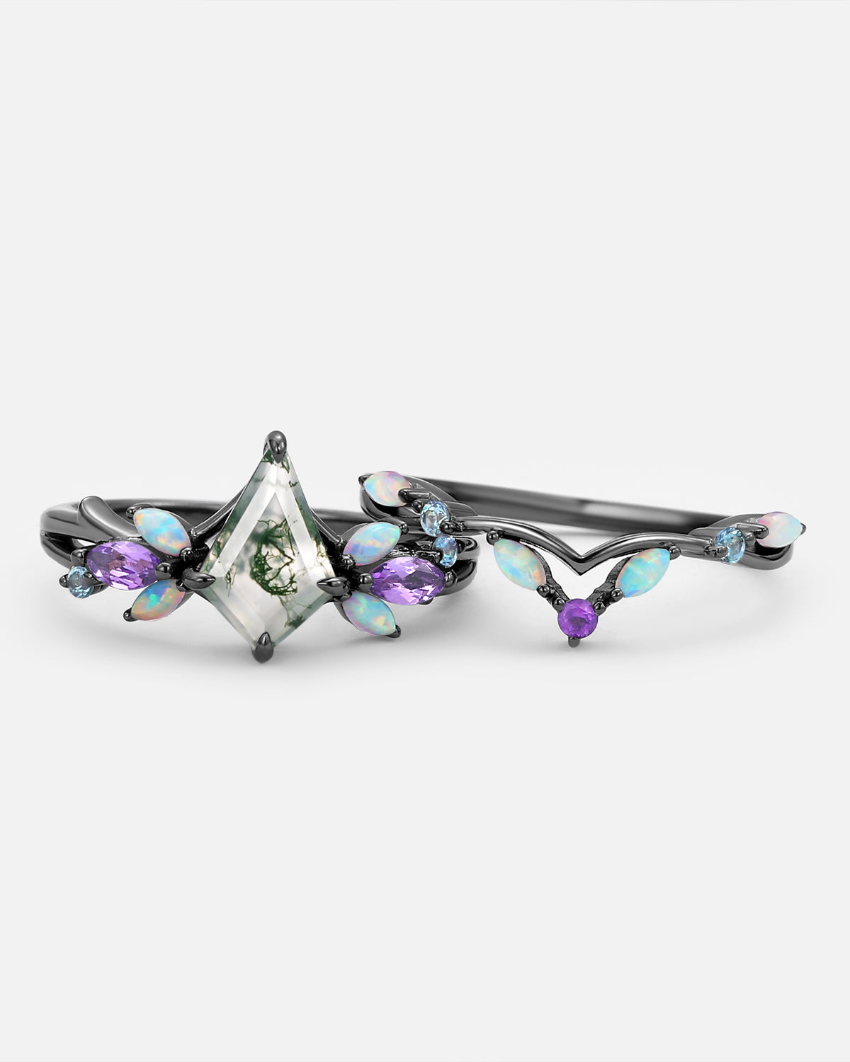 Nature Inspired - Unique Kite Cut Moss Agate Leafy Bridal Ring Sets 2pcs - Willow