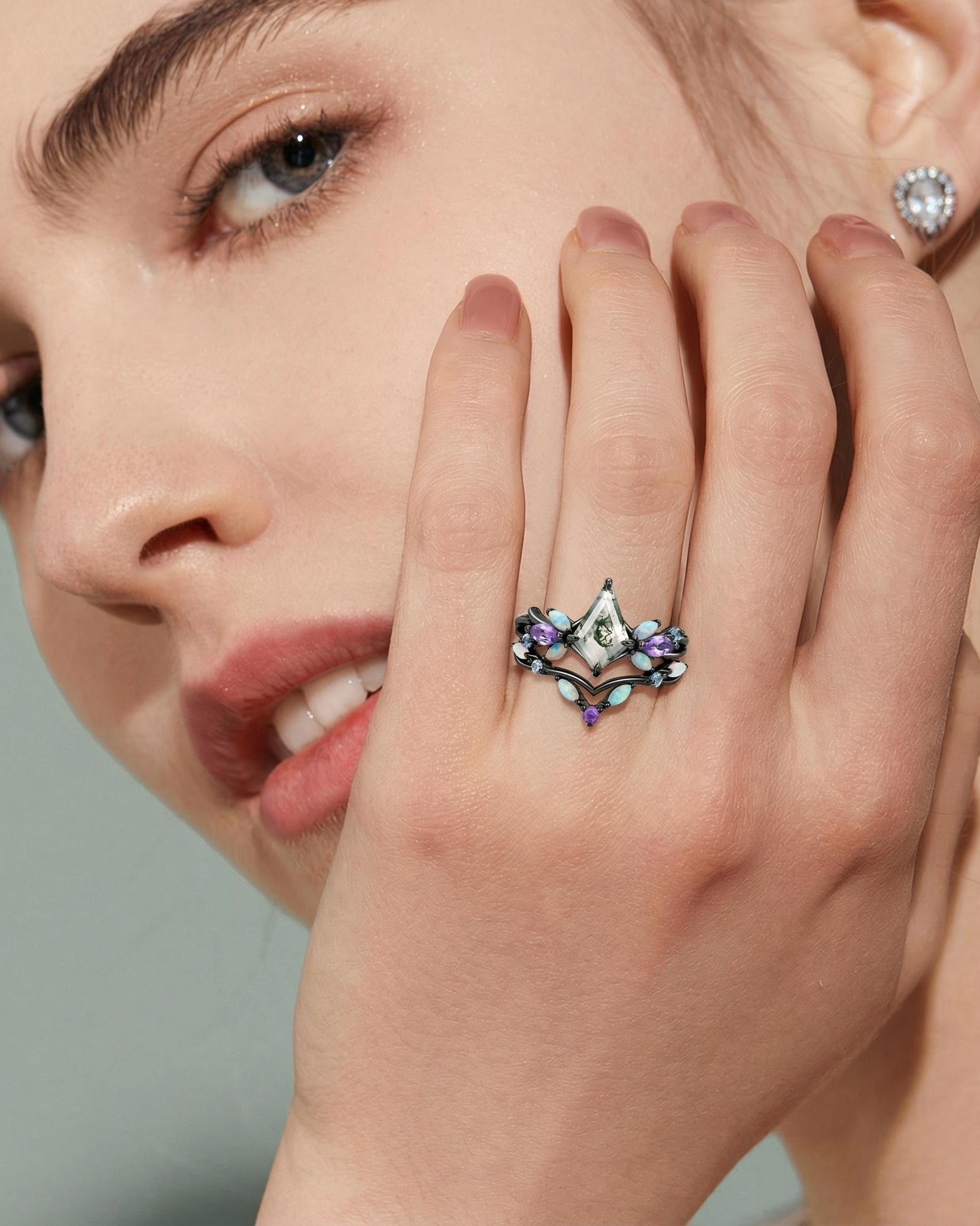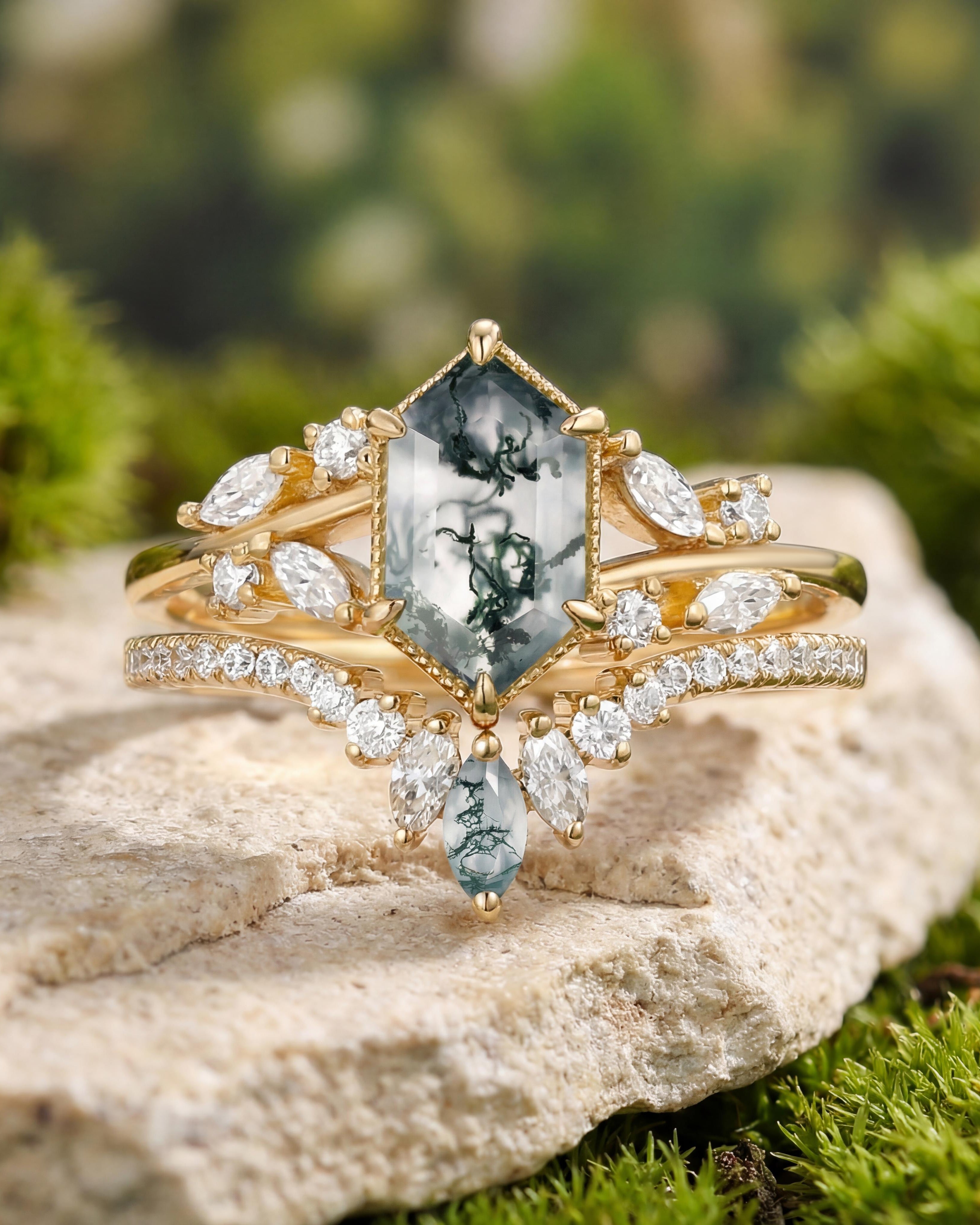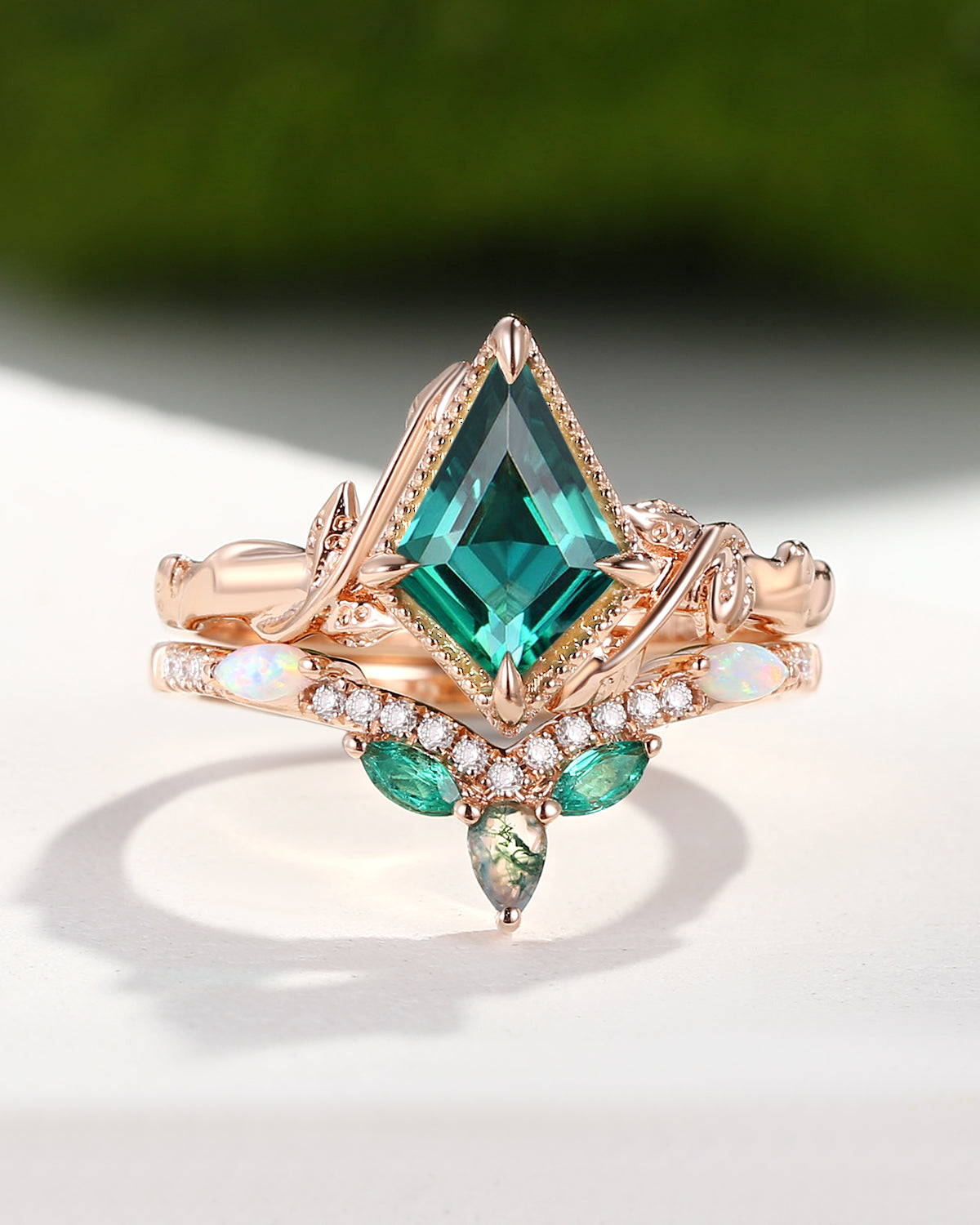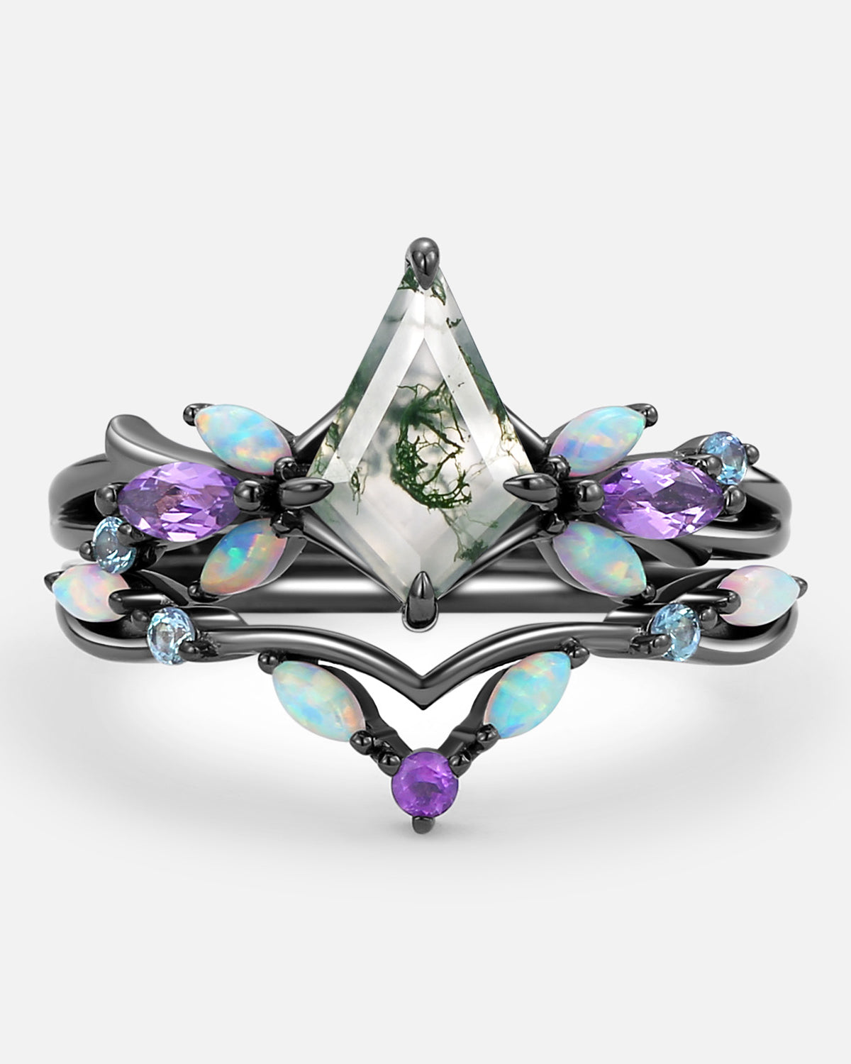 Nature Inspired - Unique Kite Cut Moss Agate Leafy Bridal Ring Sets 2pcs - Willow