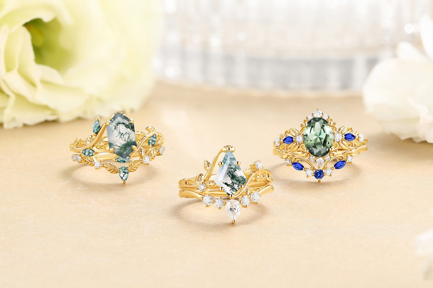 Fairy Ring - Moss Agate Leafy Forest Elves Engagement Ring Set 2pcs - Amayah