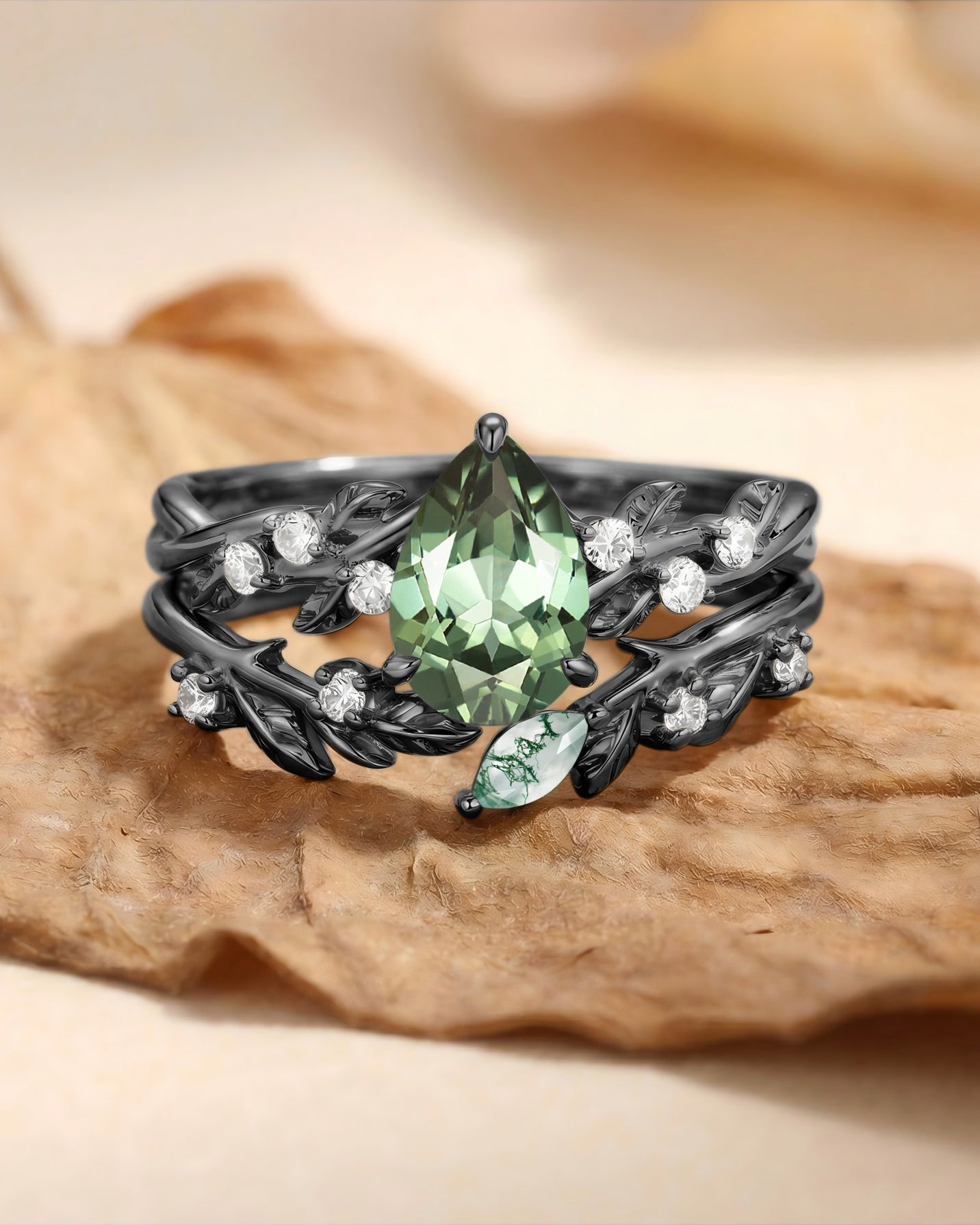 Nature Inspired - Moss Agate & Teal Sapphire Leafy Couple Ring Set 3pcs - Willow