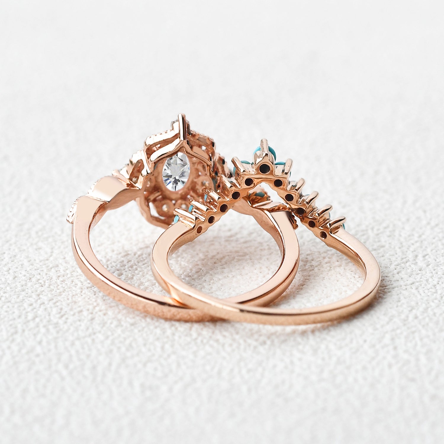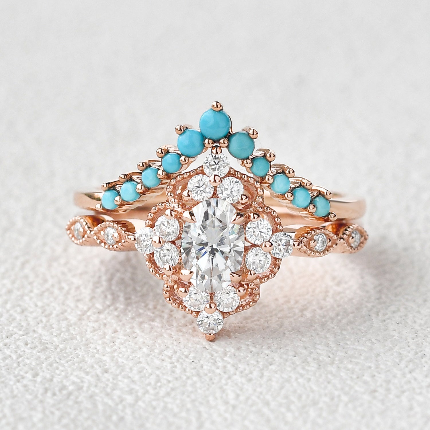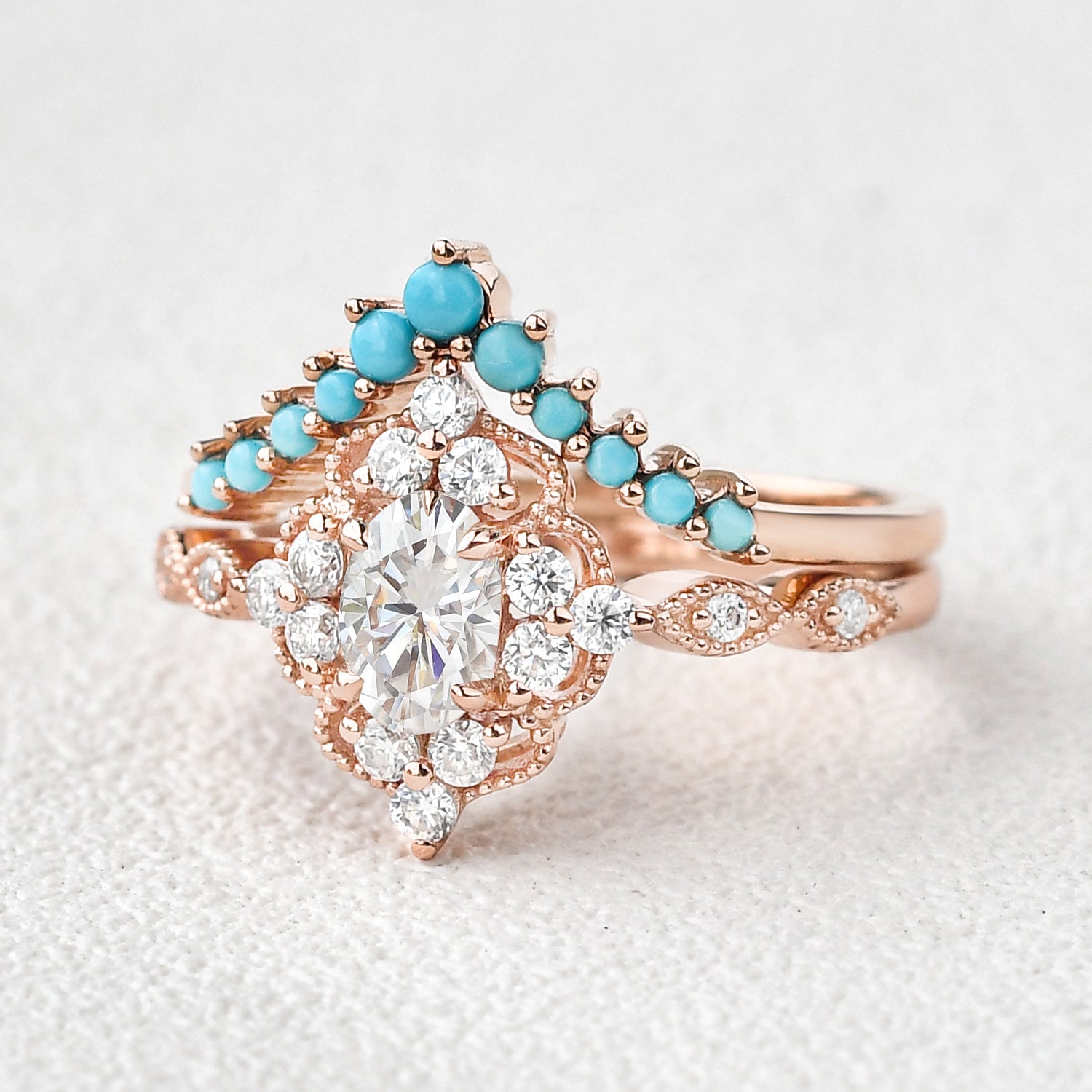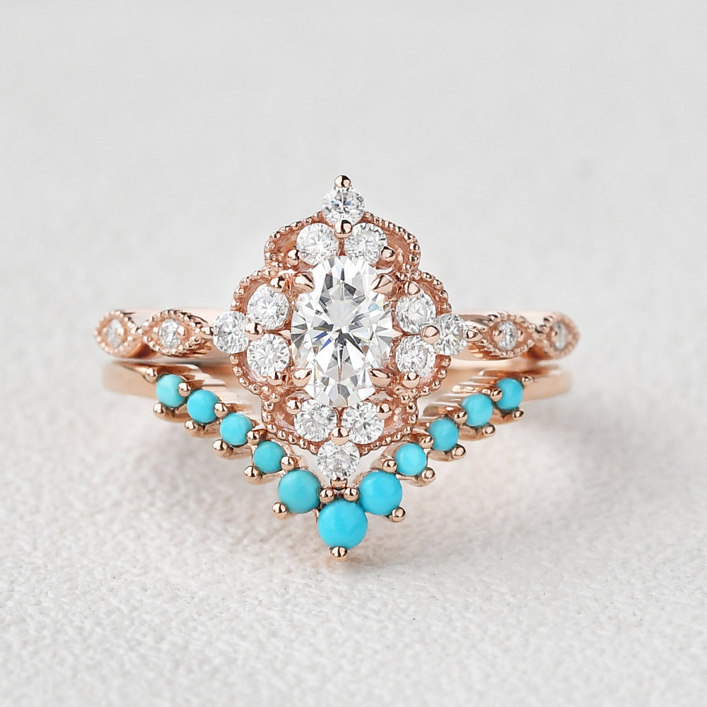 Felicegals Moissanite & Moissanite Vintage Inspired Engagement Ring Set 2pcs Chevron Turquoise Vintage Inspired Rose Gold Ring Art Deco Bridal