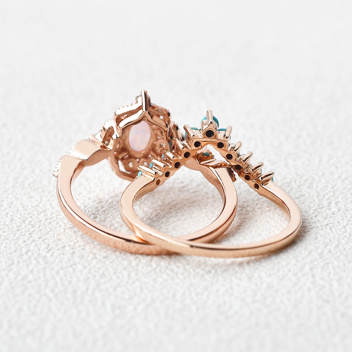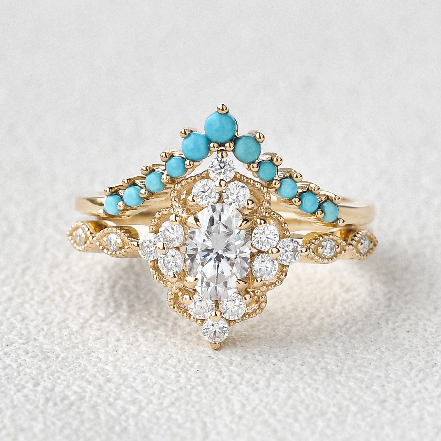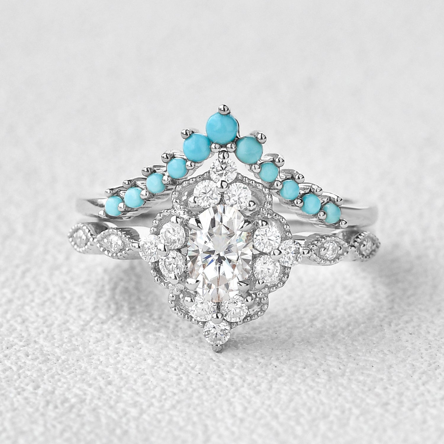 Felicegals Moissanite & Moissanite Vintage Inspired Engagement Ring Set 2pcs Chevron Turquoise Vintage Inspired Rose Gold Ring Art Deco Bridal