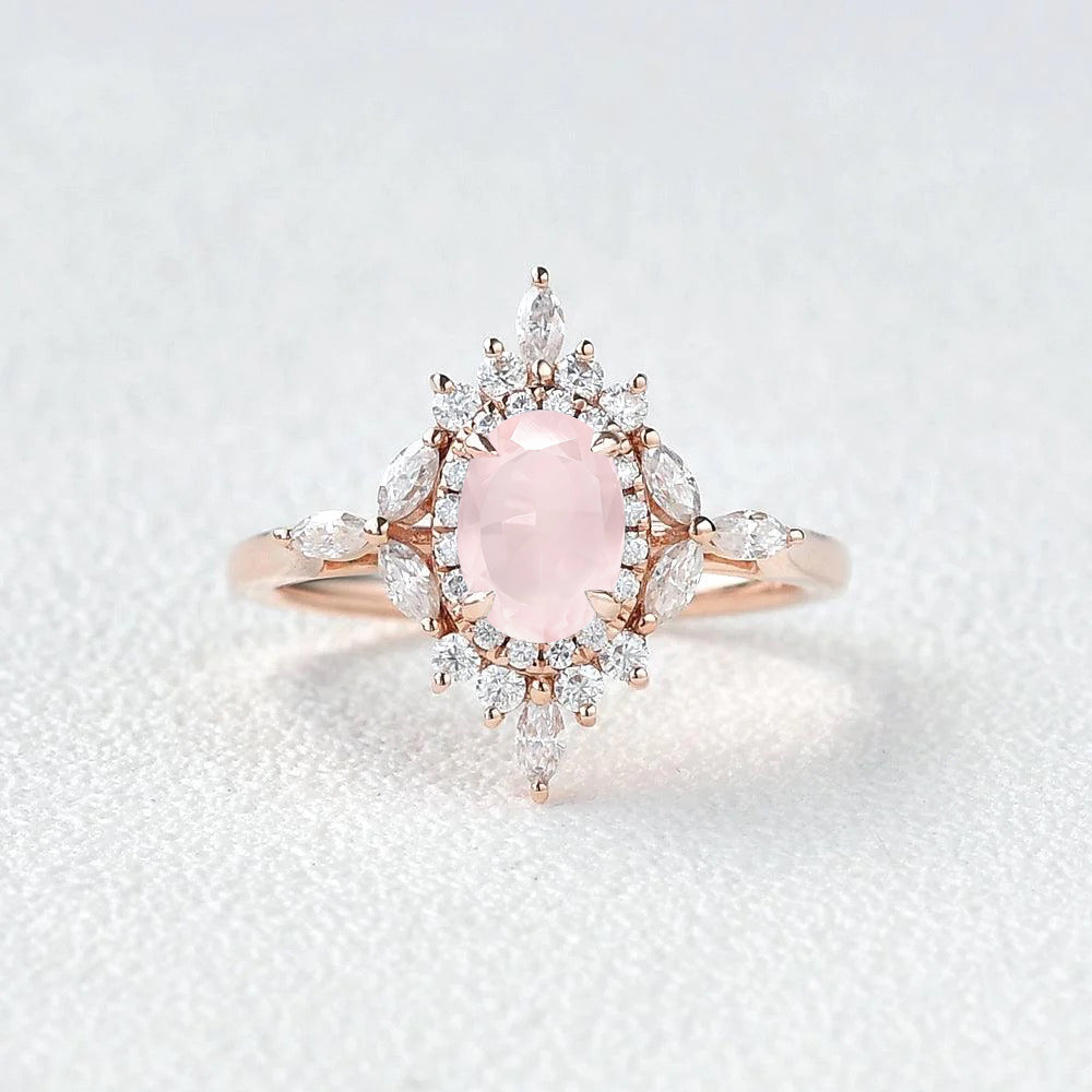 Felicegals 1.0ct Oval Rose Quartz Engagement Ring Barbie Jewelry Moissanite Stacking Wedding Ring Flower Marquise Pink Crystal Halo Ring Antique