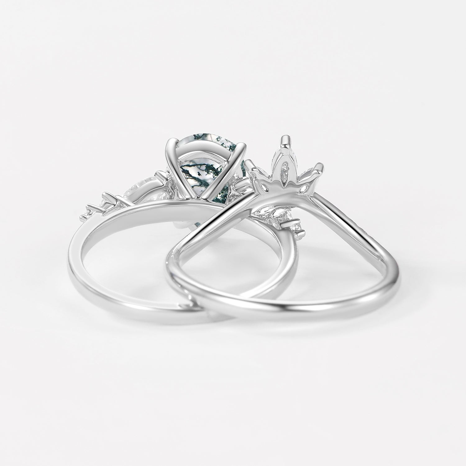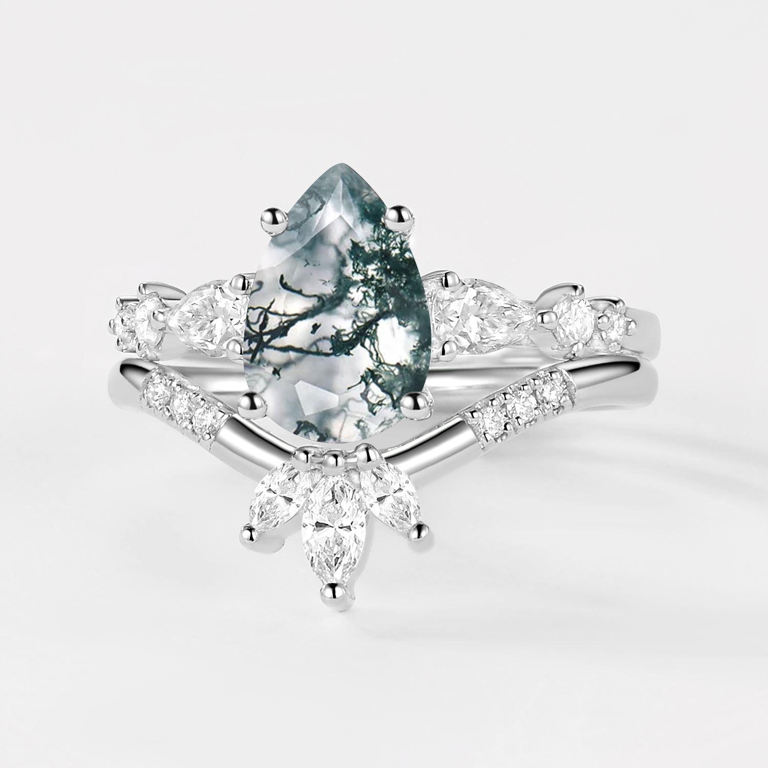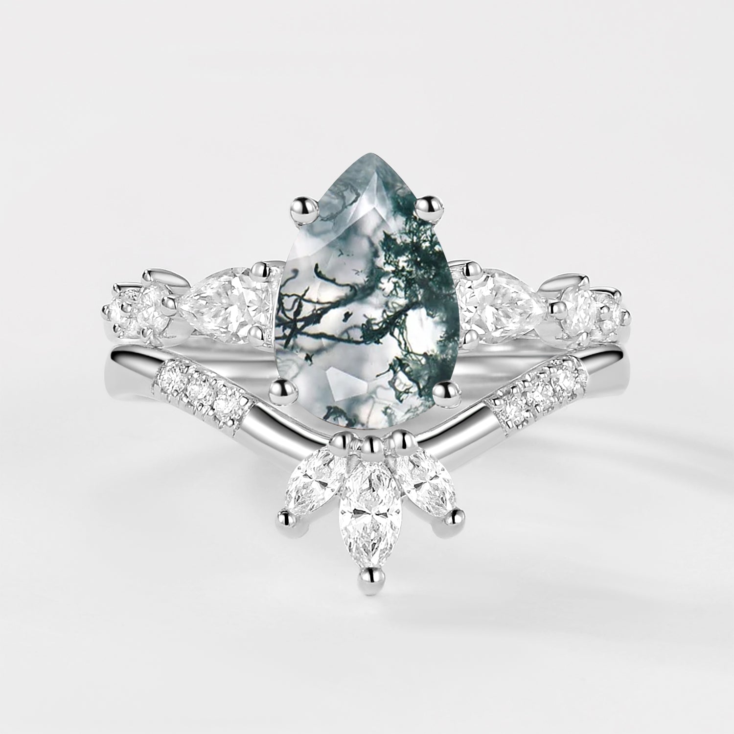 2.0ct Pear Shaped Moss Agate Chevron Bridal Ring Set 2pcs