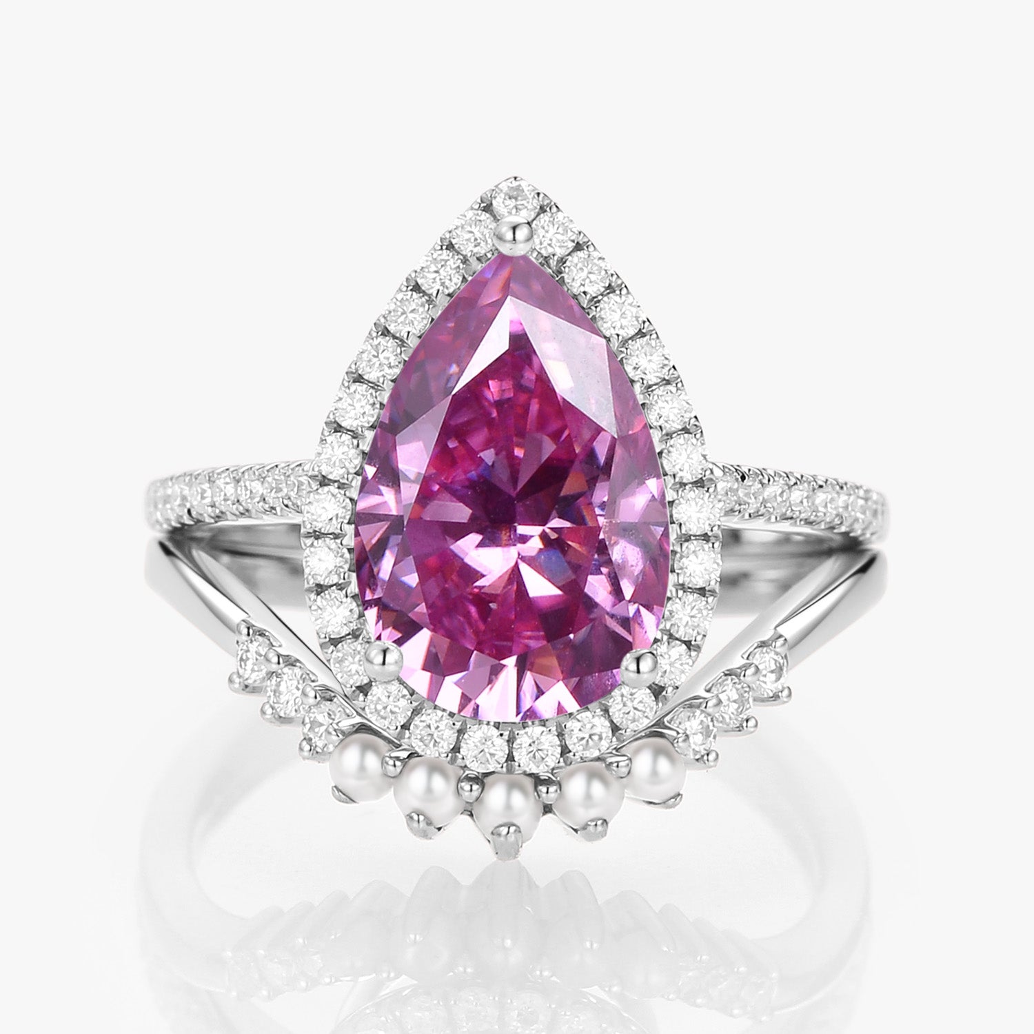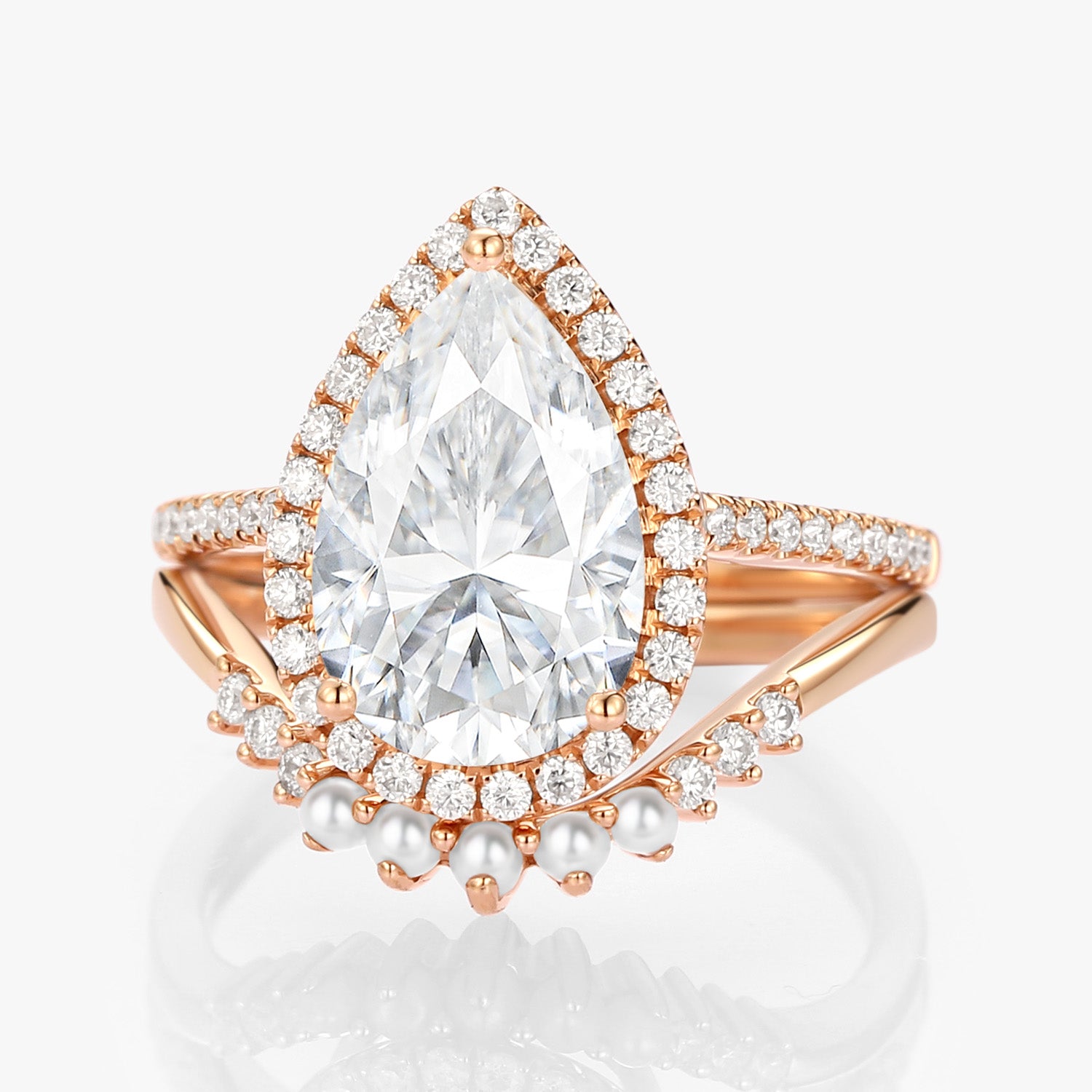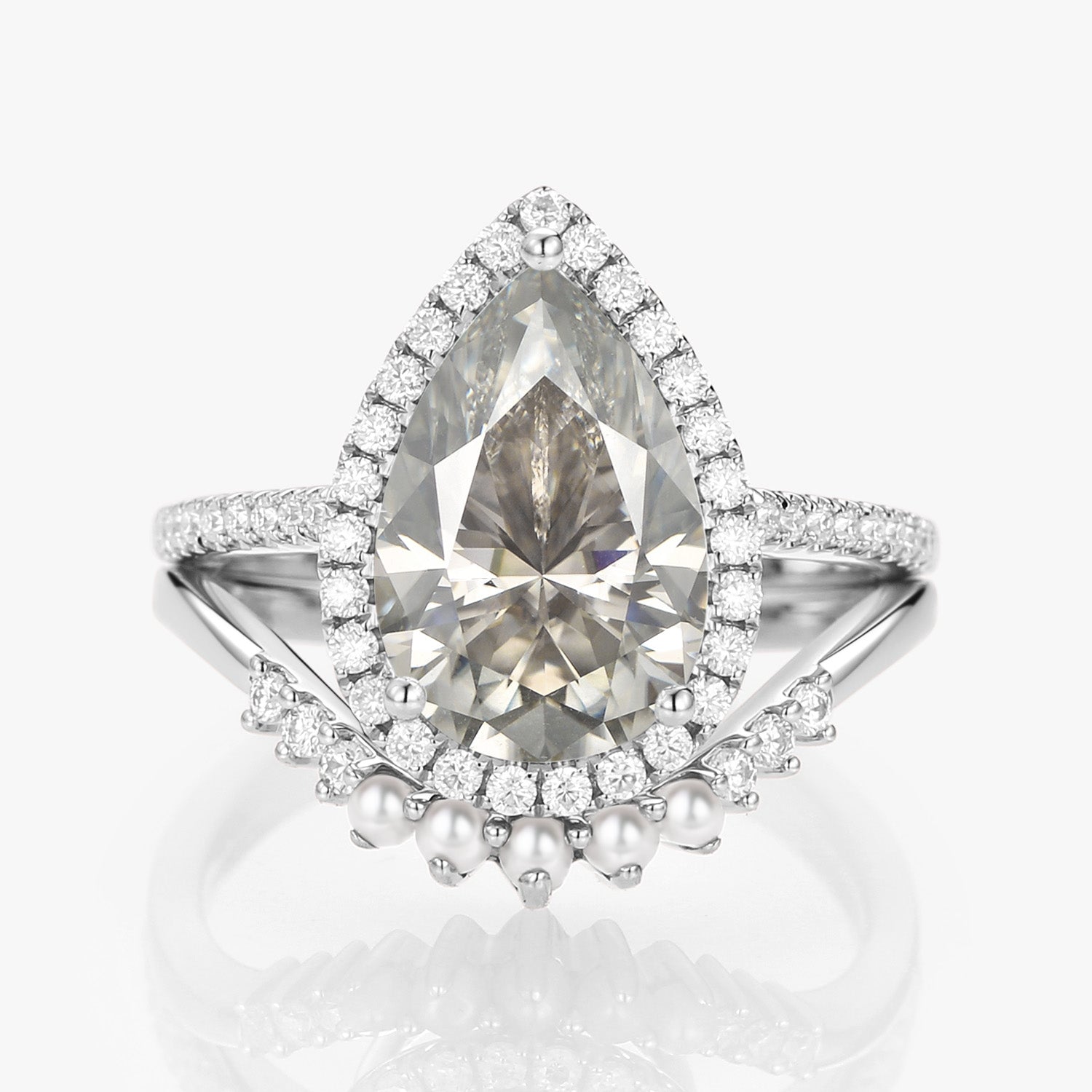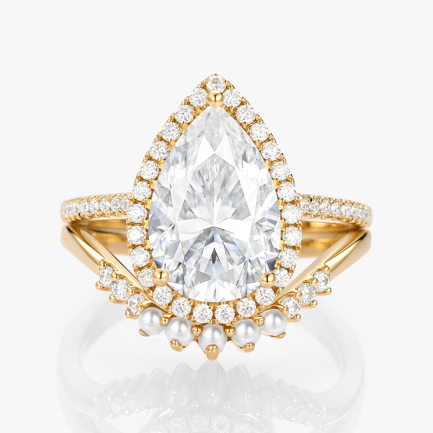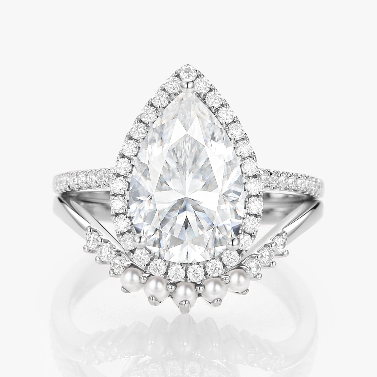 4.0ct Pear Moissanite & Pearl Classic Halo Ring Set 2pcs - Verena