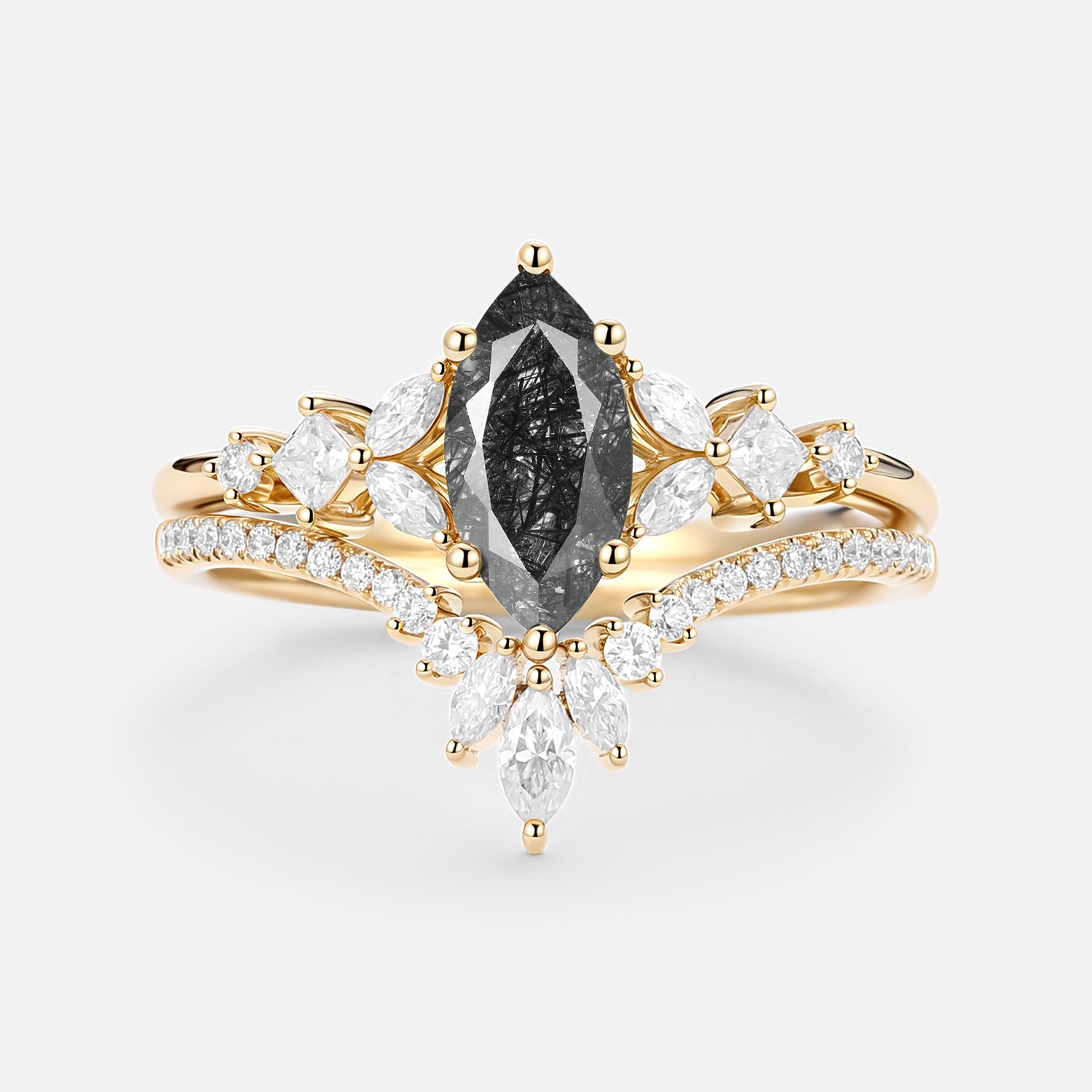 Black Rutilated Quartz Cluster Vintage Marquise Engagement Ring Set 2pcs - Lumenis