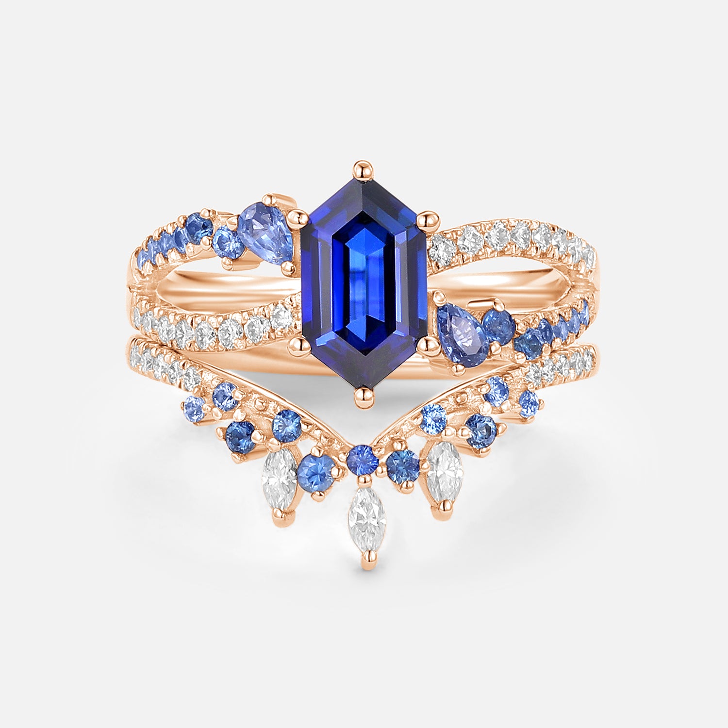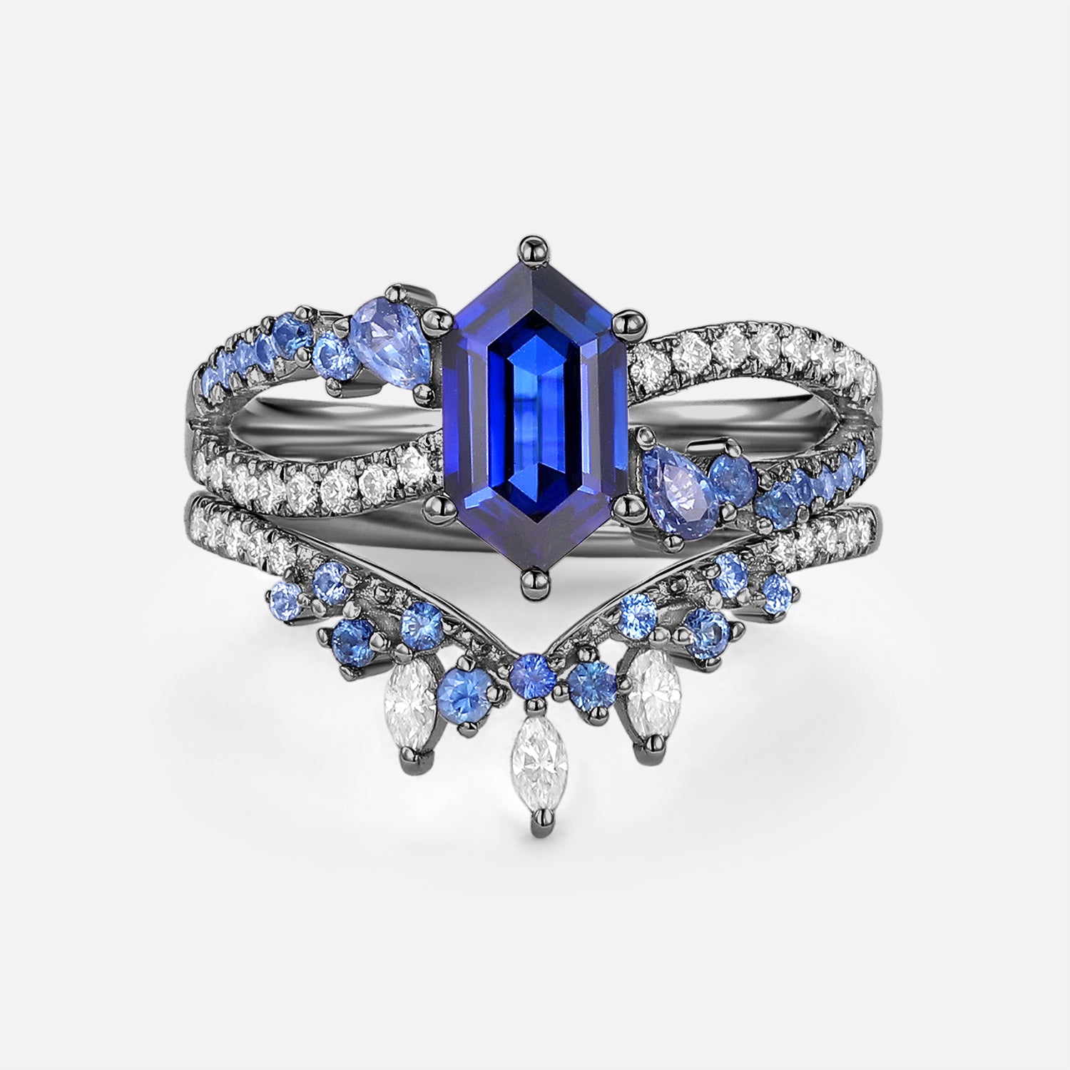 Downpour’s Merge - Lab Sapphire Cluster Elongated Hexagon Engagement Ring Set