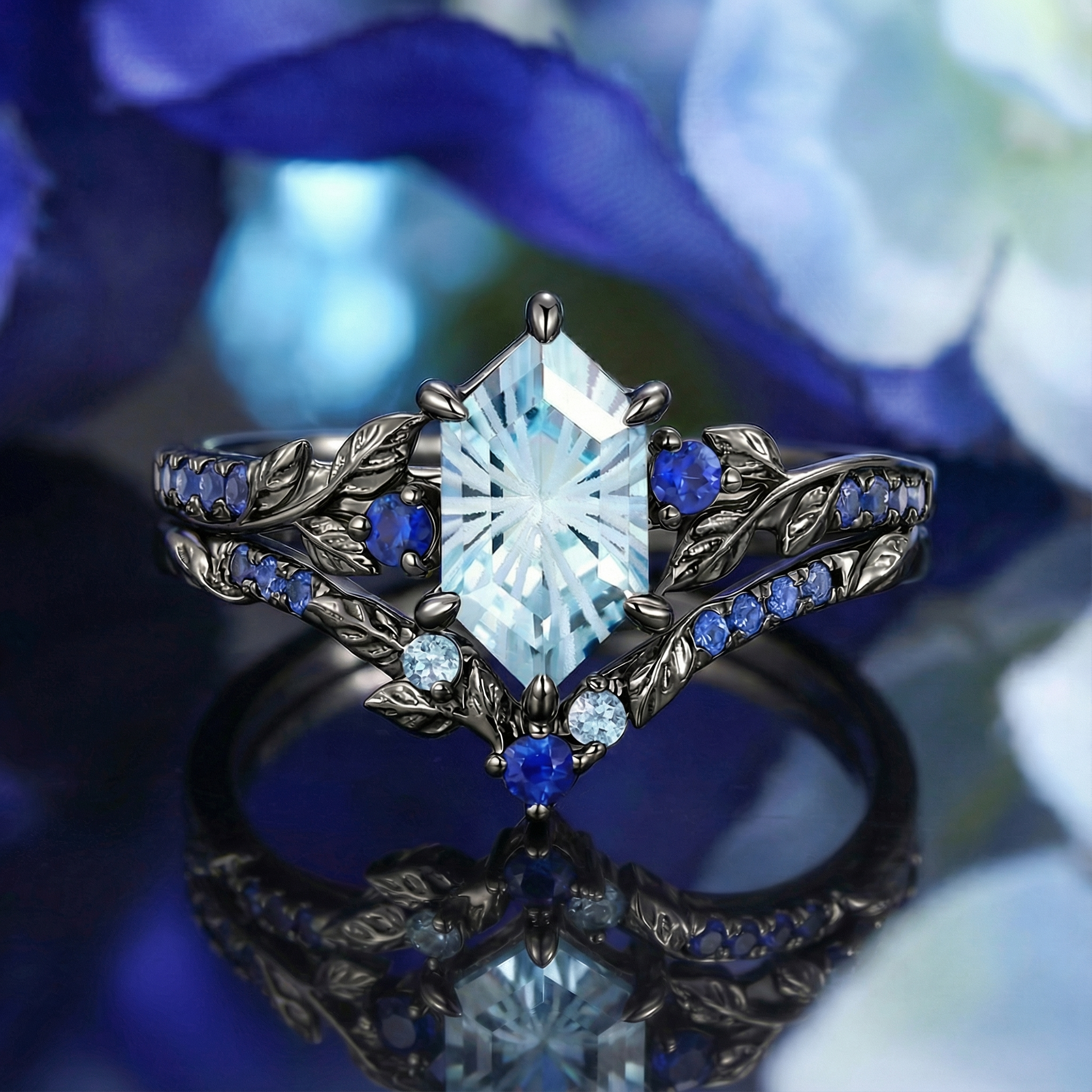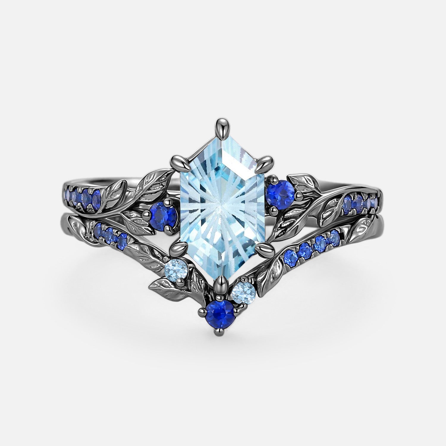 Elongated Hexagon Fireworks Cut Aquamarine Engagement Ring Set 2pcs - Azure