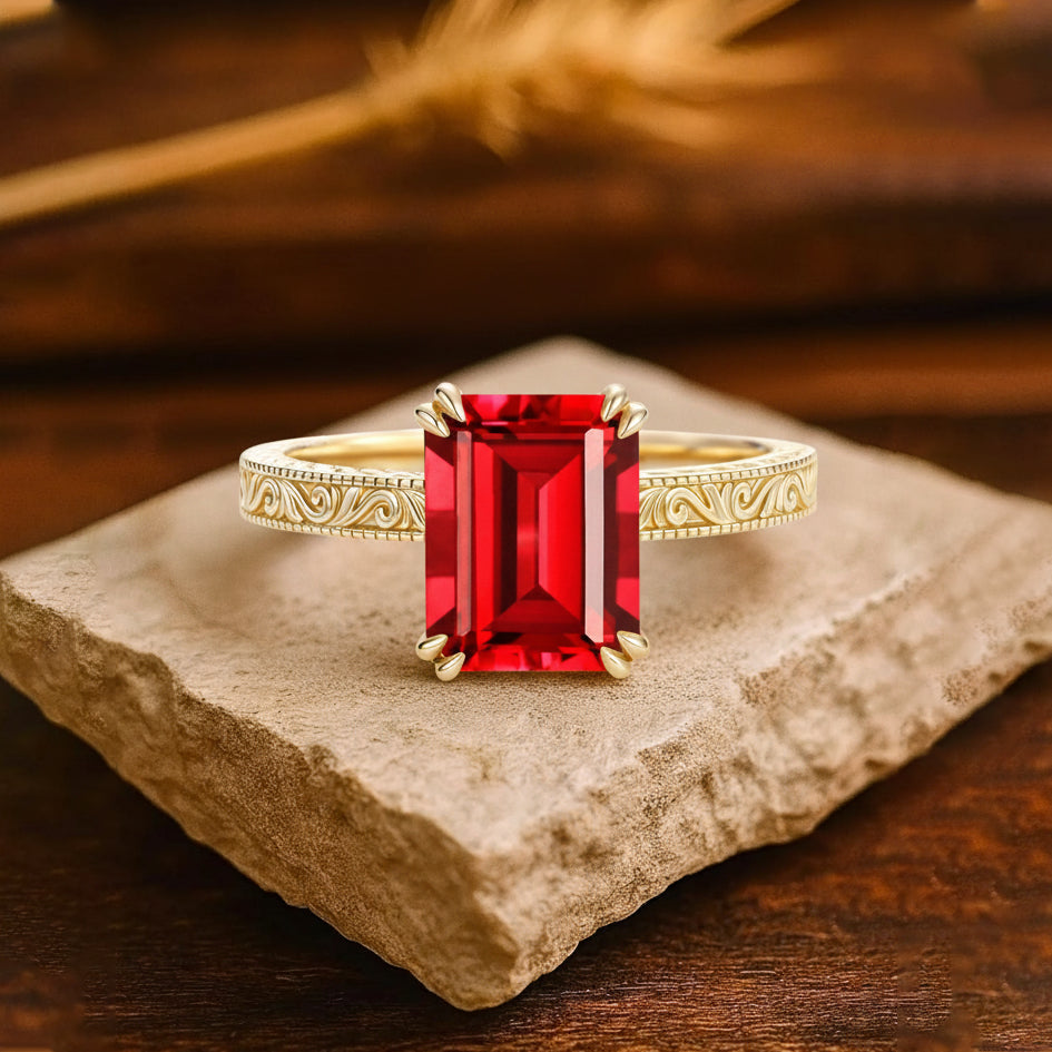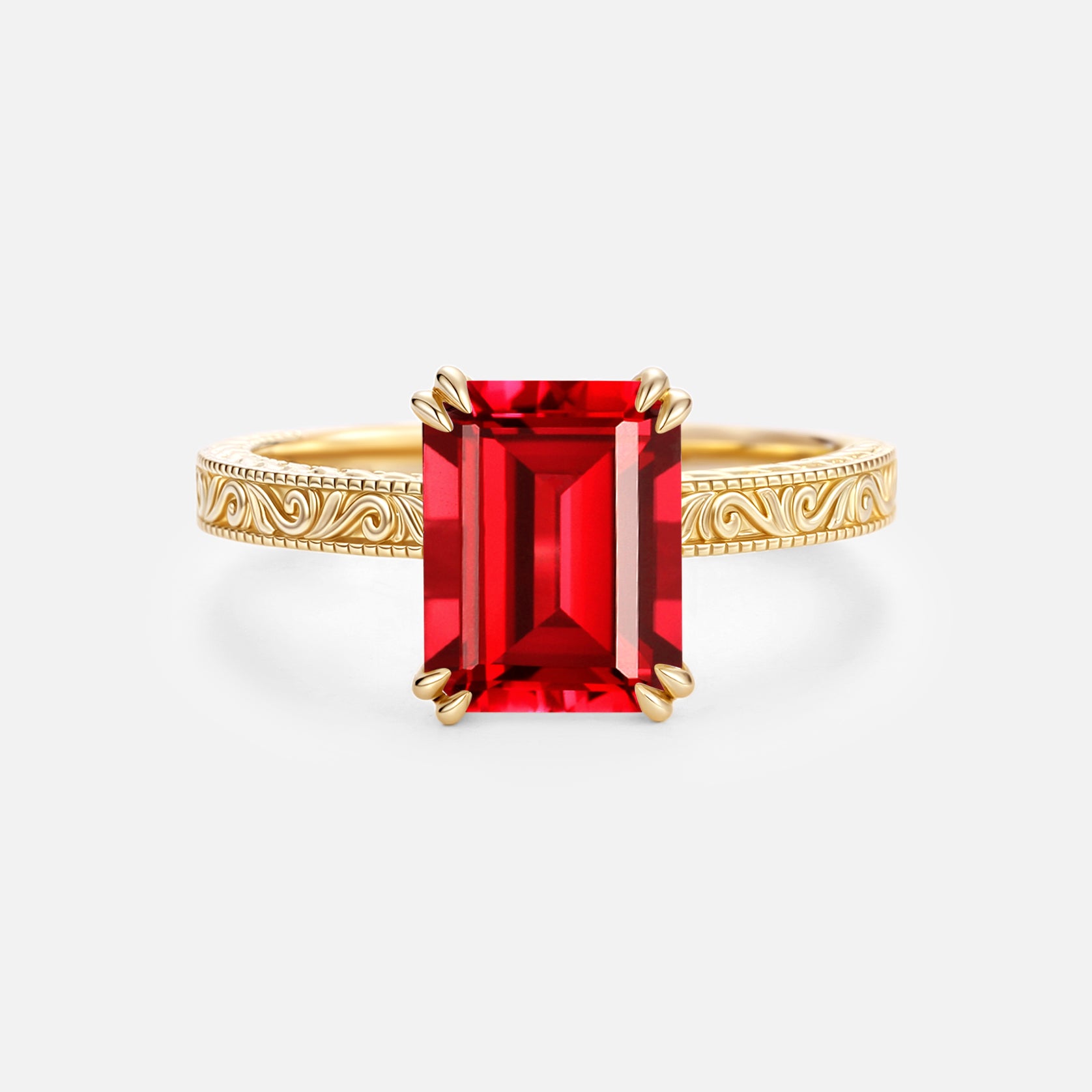Emerald Cut Engraved Lab Ruby Vintage Engagement Ring - Celeste
