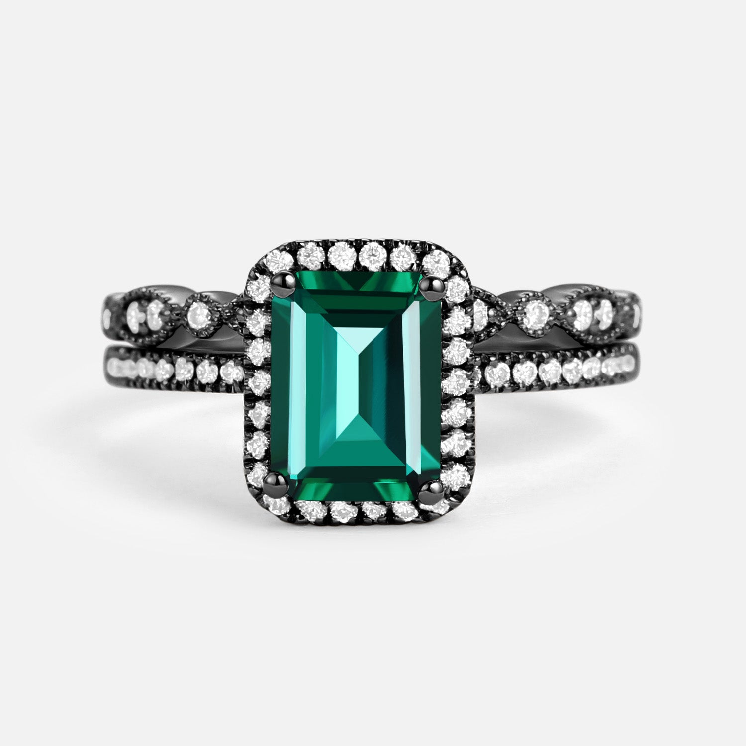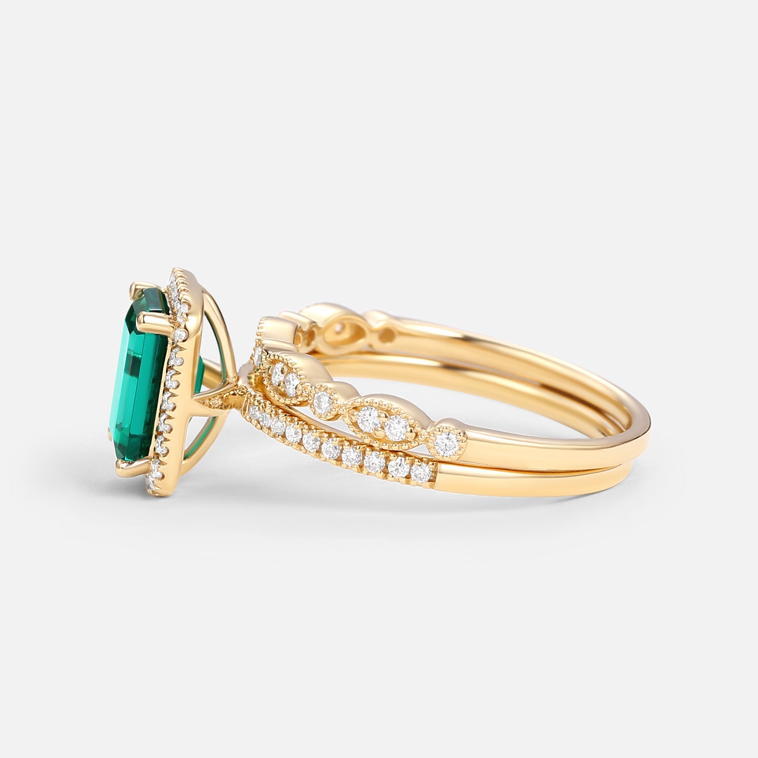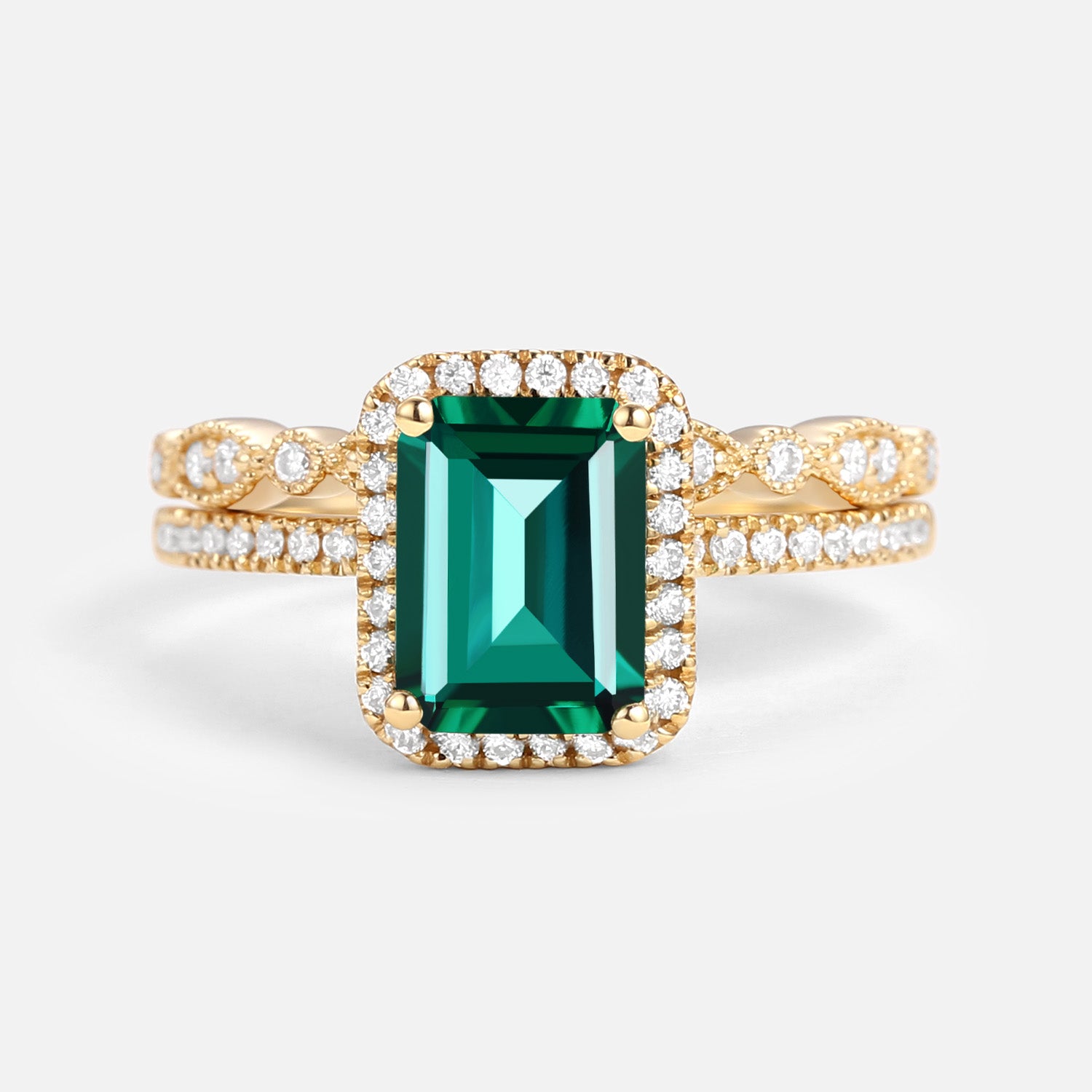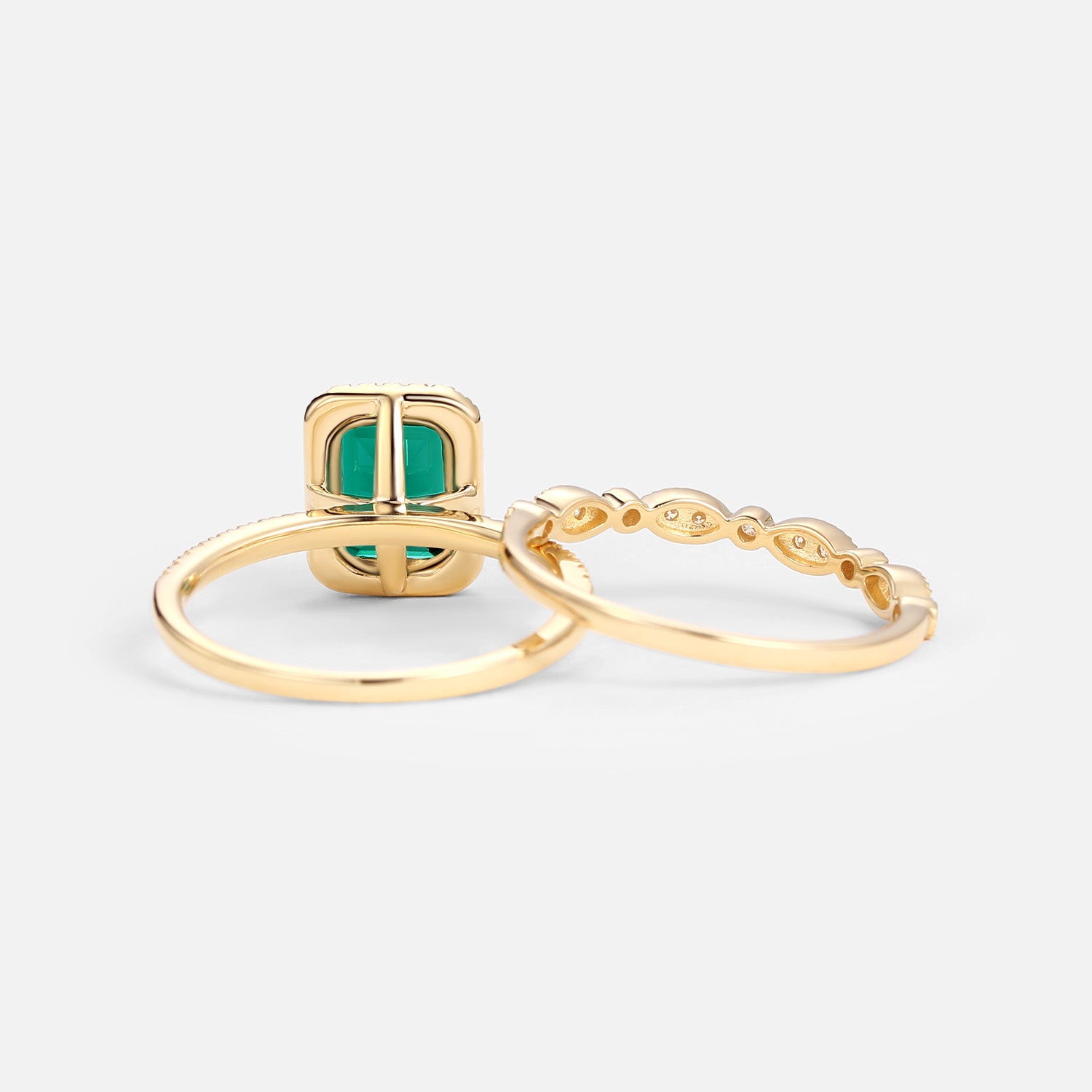 Emerald & Moissanite Halo Gold Ring Set 2pcs