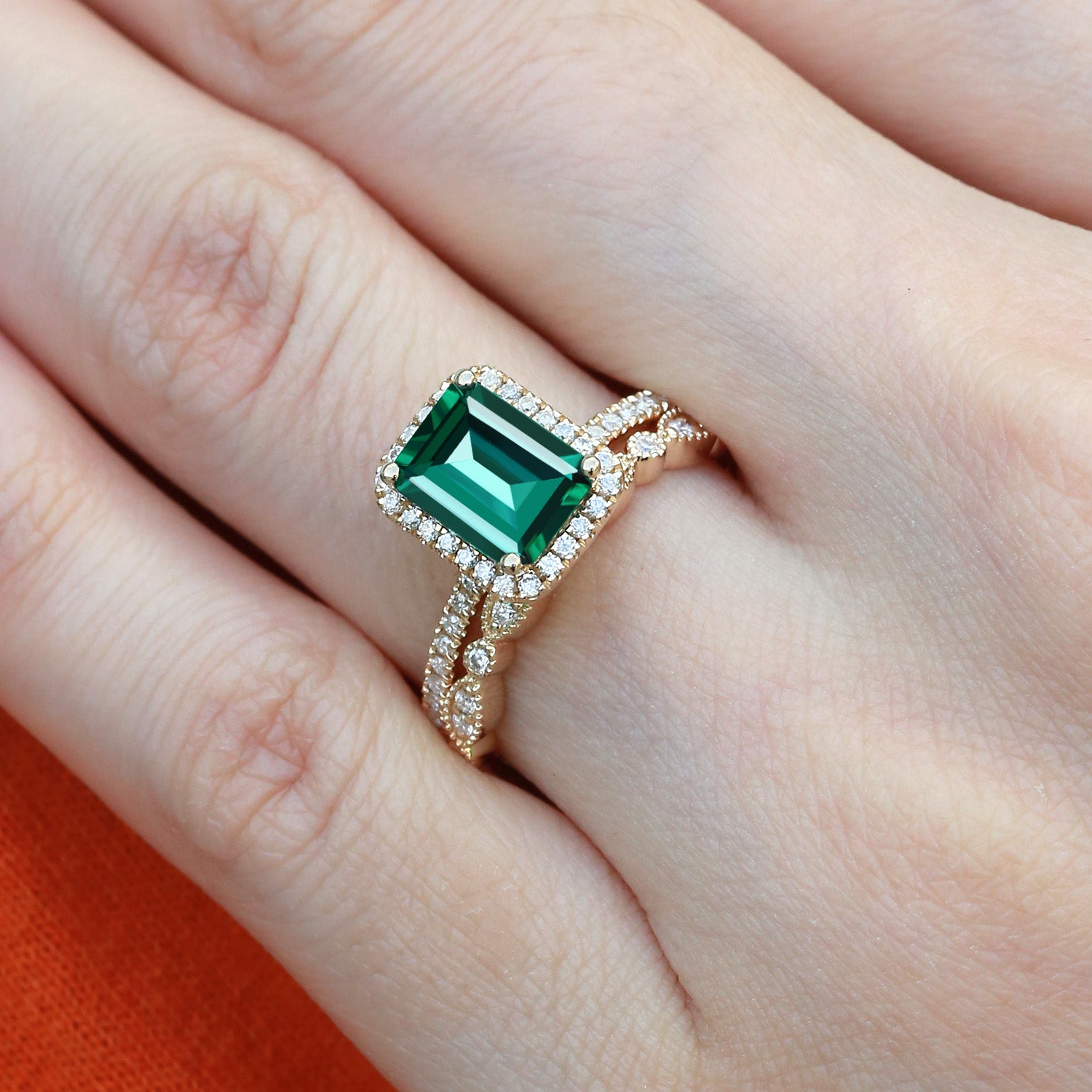Felicegals Lab Emerald Engagement Rose Gold Ring Set 2pcs Emerald Cut Halo Moissanite Birthstone Ring Milgrain Dainty Ring Half Eternity Custom Wedding Band