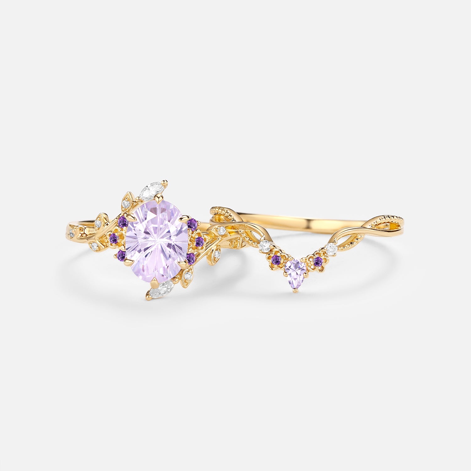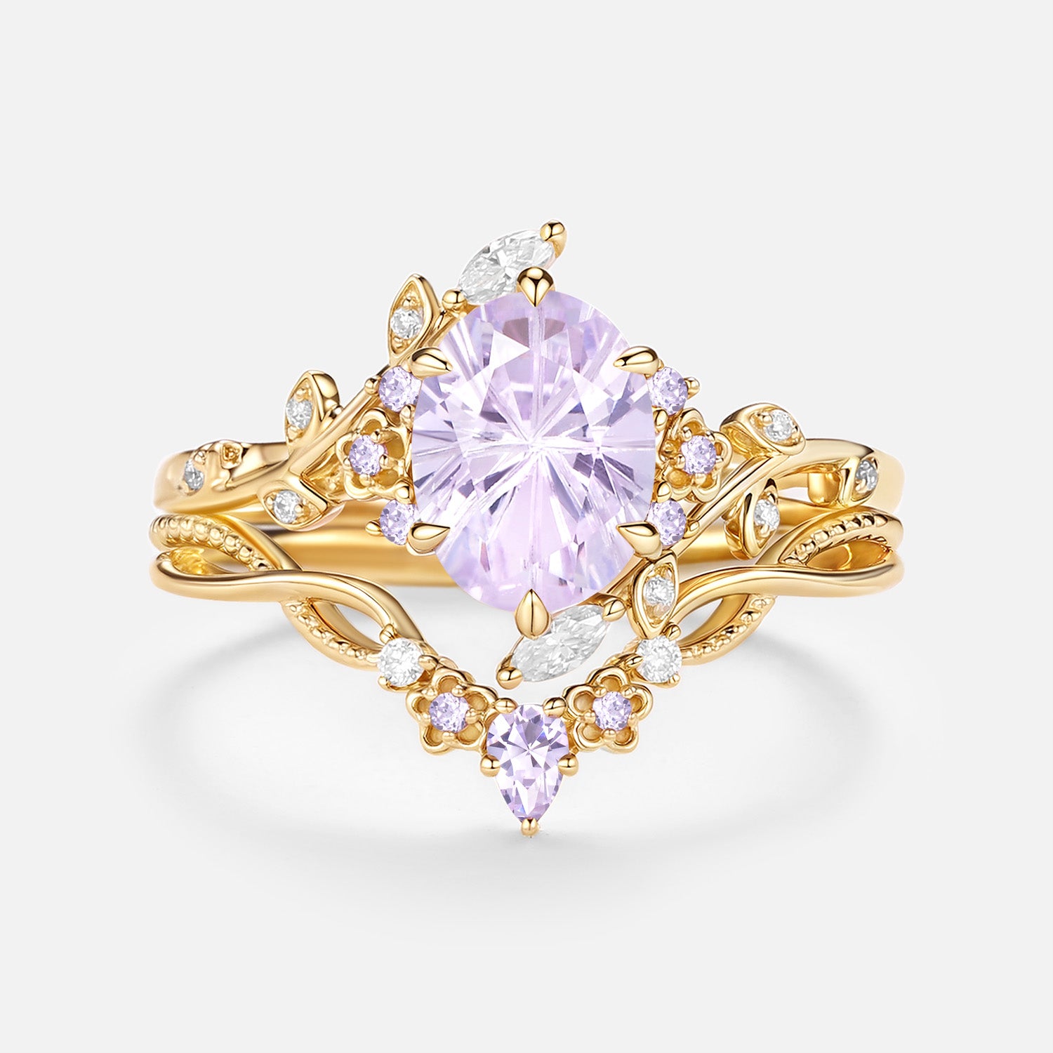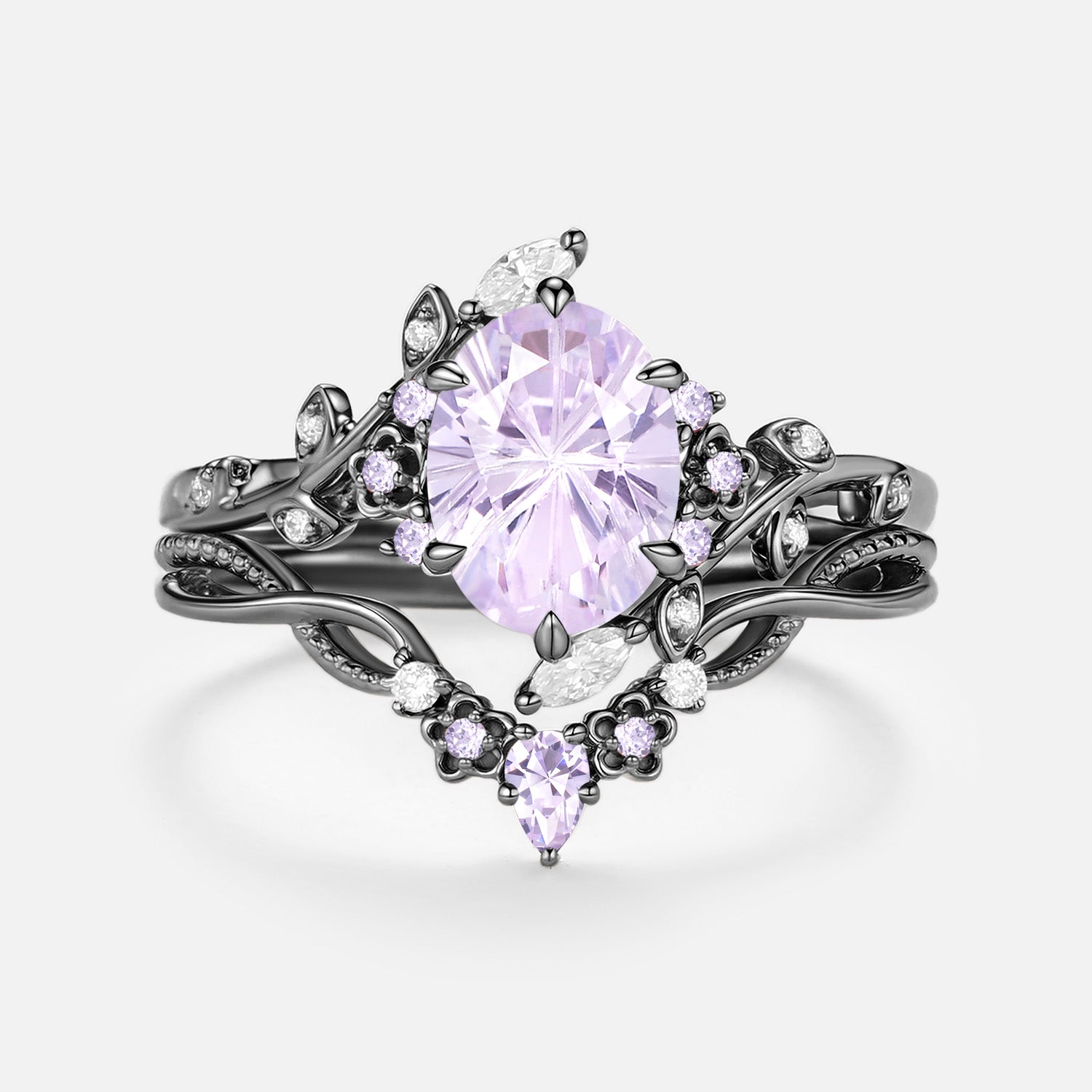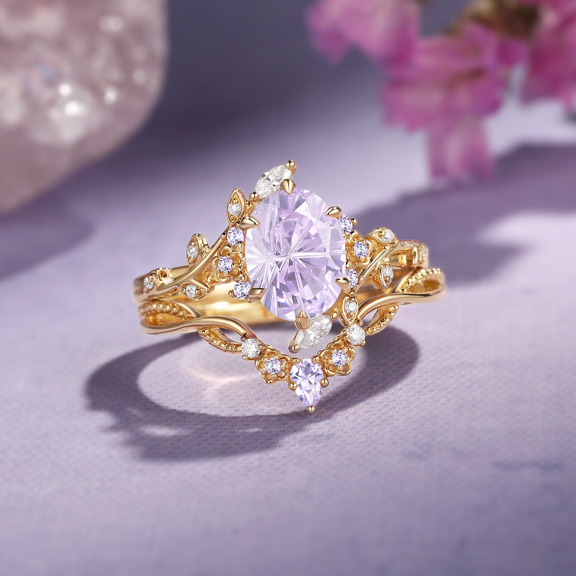 Firework Cut Oval Flower Lab Lavender Sapphire Engagement Ring Set 2pcs - Callista