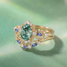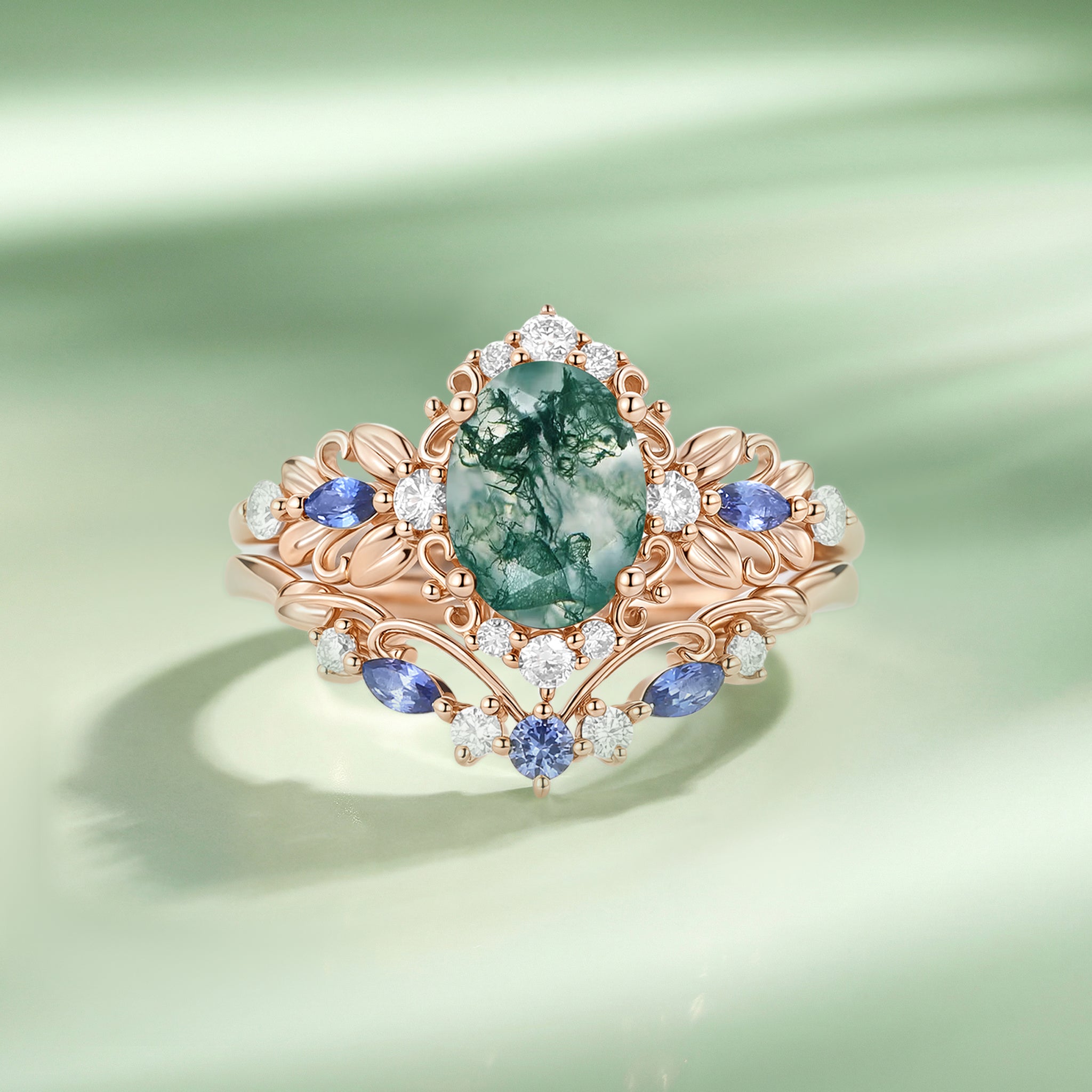 Green Moss Agate Oval Cut Leaf Engagement Ring Set 2pcs - Viriditas