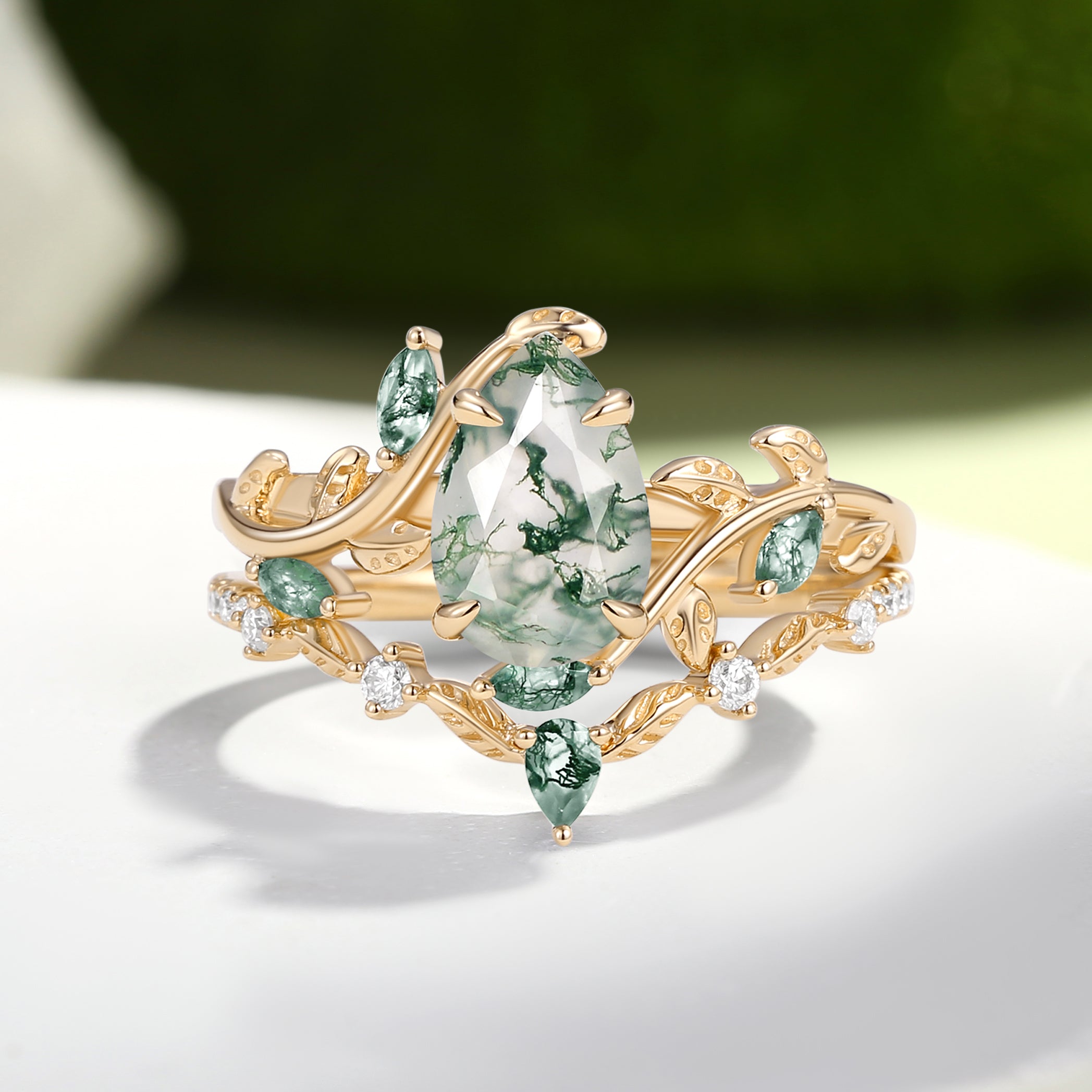 Green Moss Agate Pear Vine Engagement Ring Set 2pcs - Daphne