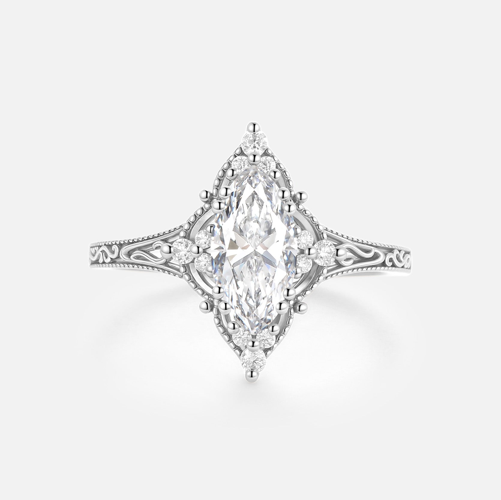 This Halo Marquise Lab Grown Diamond Engagement Ring charms with a central marquise-cut lab grown diamond, a glistening halo, and exquisite engraved patterns. Delicate craftsmanship emphasizes the band’s ornate patterns and refined lines, drawing the eye to the stunning lab-grown center stone. Corona is a perfect blend of eco-conscious brilliance and classic allure, making it a unique and meaningful choice for your forever moment.