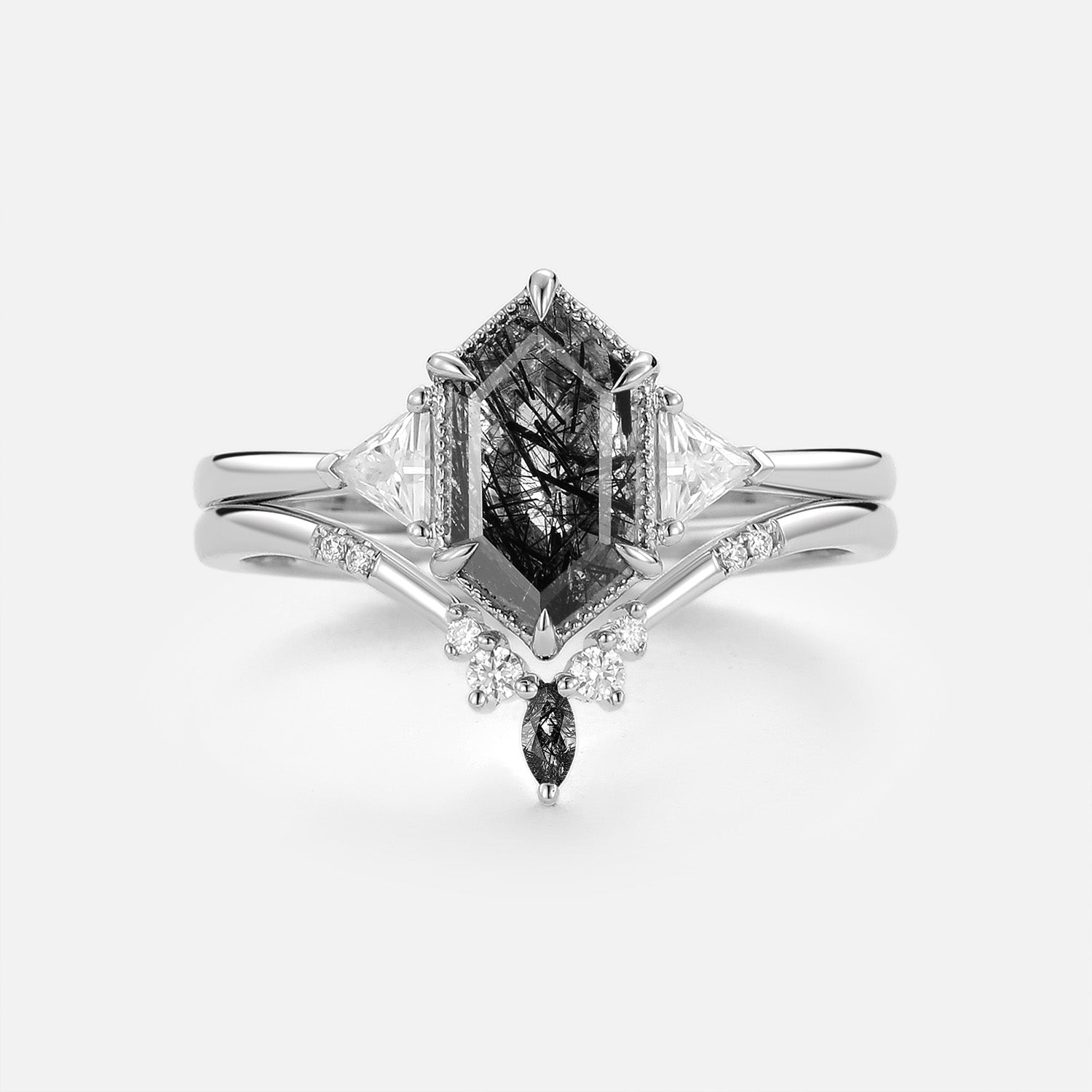 Hexagon Cut Black Rutilated Quartz Engagement Ring Sets 2pcs - Hilda