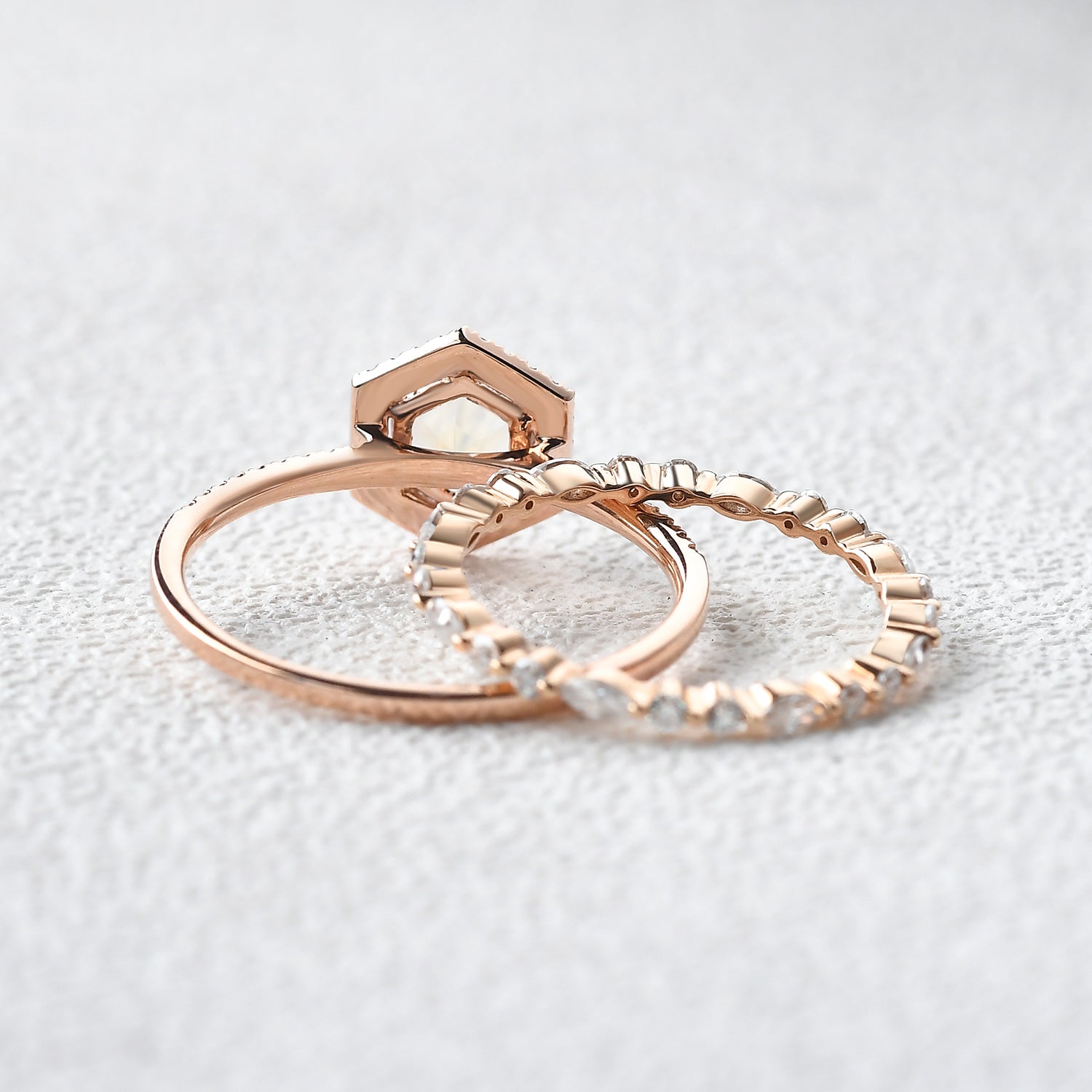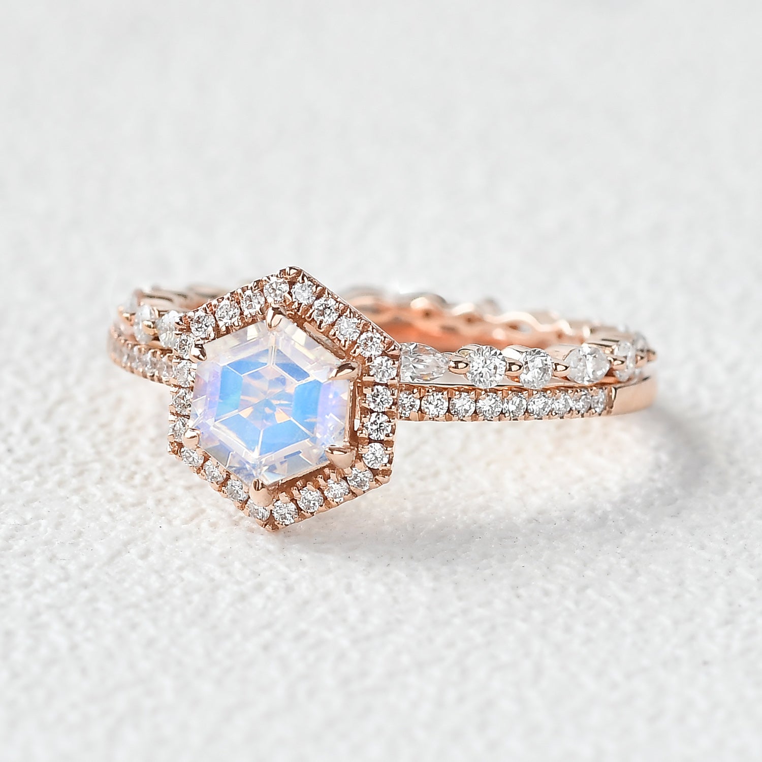 Felicegals Hexagon Moonstone & Moissanite Halo Rose Gold Ring Set 2PCS Moissanite Eternity Ring Anniversary Promise Women Gift