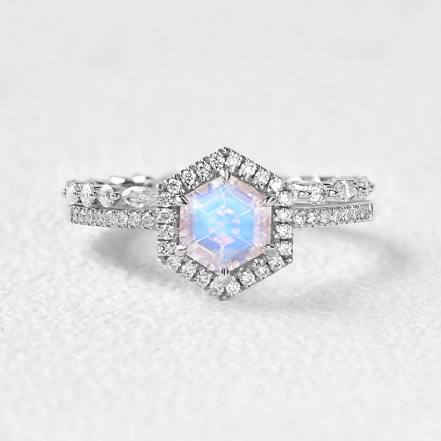 Hexagon Moonstone & Moissantie Halo Ring Set 2PCS