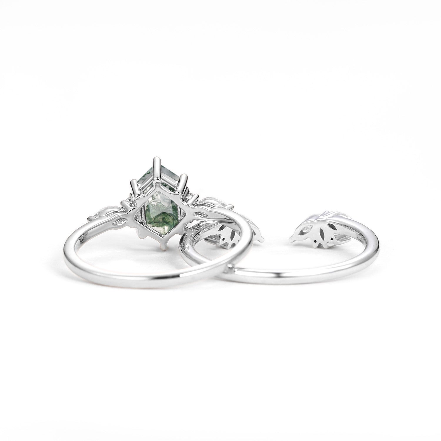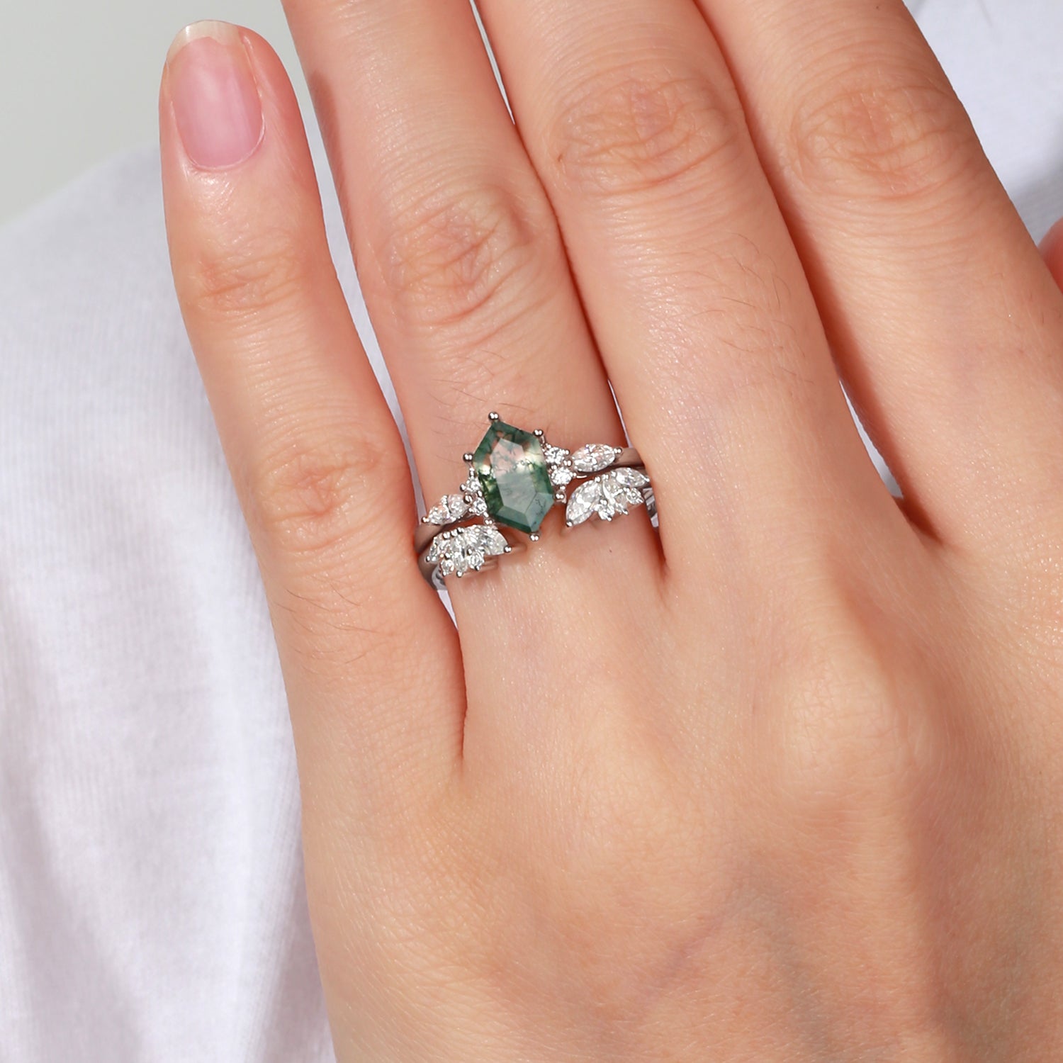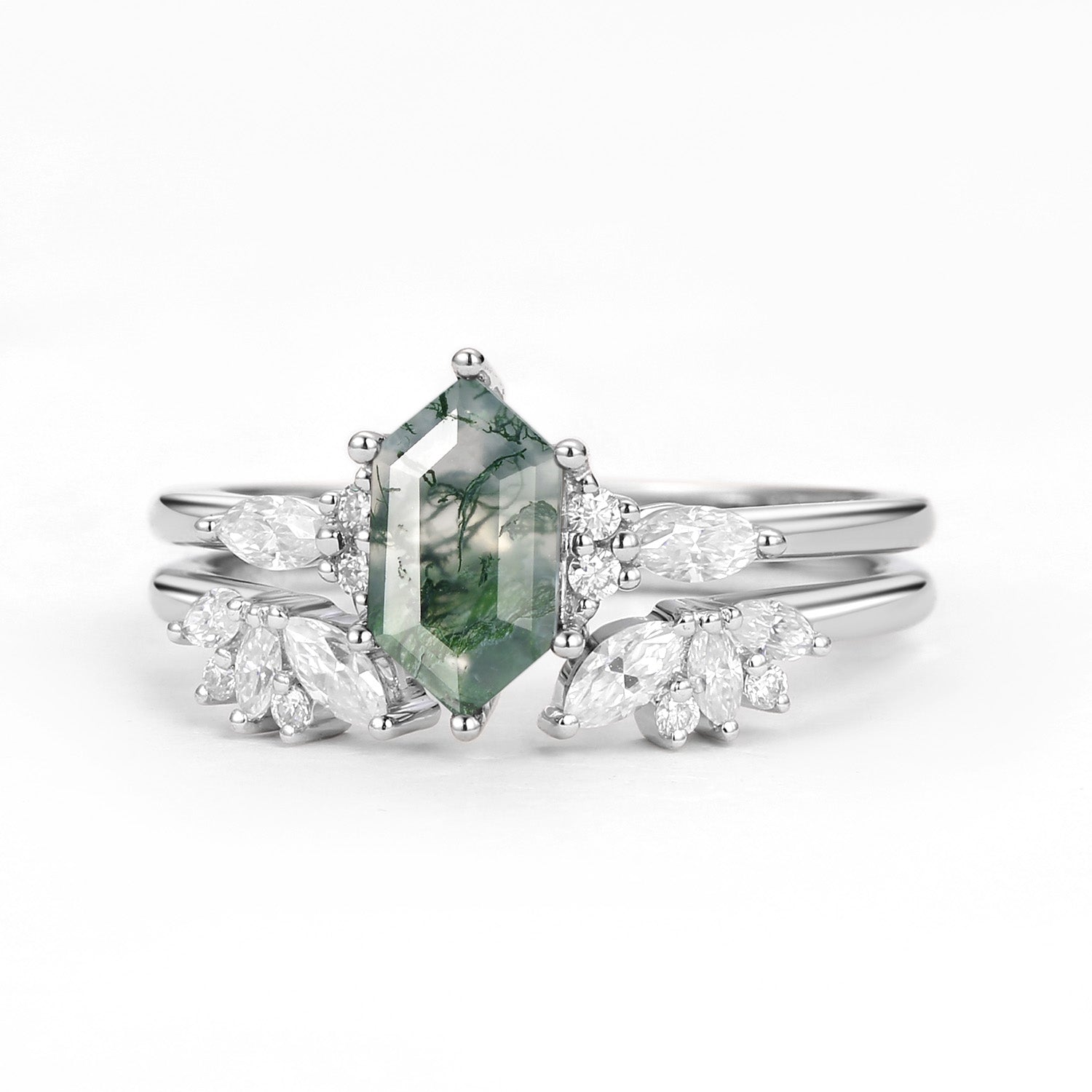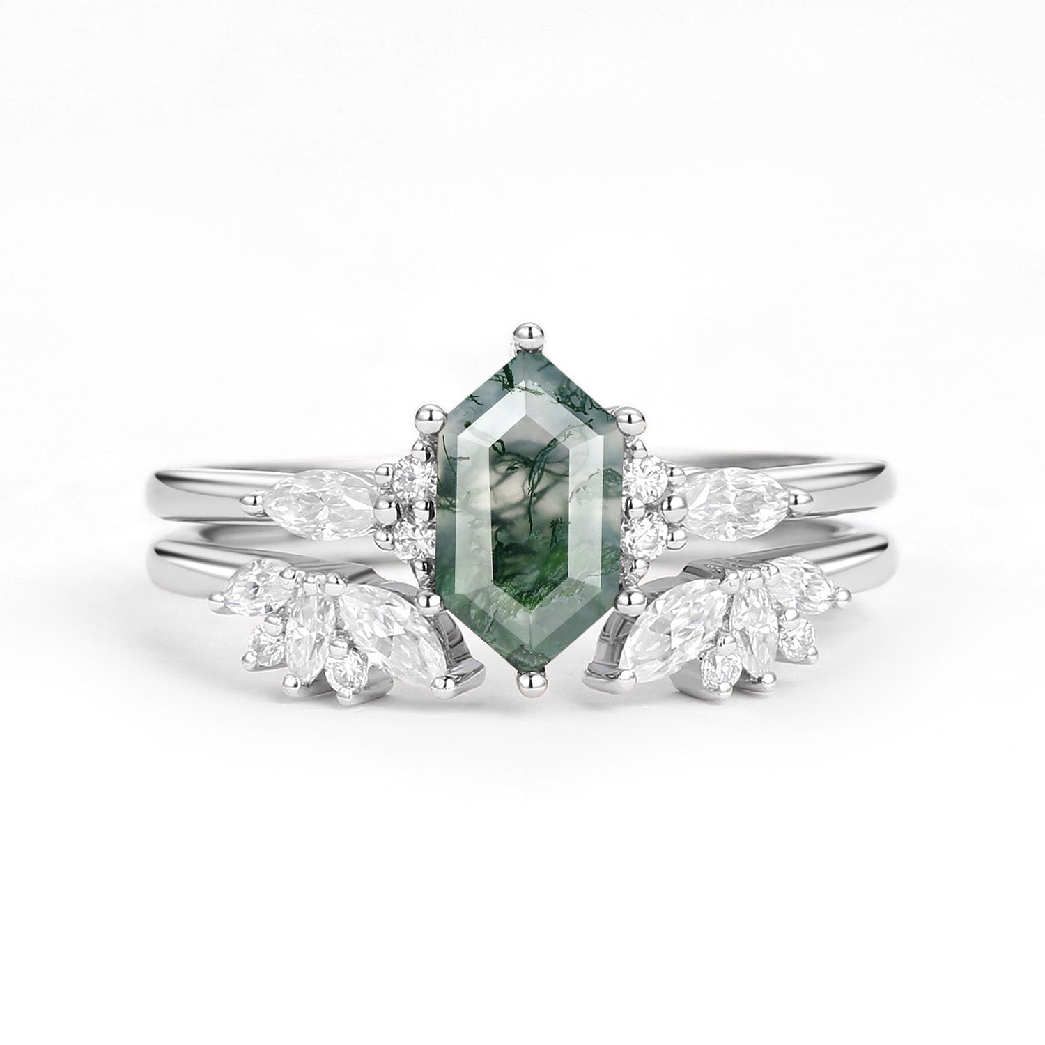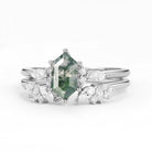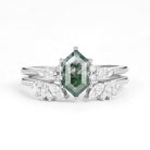 Hexagon Moss Agate Open Engagement Ring Set 2pcs