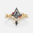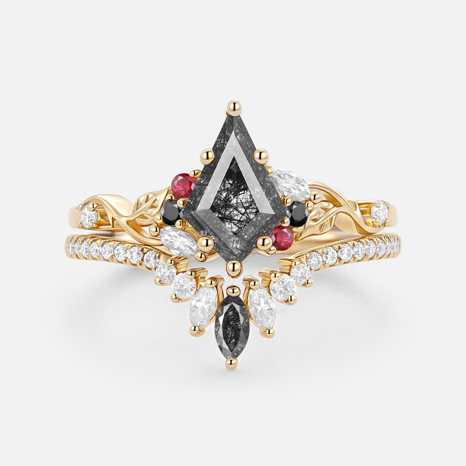 Kite Cut Black Rutilated Quartz Leafy Engagement Ring Set 2pcs - Elowen