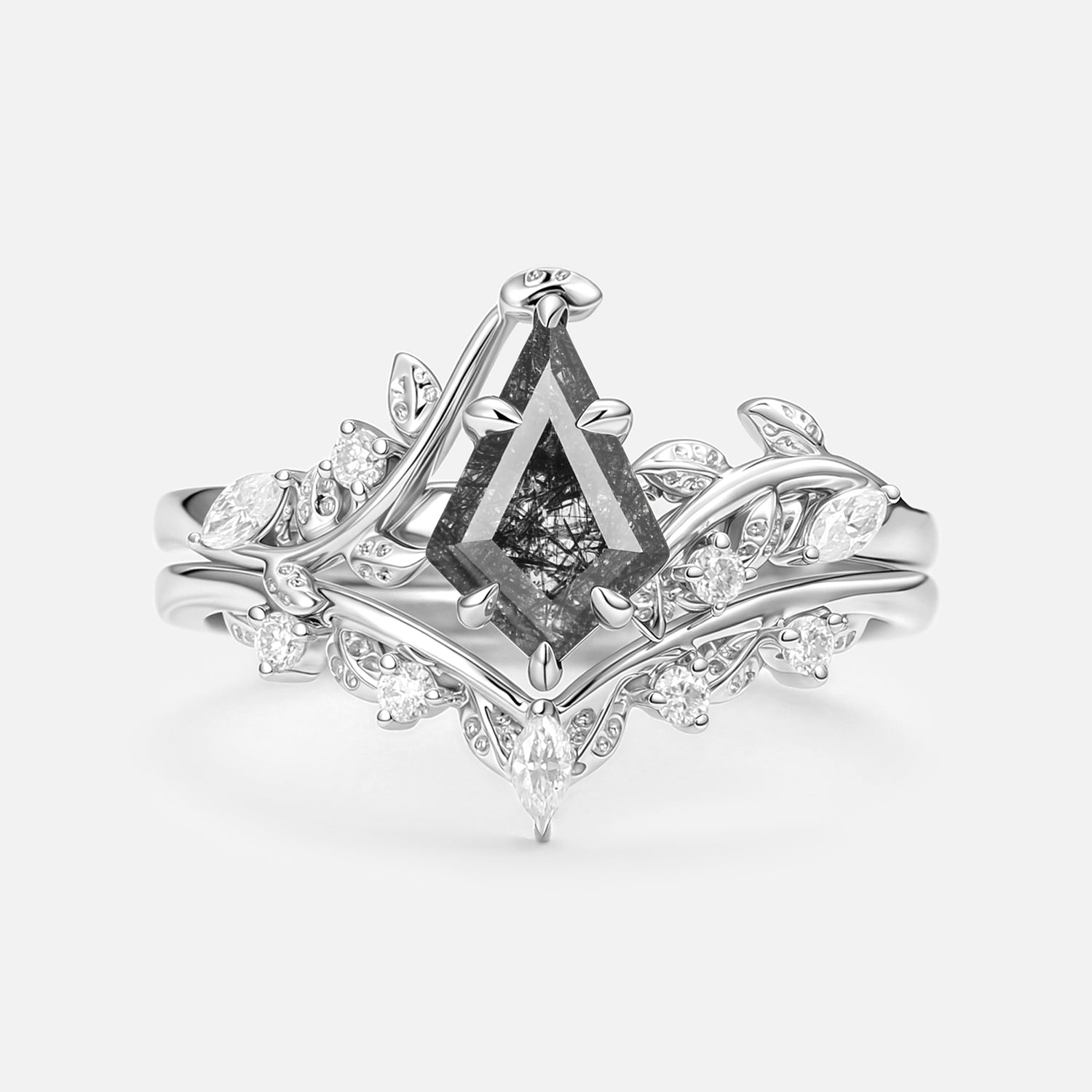 Kite Cut Black Rutilated Quartz Leafy Engagement Ring Sets 2pcs - Yew