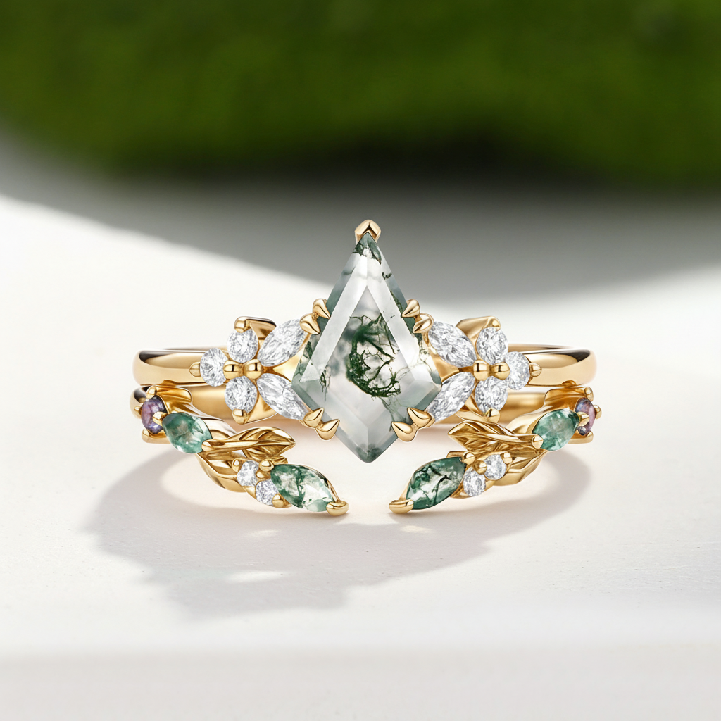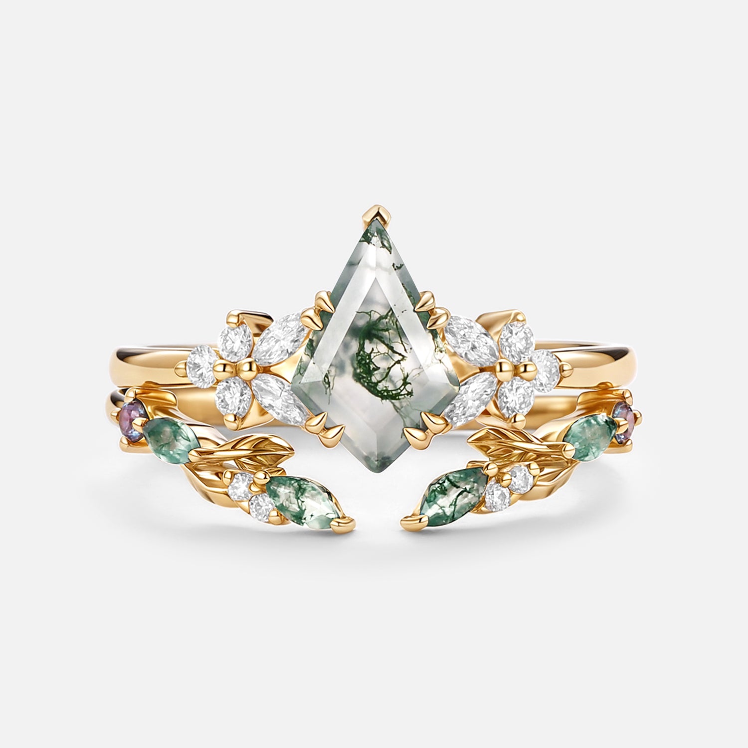 Kite Cut Moss Agate Leafy Engagement Ring Set 2pcs - Zephyr