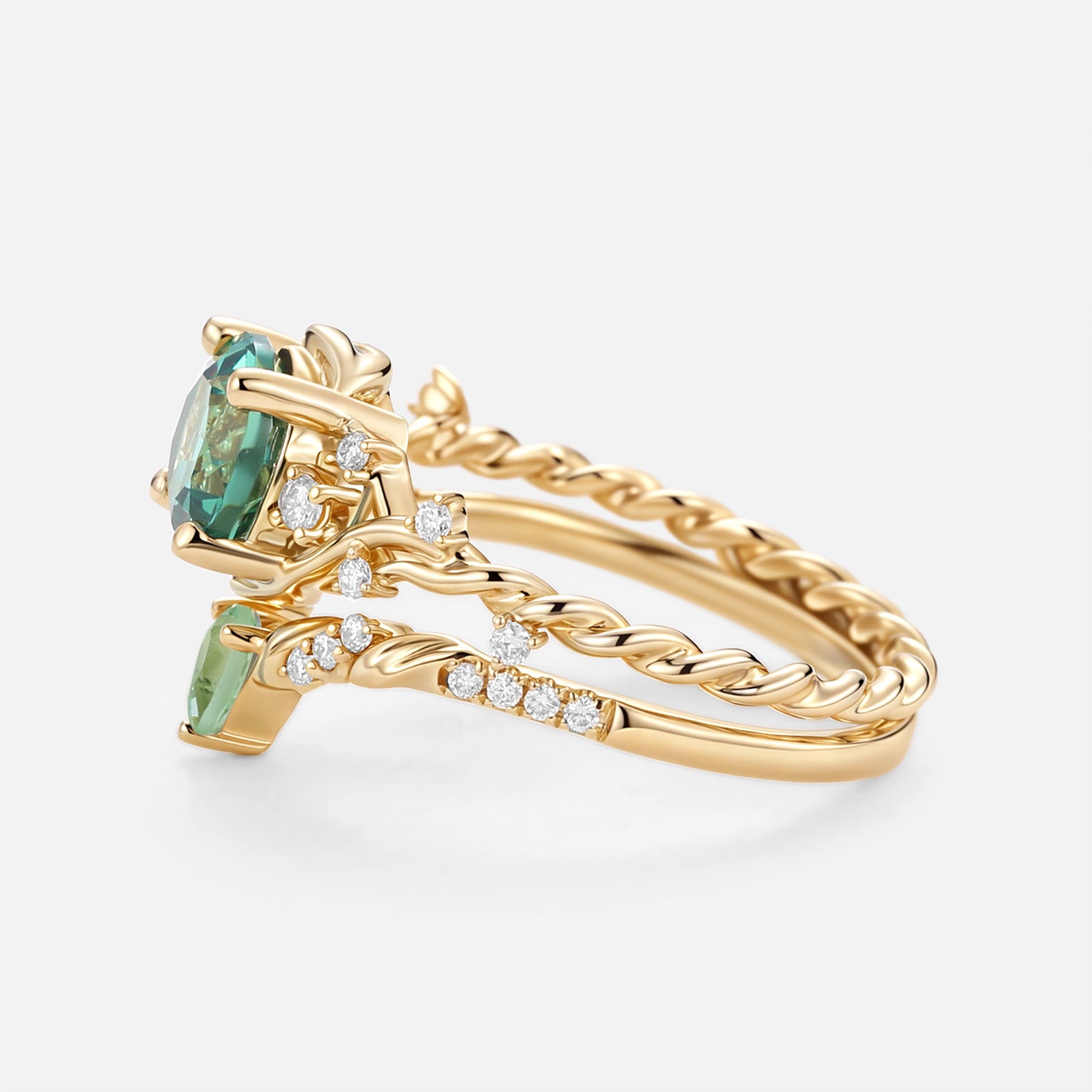 Lab Green Sapphire Round Cut Leafy Engagement Ring Set 2pcs - Verdi