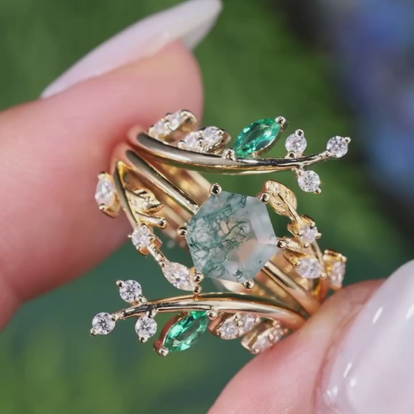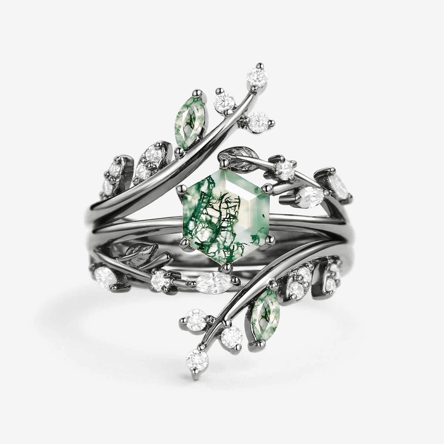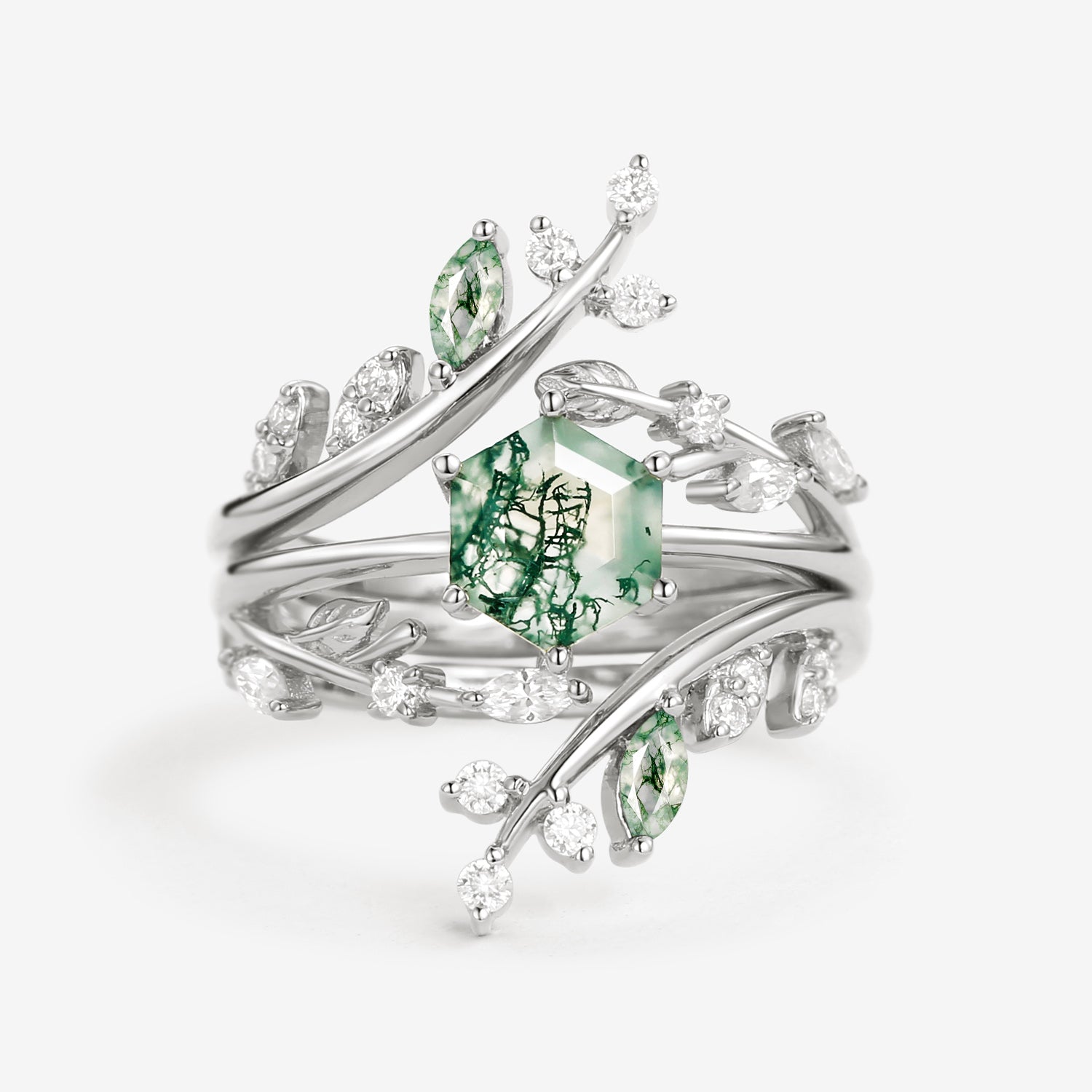 Leafy Hexagon Moss Agate Engagement Ring Set 2pcs