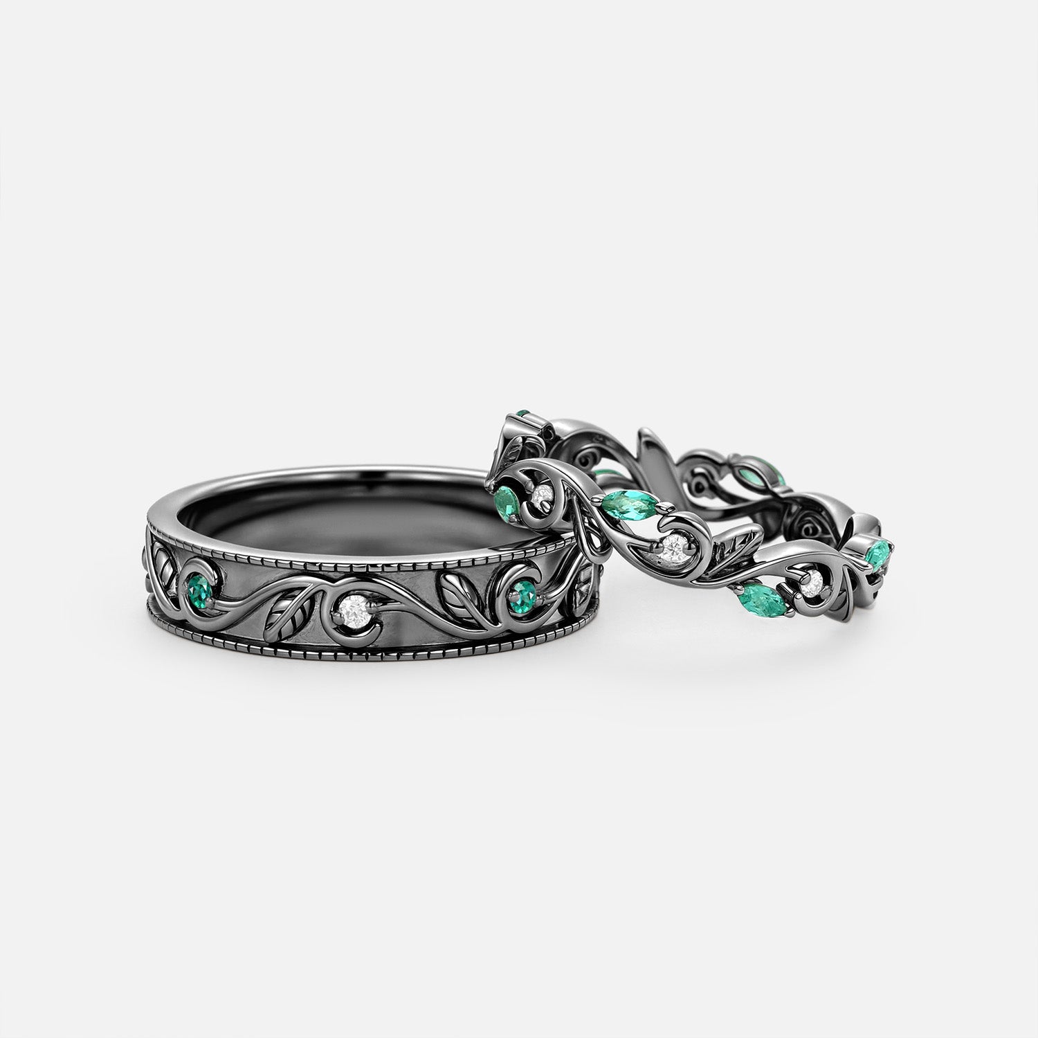 Leafy Moissanite & Lab Emerald Couple Ring Set 2pcs - Lila