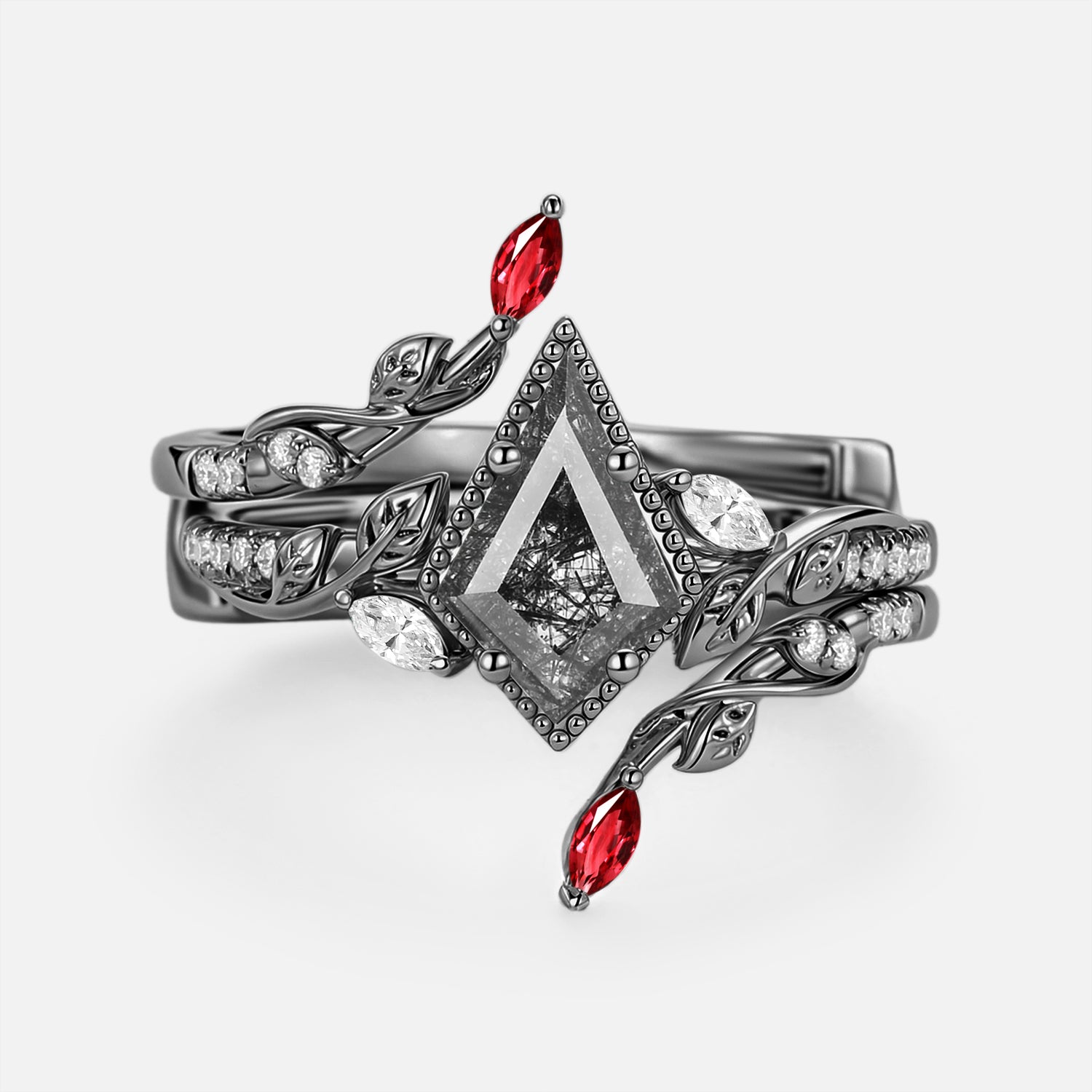 Leafy Vintage Kite Black Rutilated Quartz Cage Engagement Ring Set 2pcs - Breeze