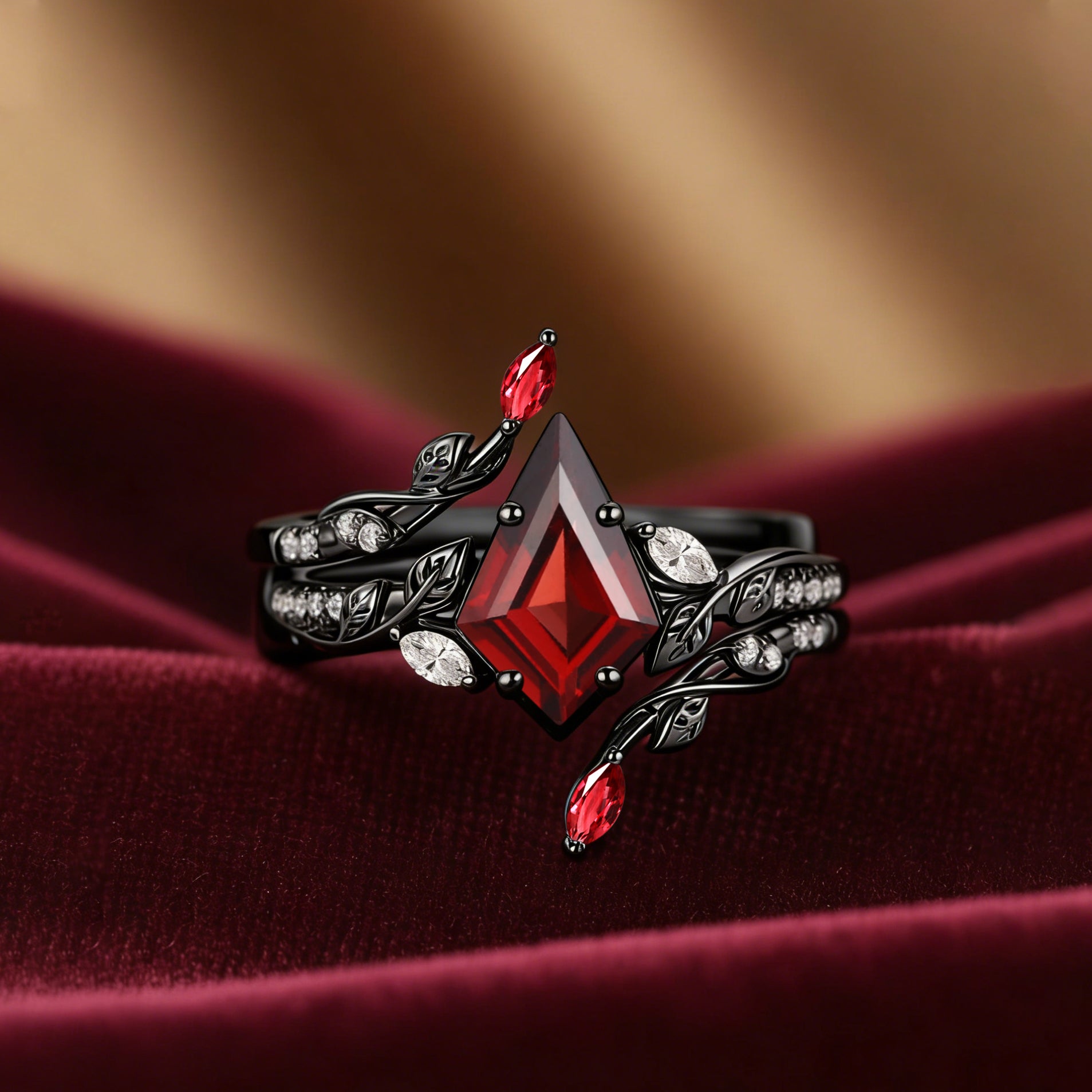 Leafy Vintage Kite Cut Garnet Cage Engagement Ring Set 2pcs - Breeze