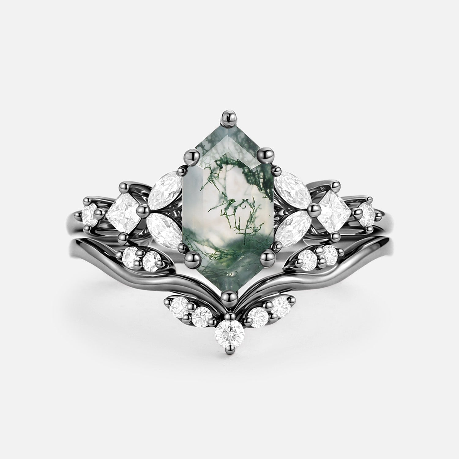 Long Hexagon Moss Agate Engagement Ring Set 2pcs - Vexa