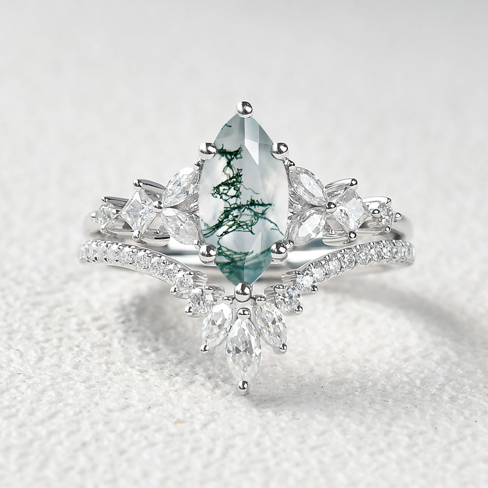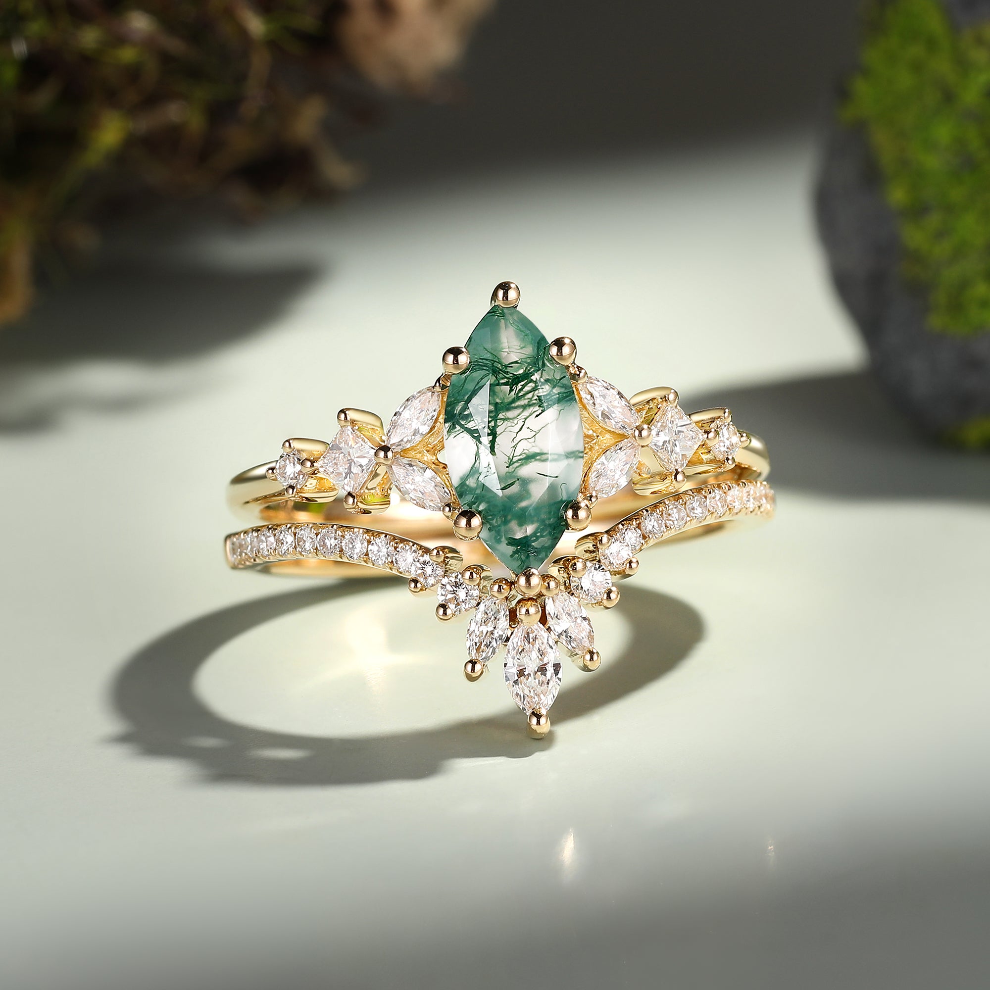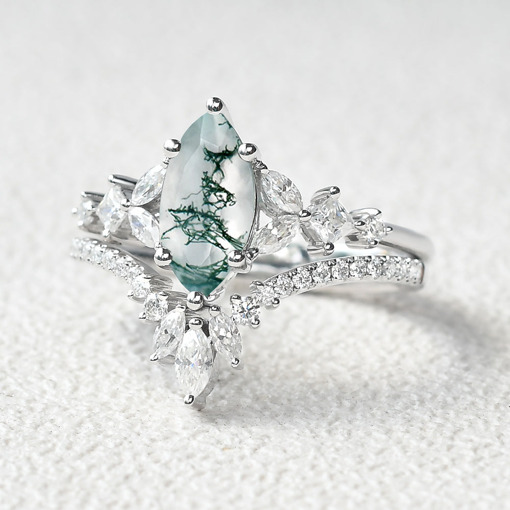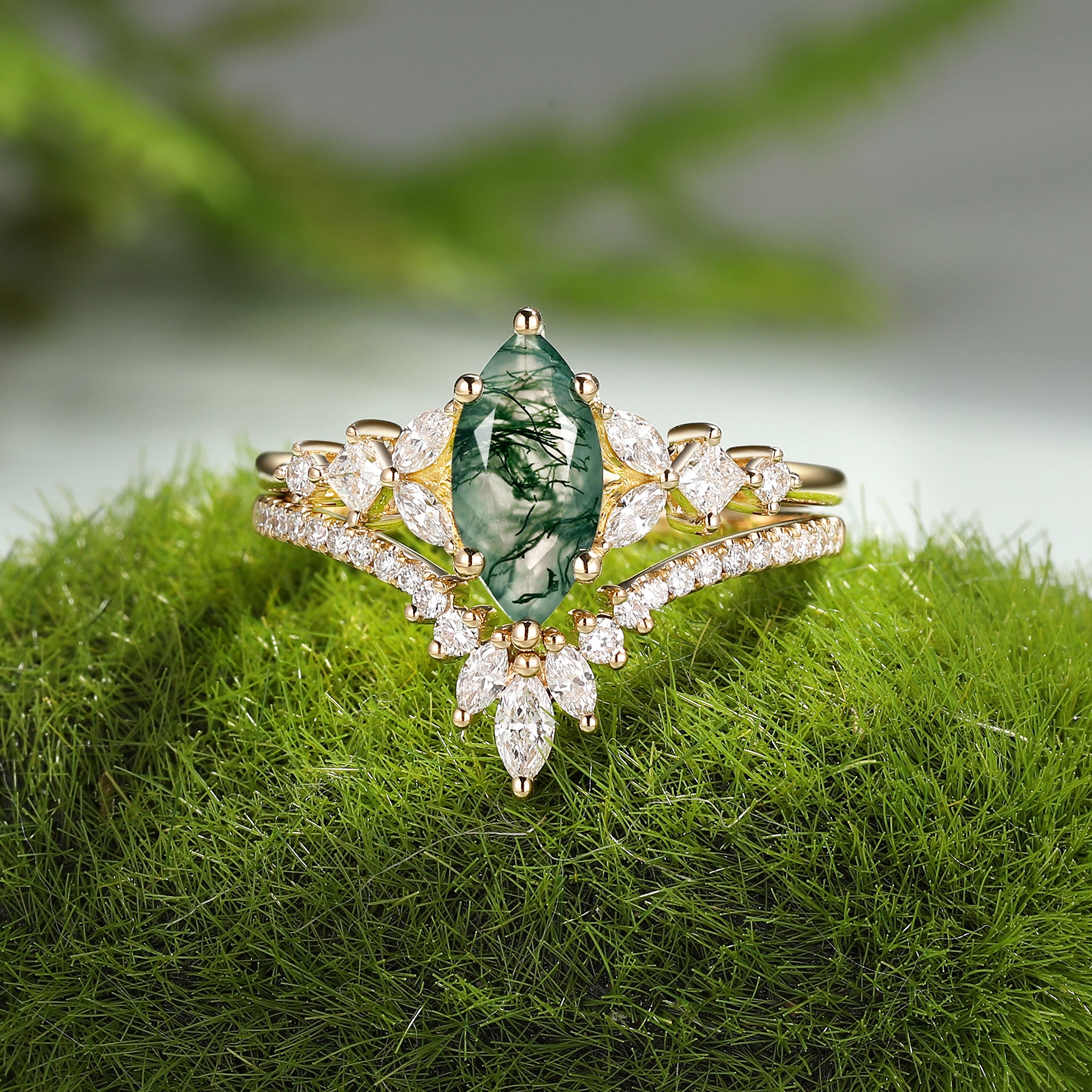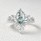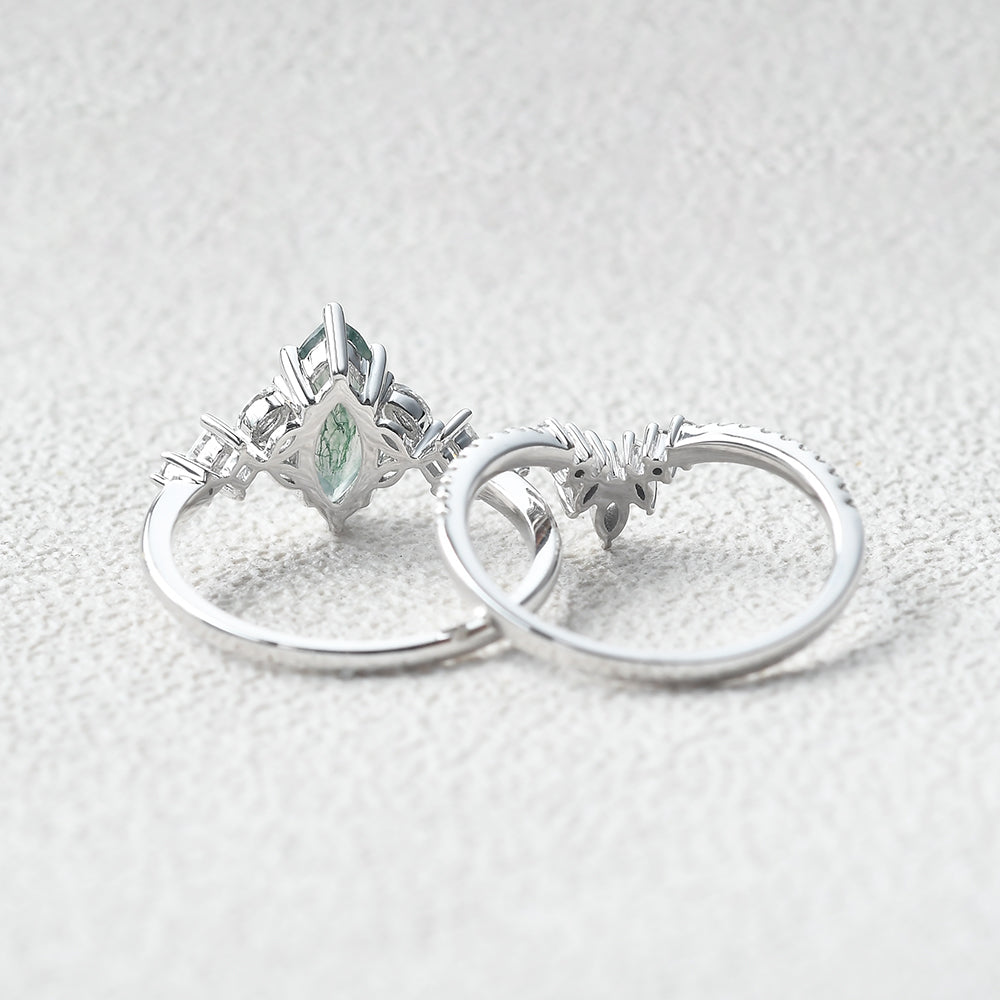 Marquise Cut Moss Agate Cluster Engagement Ring Set 2pcs - Lumenis