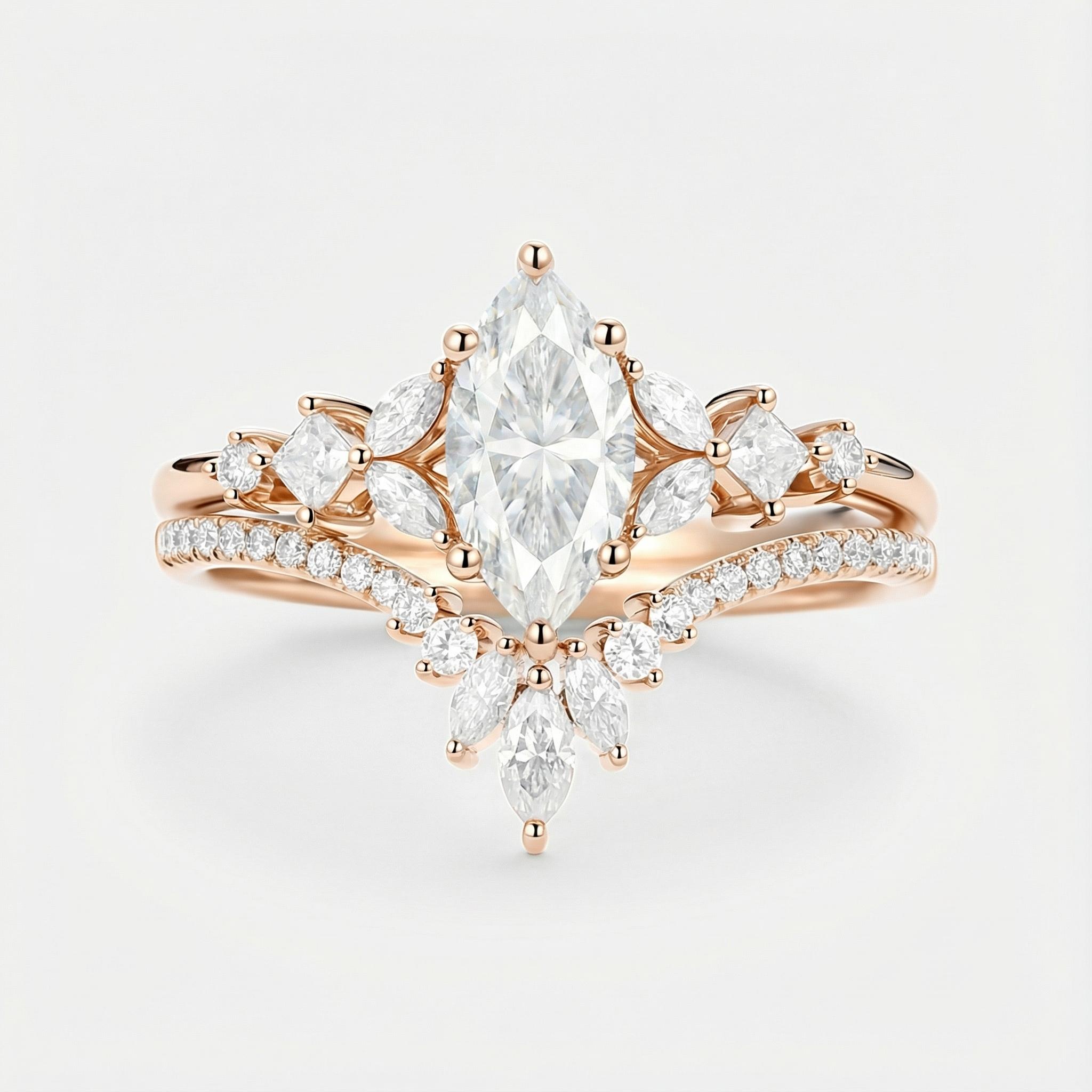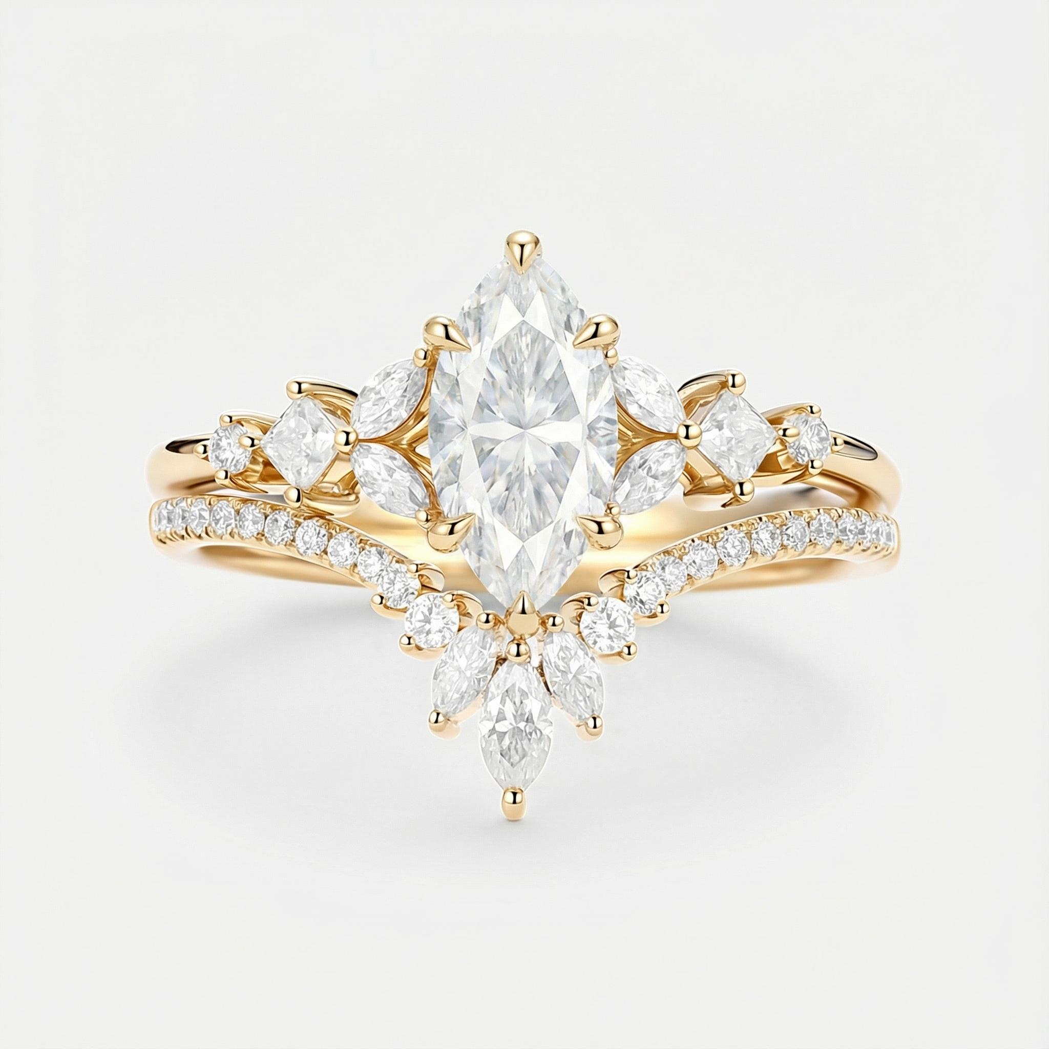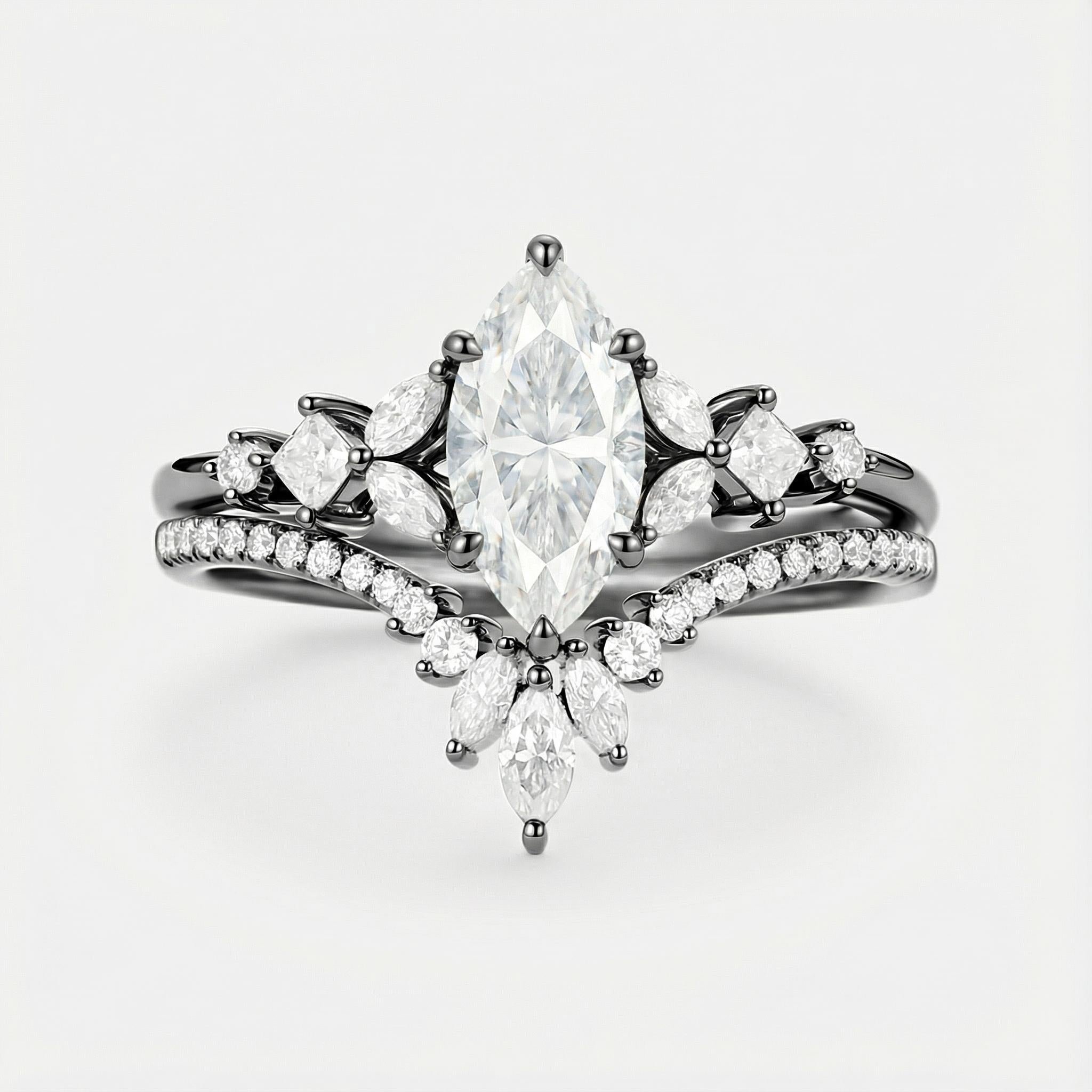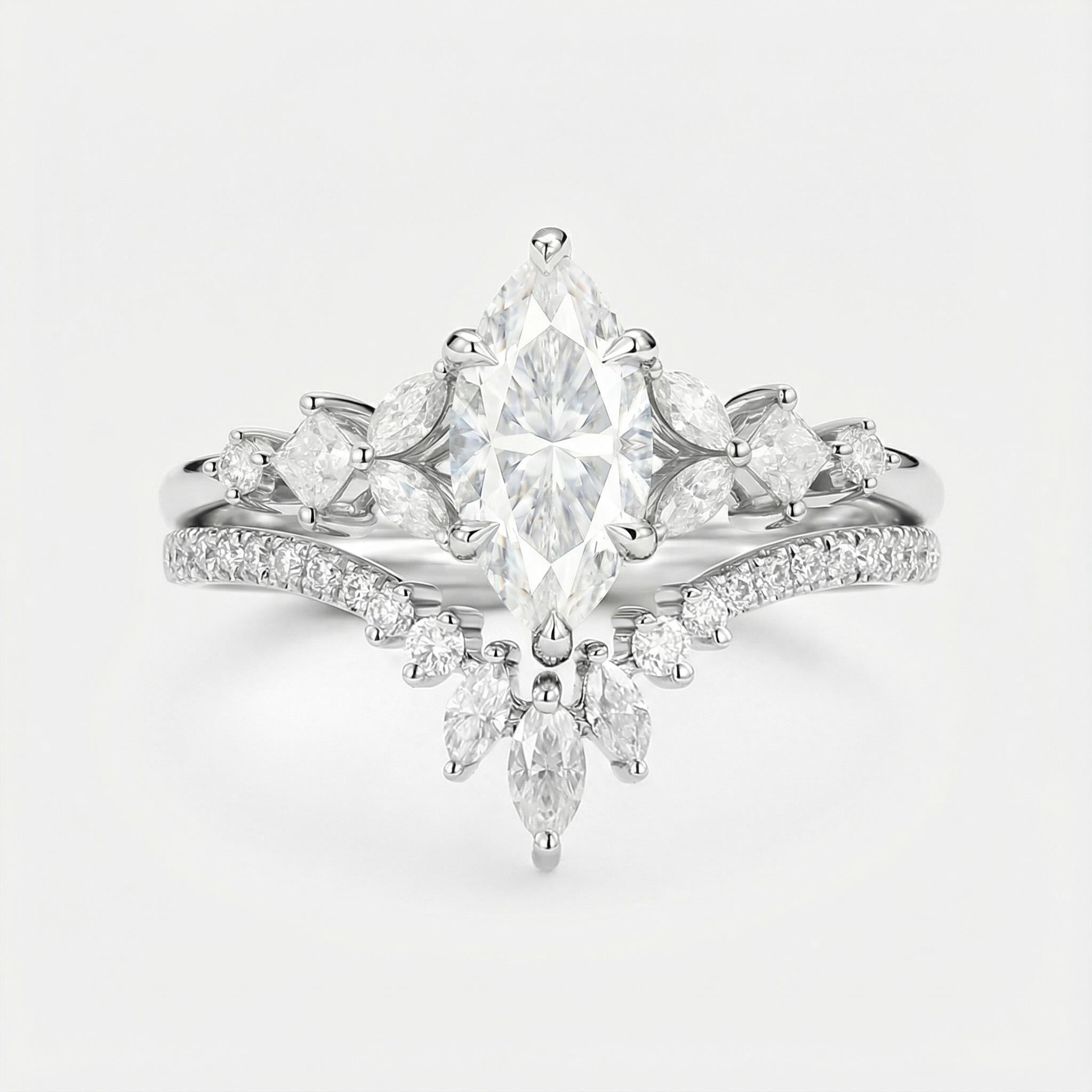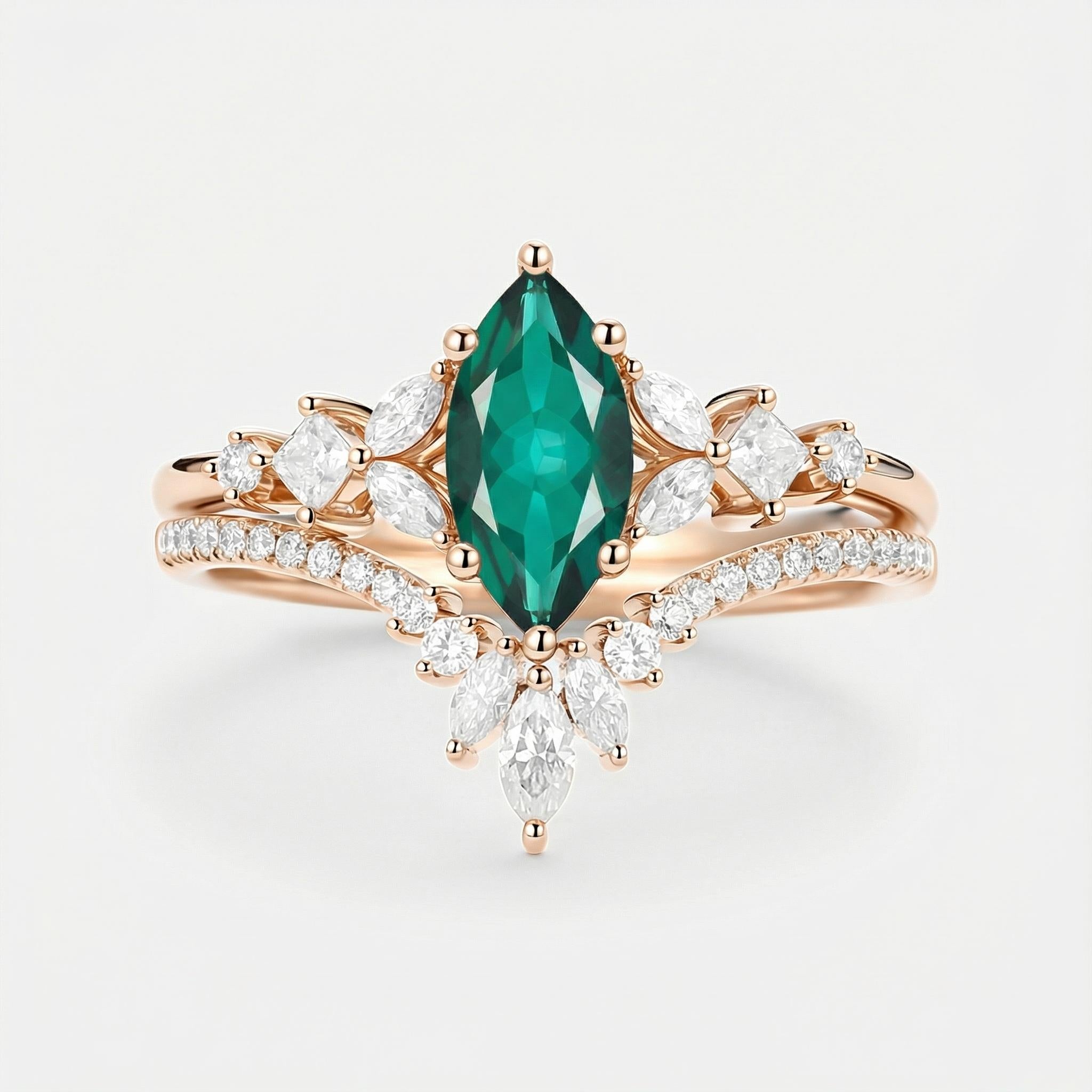 Marquise Cut Moss Agate Cluster Engagement Ring Set 2pcs - Lumenis