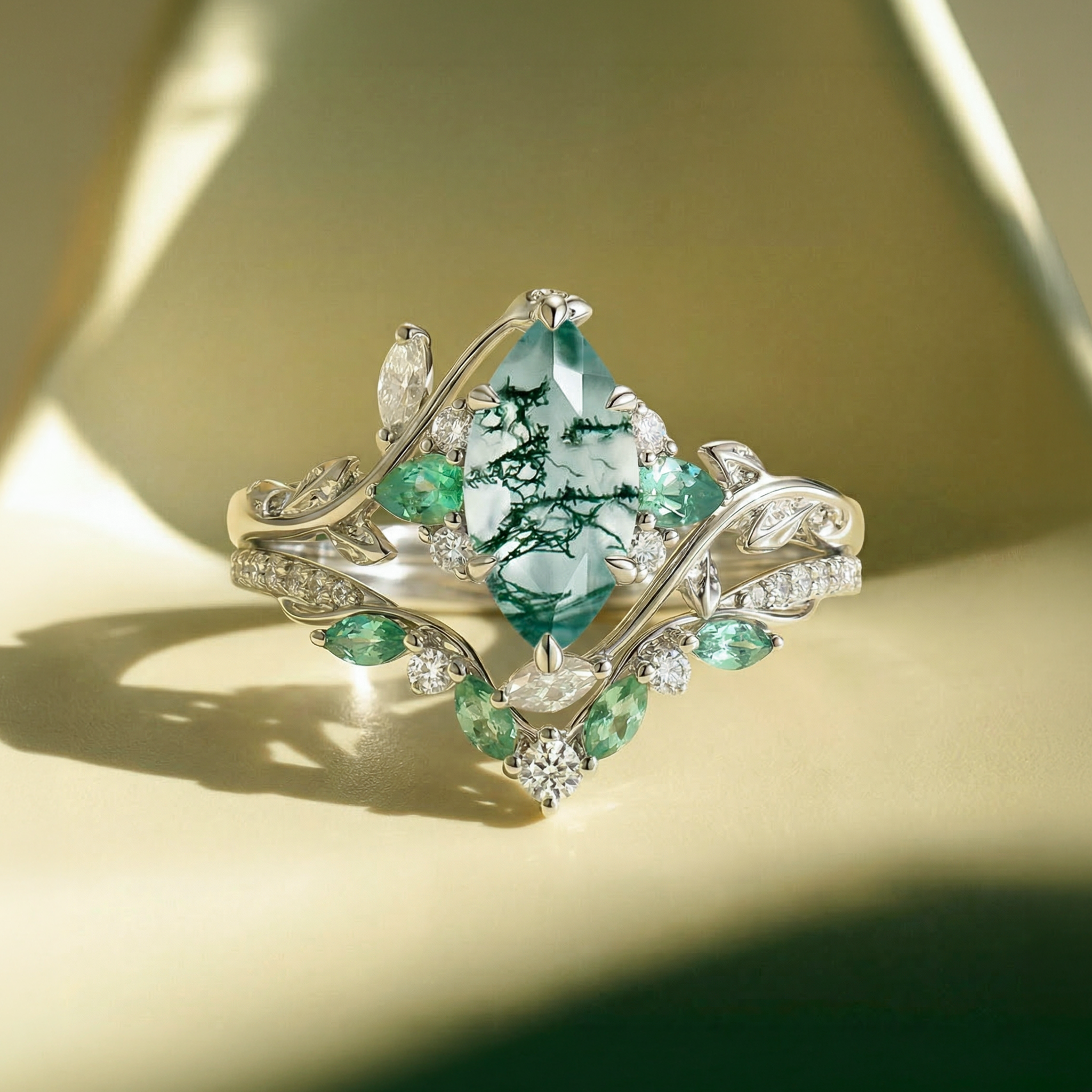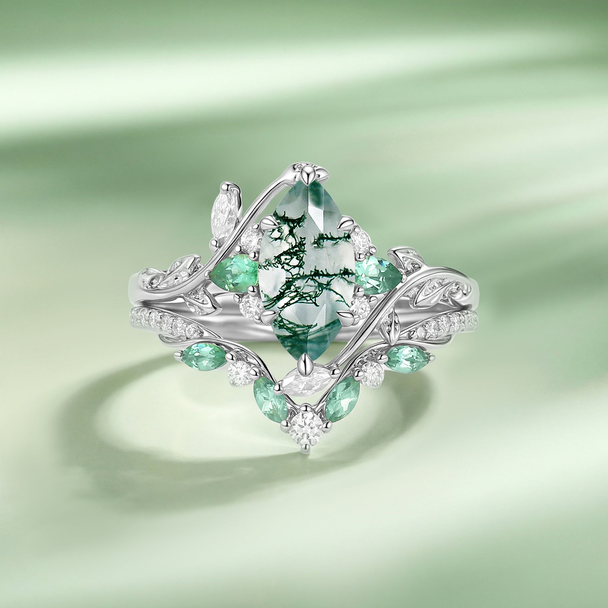 Marquise Cut Moss Agate Vine Engagement Ring Set 2pcs - Lime
