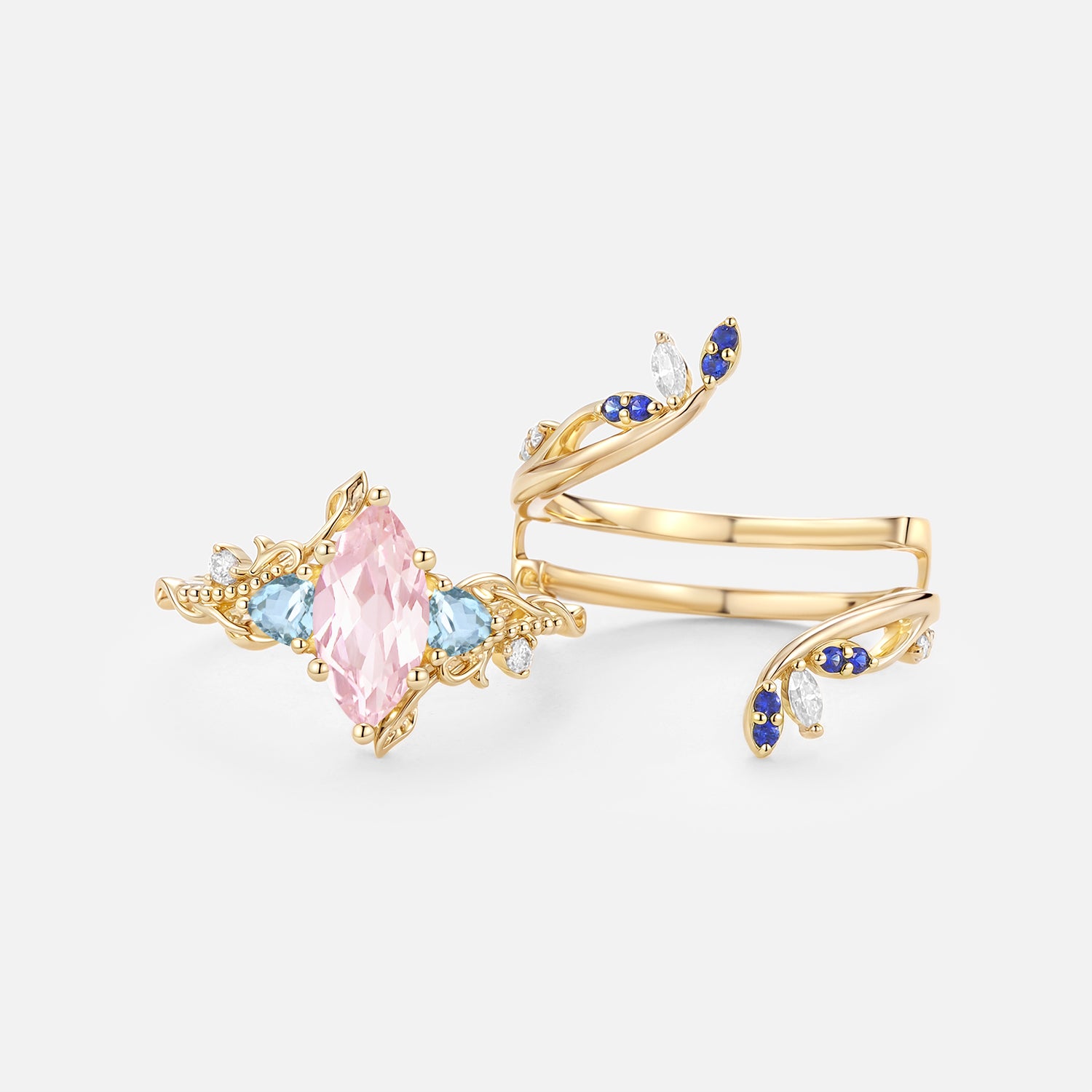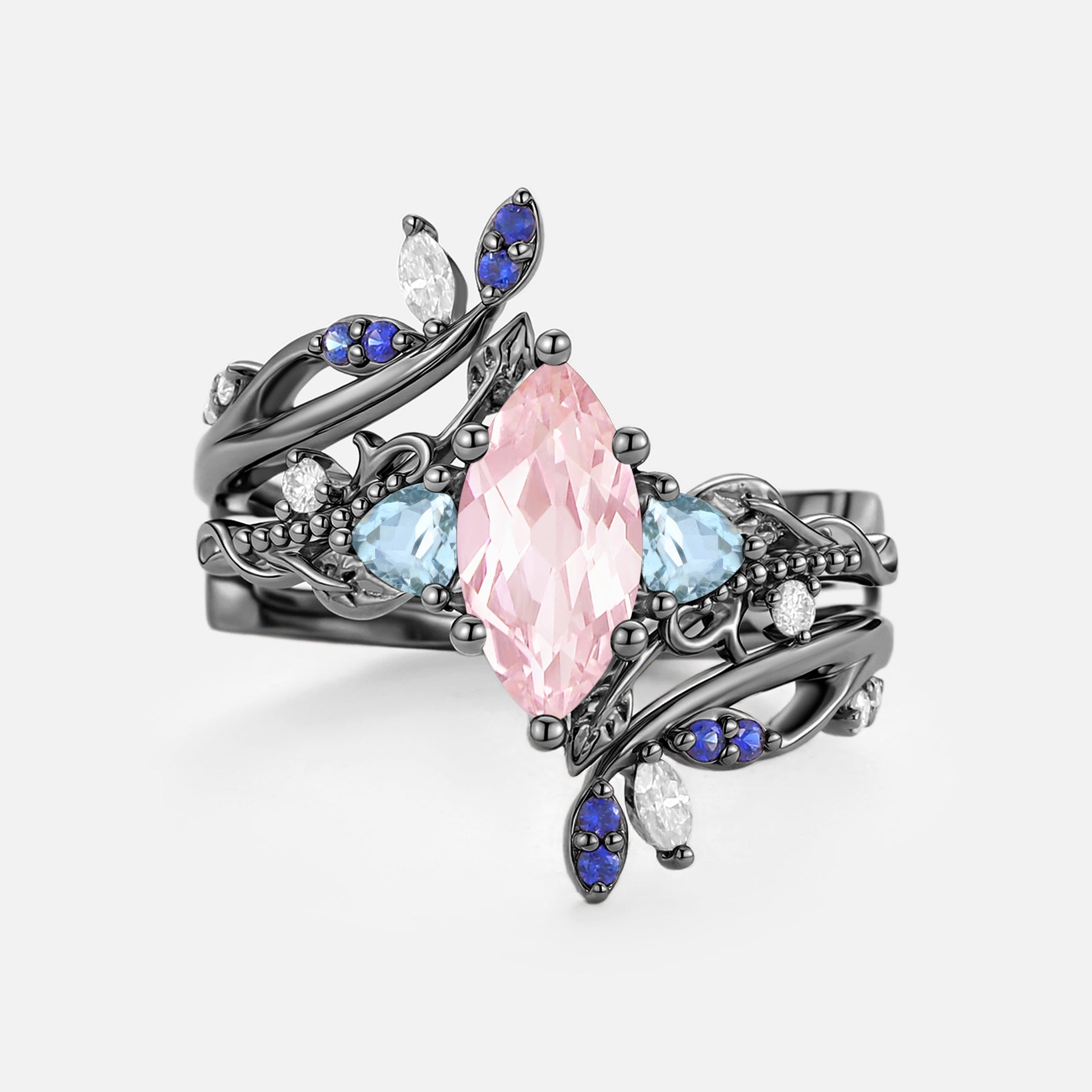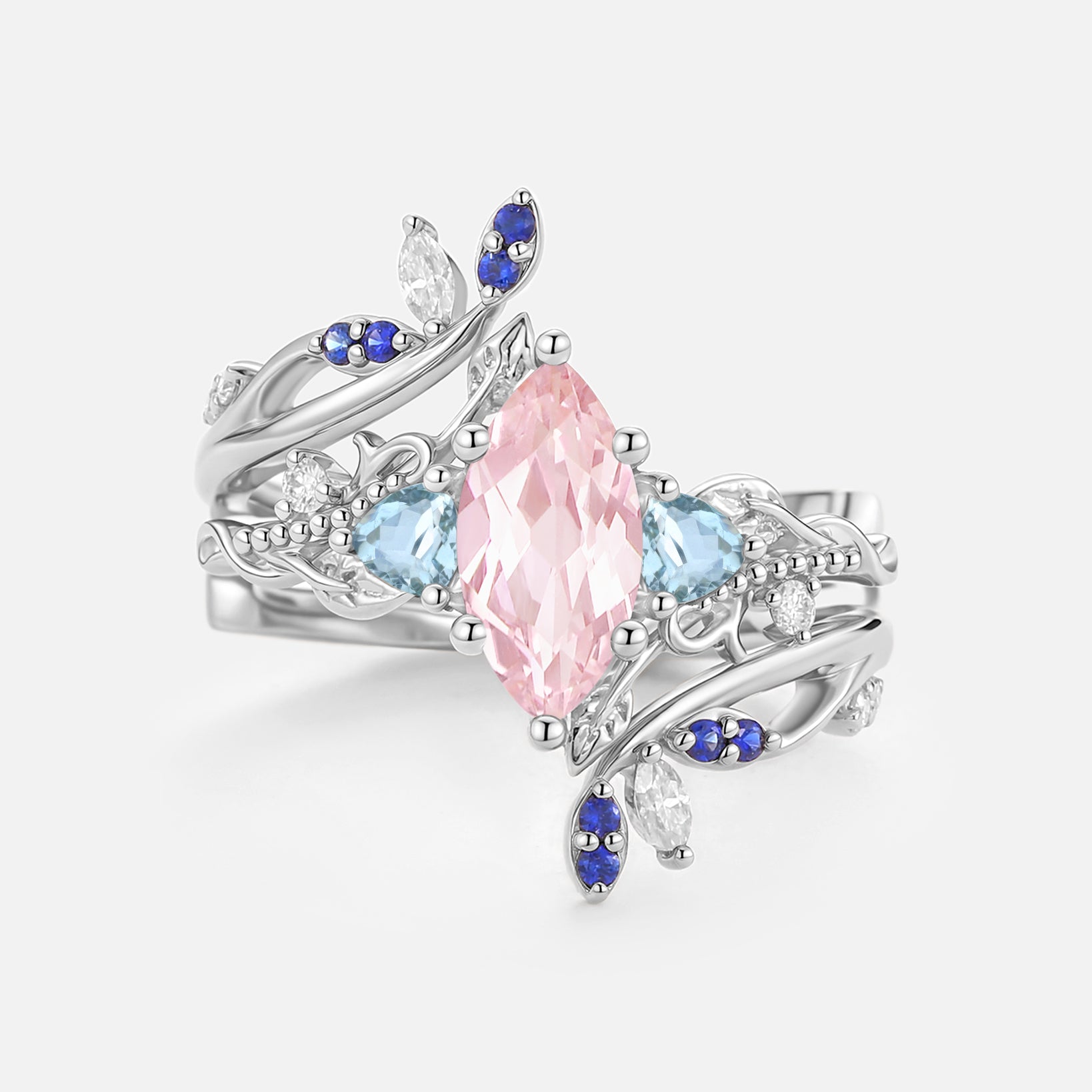Marquise Lab Pink Sapphire Leafy Engagement Ring Sets 2pcs - Thistle