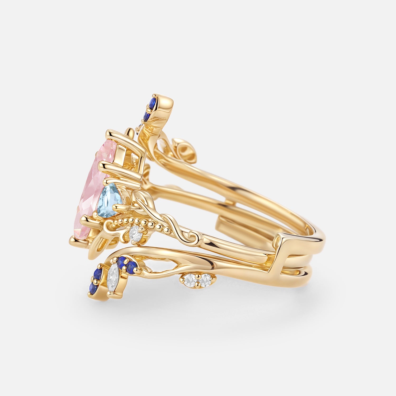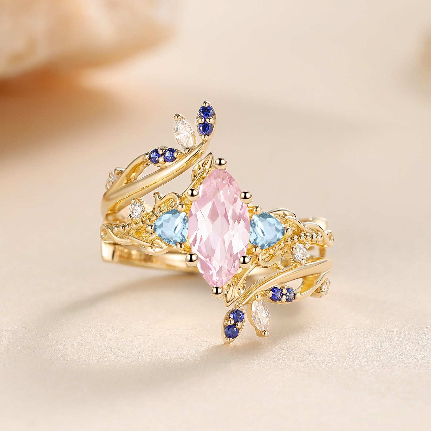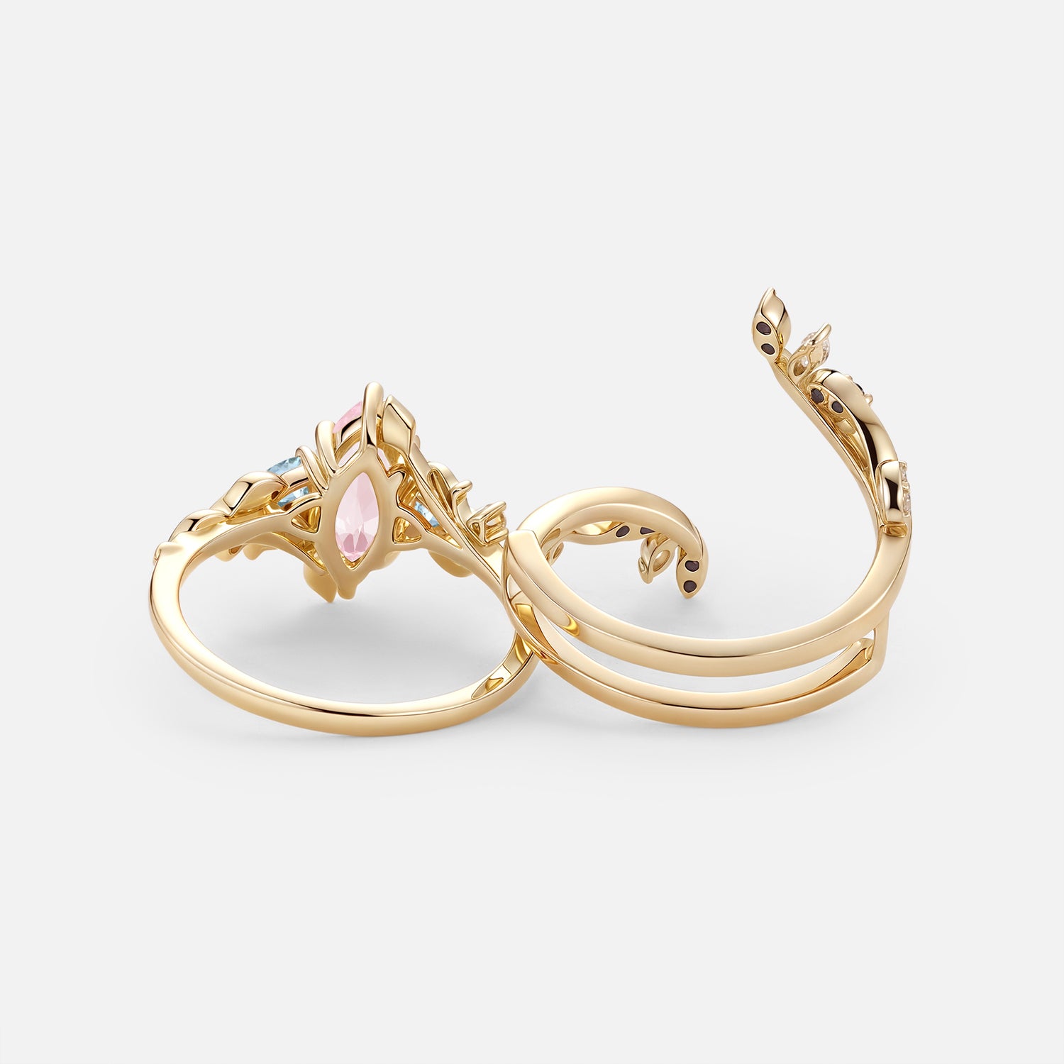 Marquise Lab Pink Sapphire Leafy Engagement Ring Sets 2pcs - Thistle