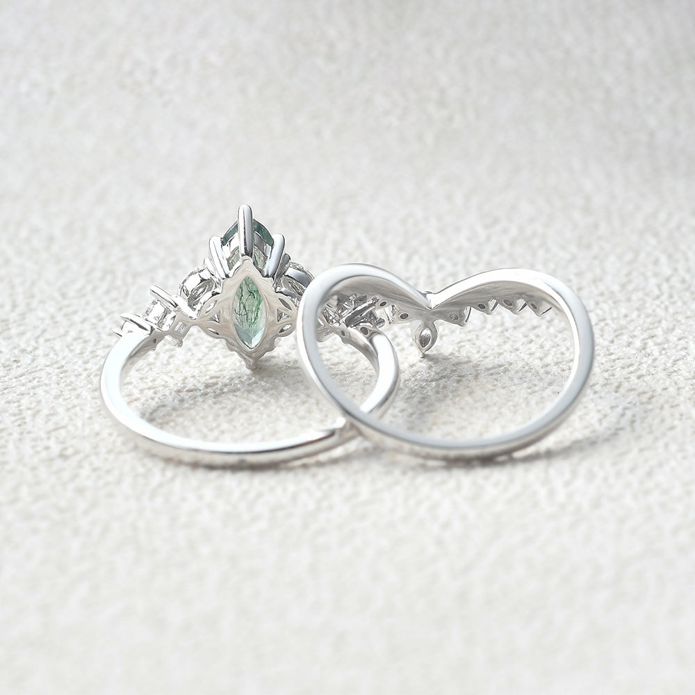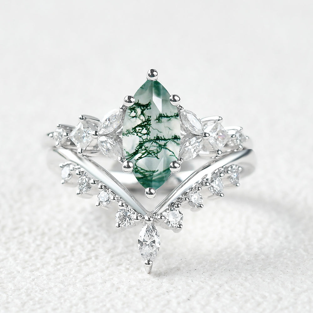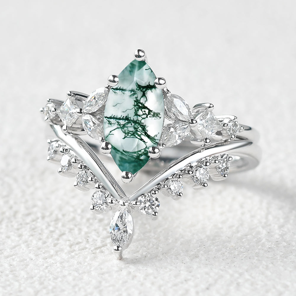 Marquise Moss Agate Cluster Ring Set 2pcs