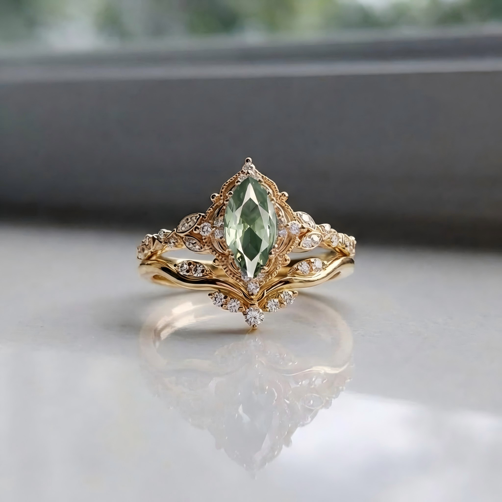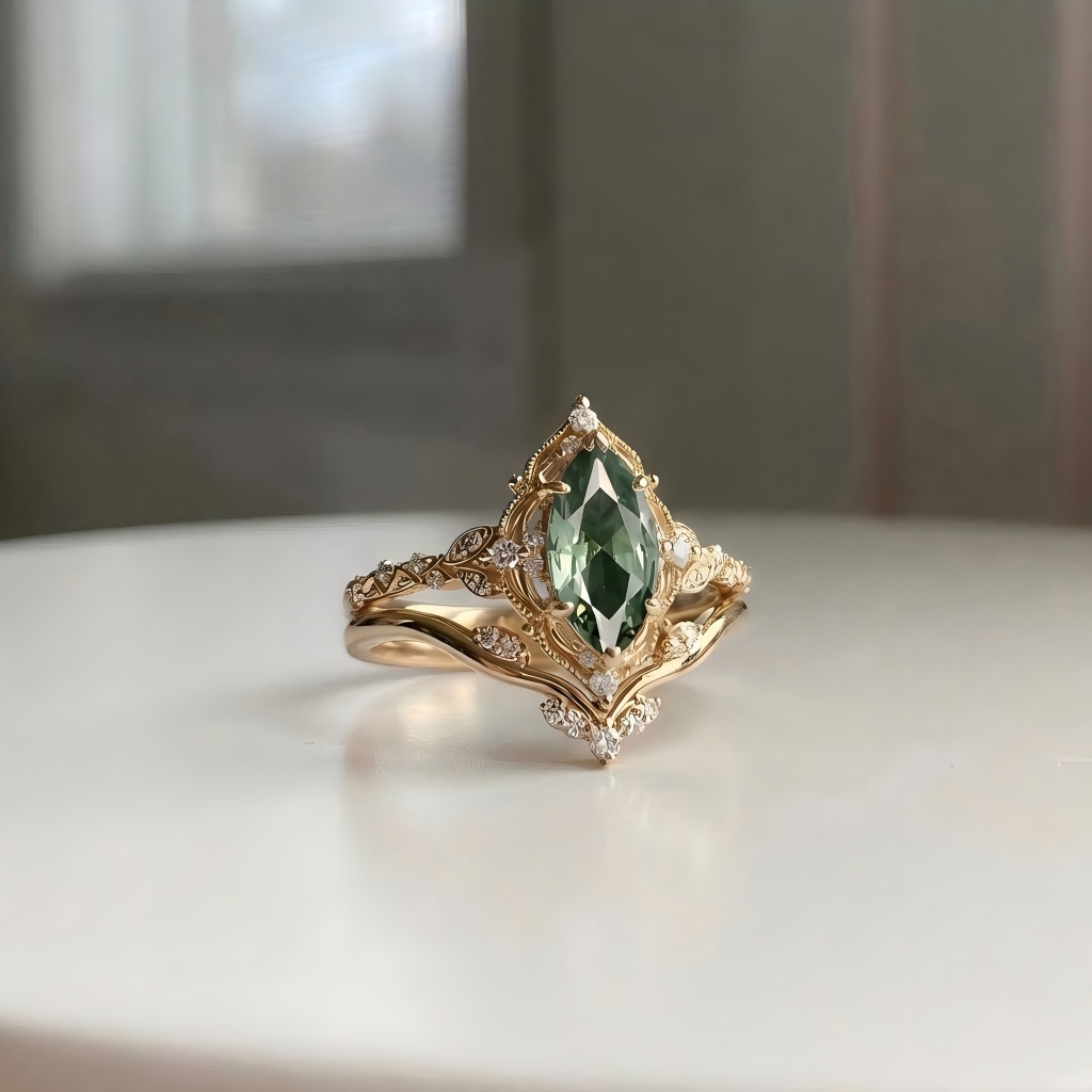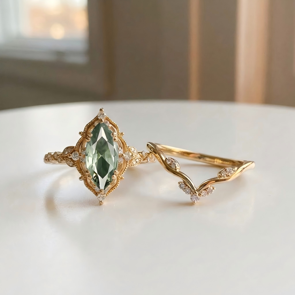 Marquise Vintage Lab Green Sapphire Engagement Ring Sets 2pcs - Arundel