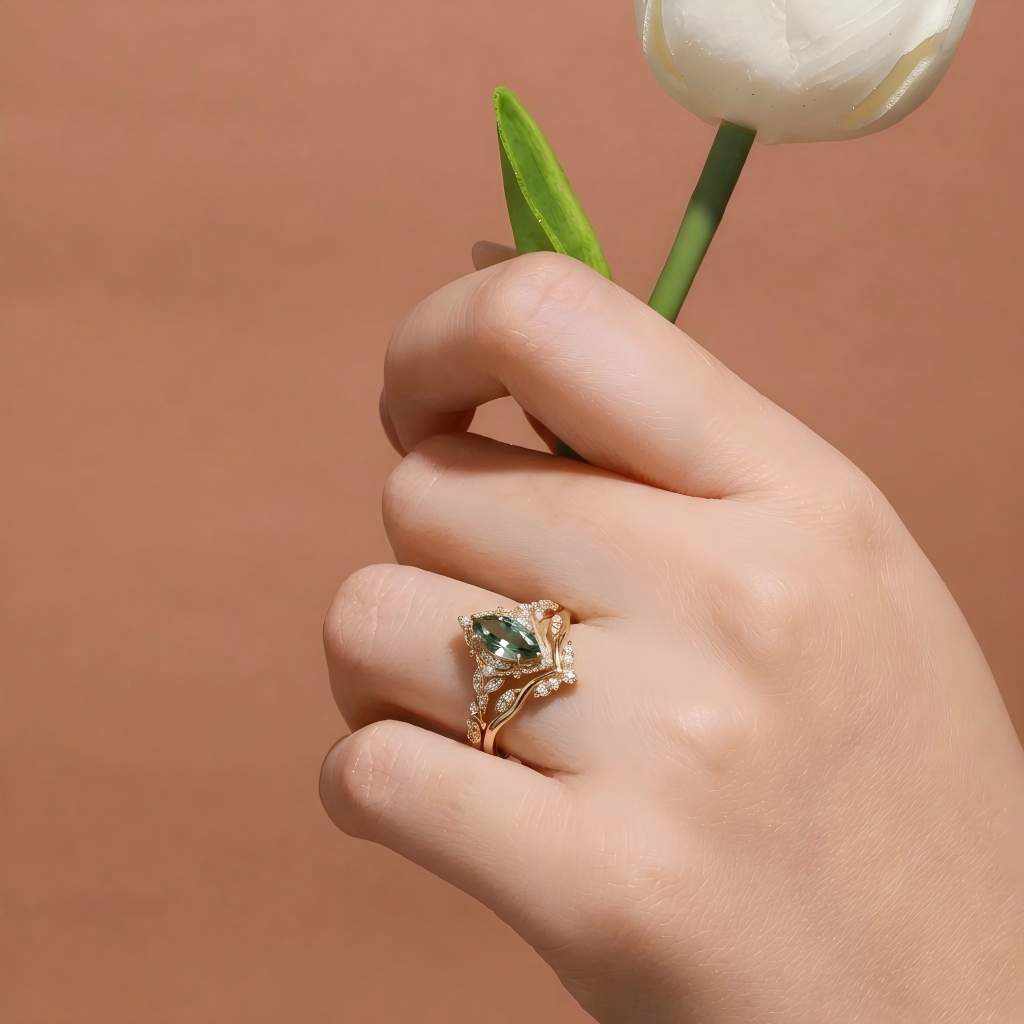 Embrace the timeless, sophisticated allure of the Arundel marquise engagement ring set. At its heart sits a striking marquise-cut lab green sapphire, its elongated, graceful shape catching the light with every movement for a bright, luminous glow that feels both bold and refined. Securely held by elegant, slender prongs that maximize the stone’s beauty, this center gem is paired with two perfectly coordinated bands designed for seamless stacking and everyday wear.