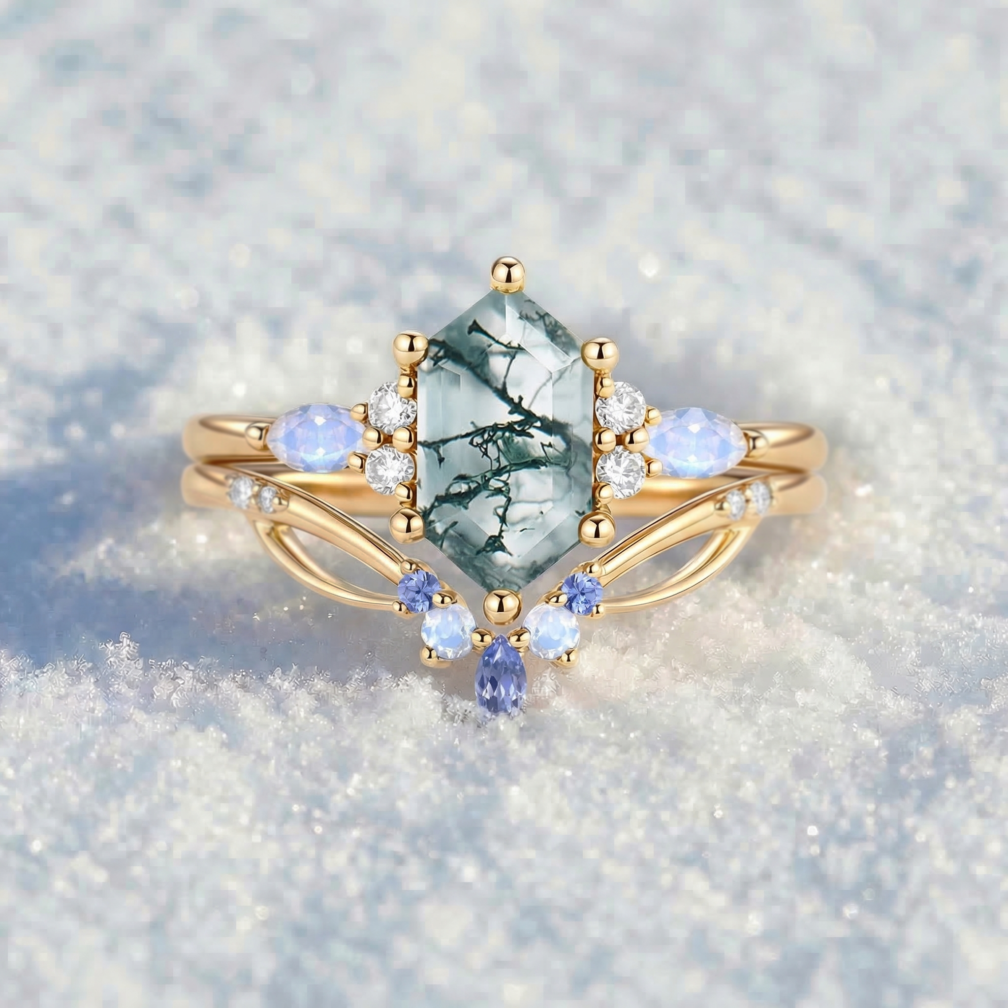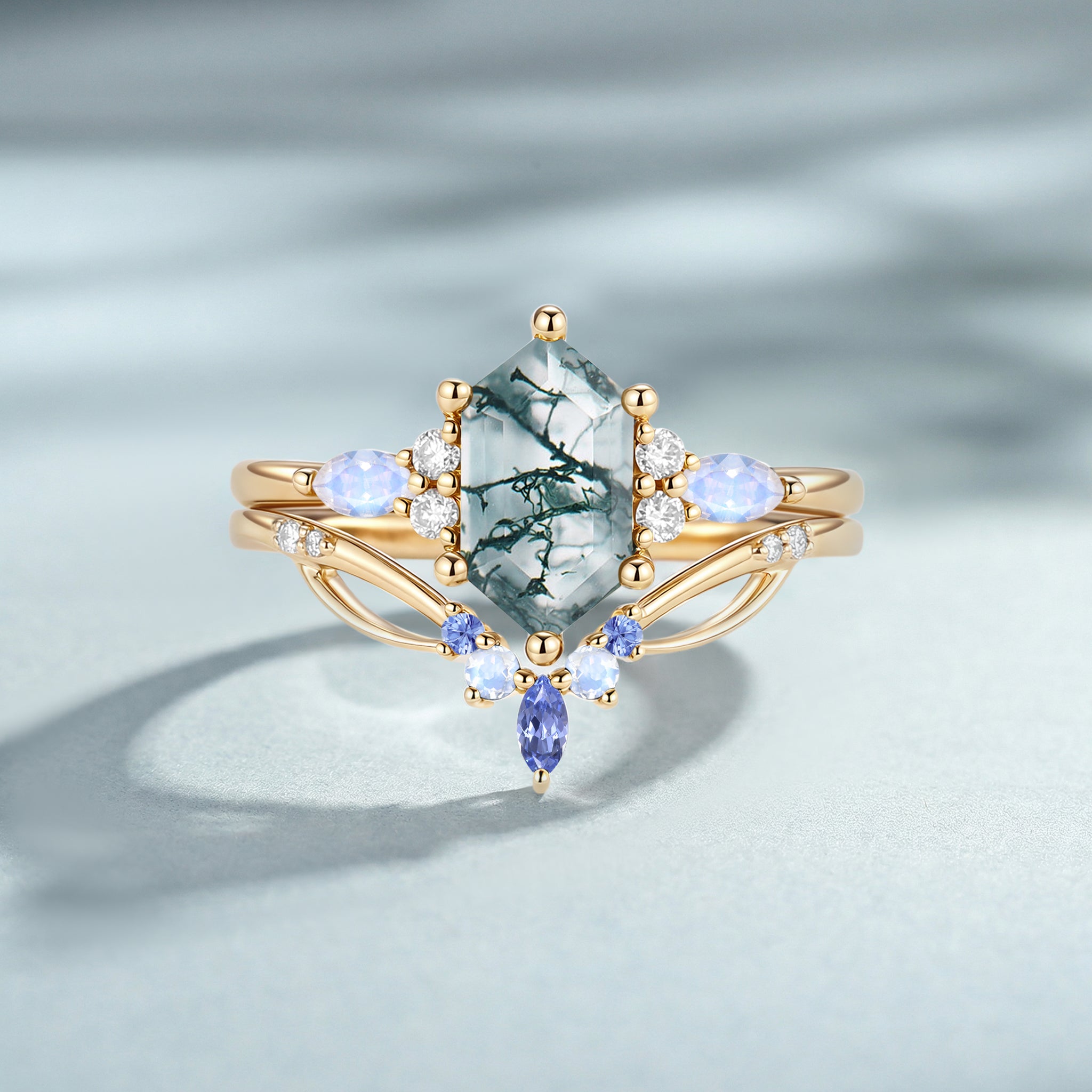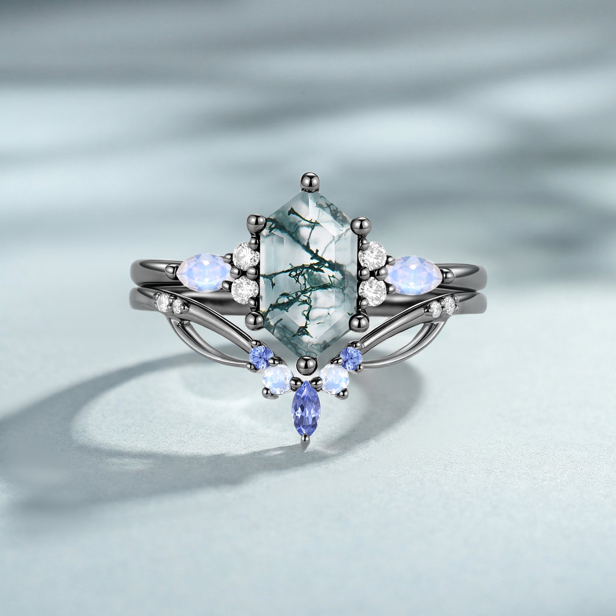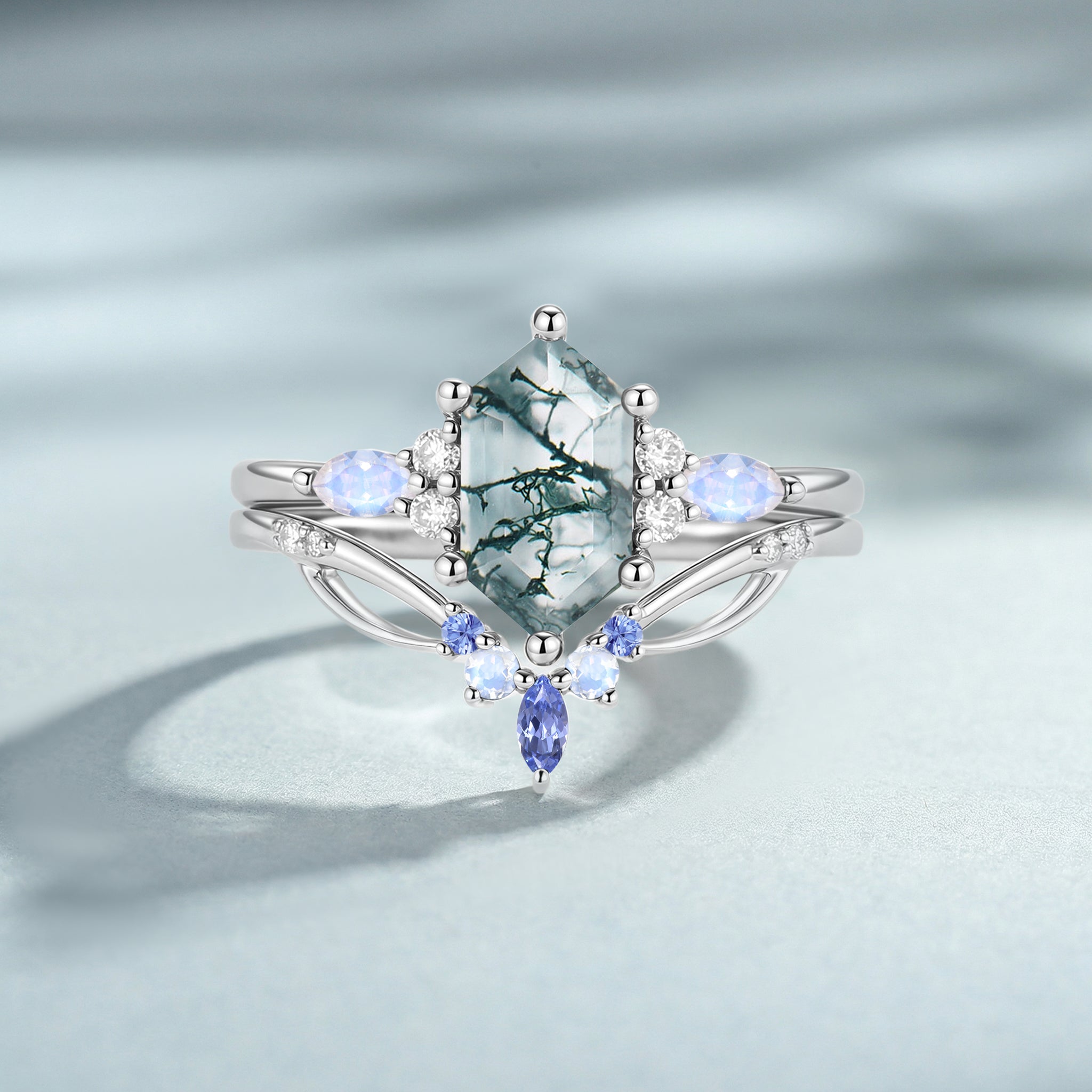 Moss Agate Long Hexagon Vintage Vine Engagement Ring Set 2pcs - Nyssa