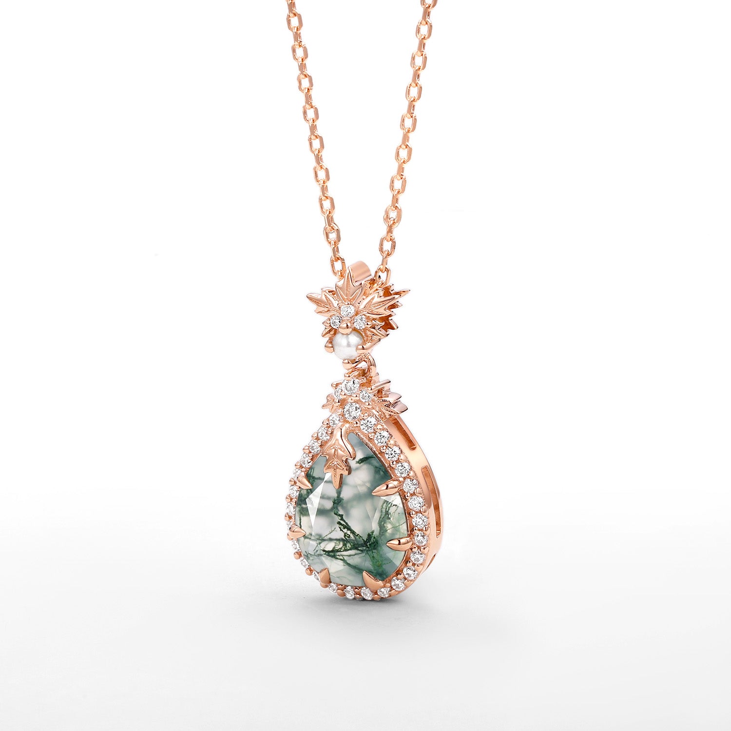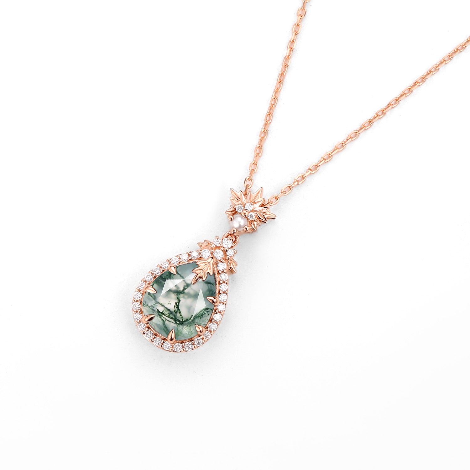 Natural Inspired Moss Agate Pear Halo Necklace - Tara