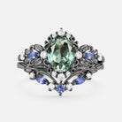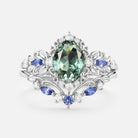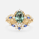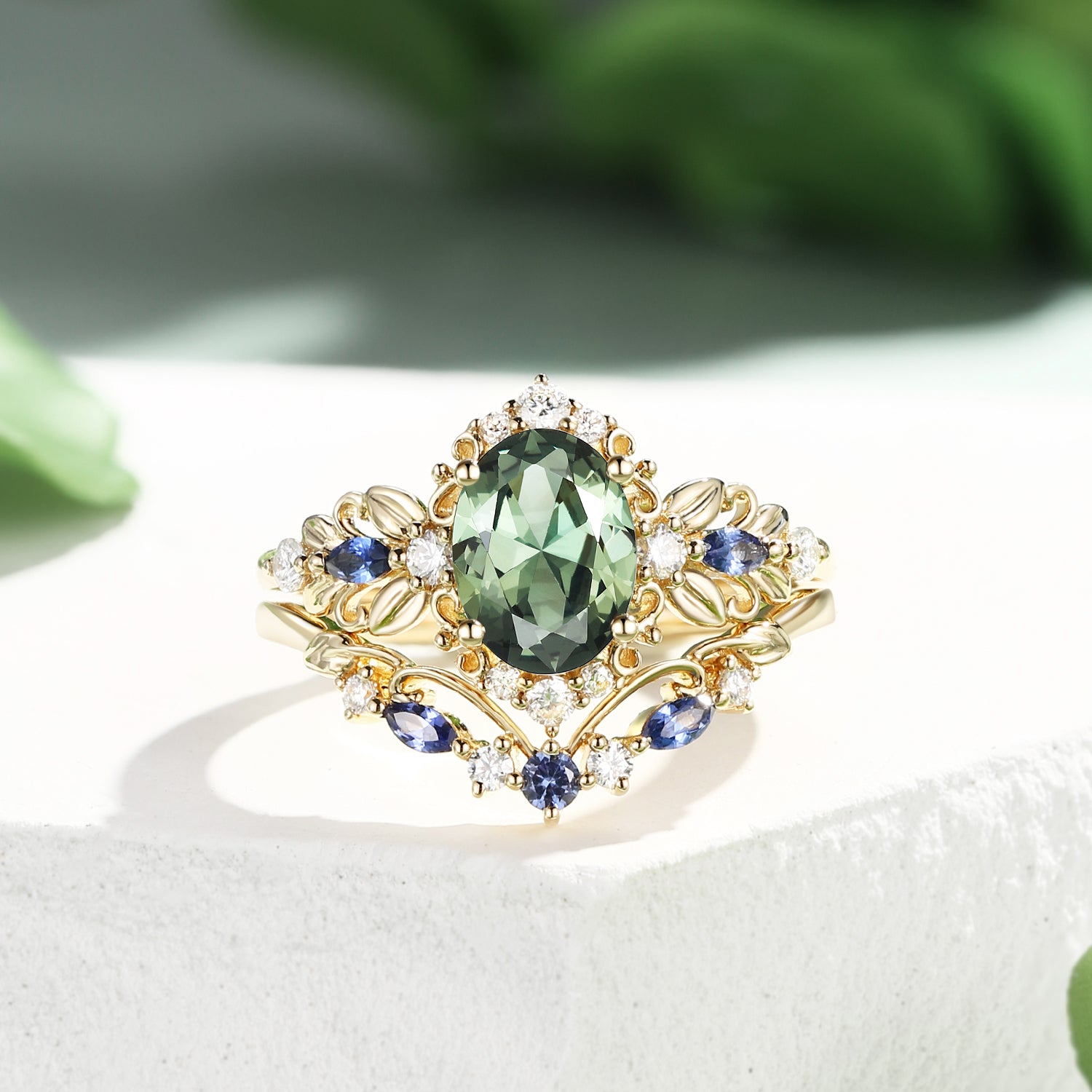 Oval Cut Leafy Lab Green Sapphire Engagement Ring Set 2pcs - Viriditas
